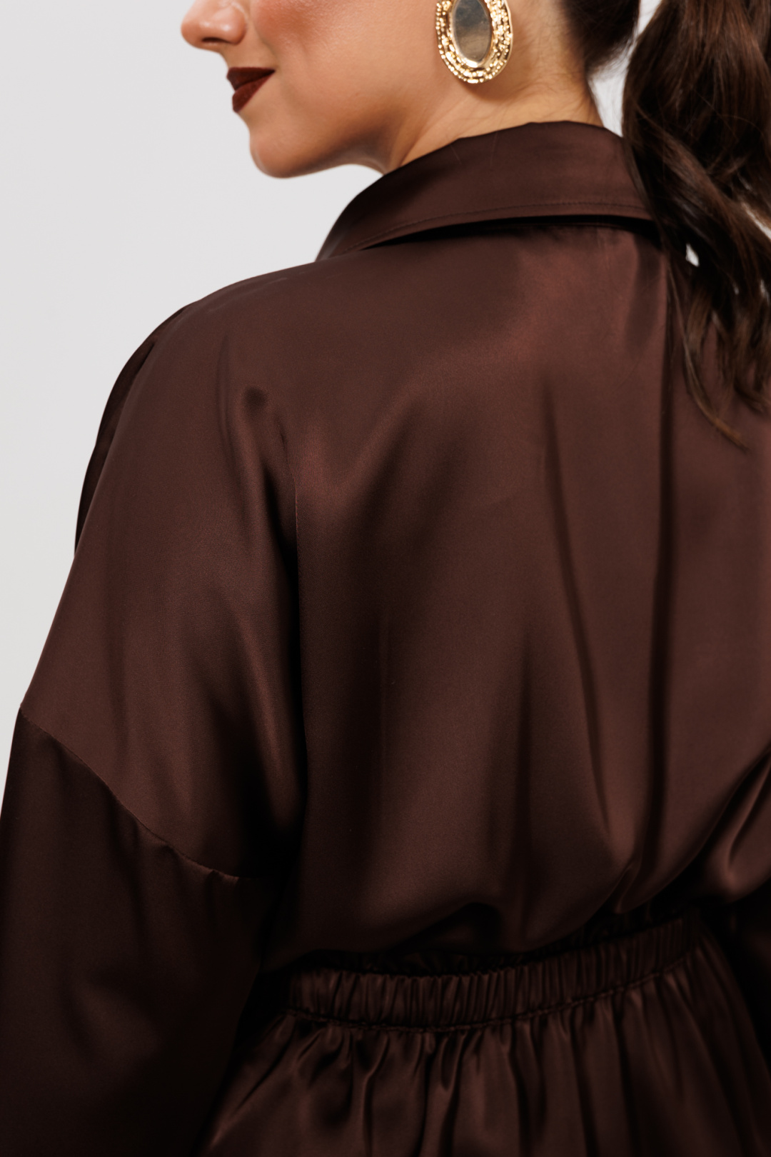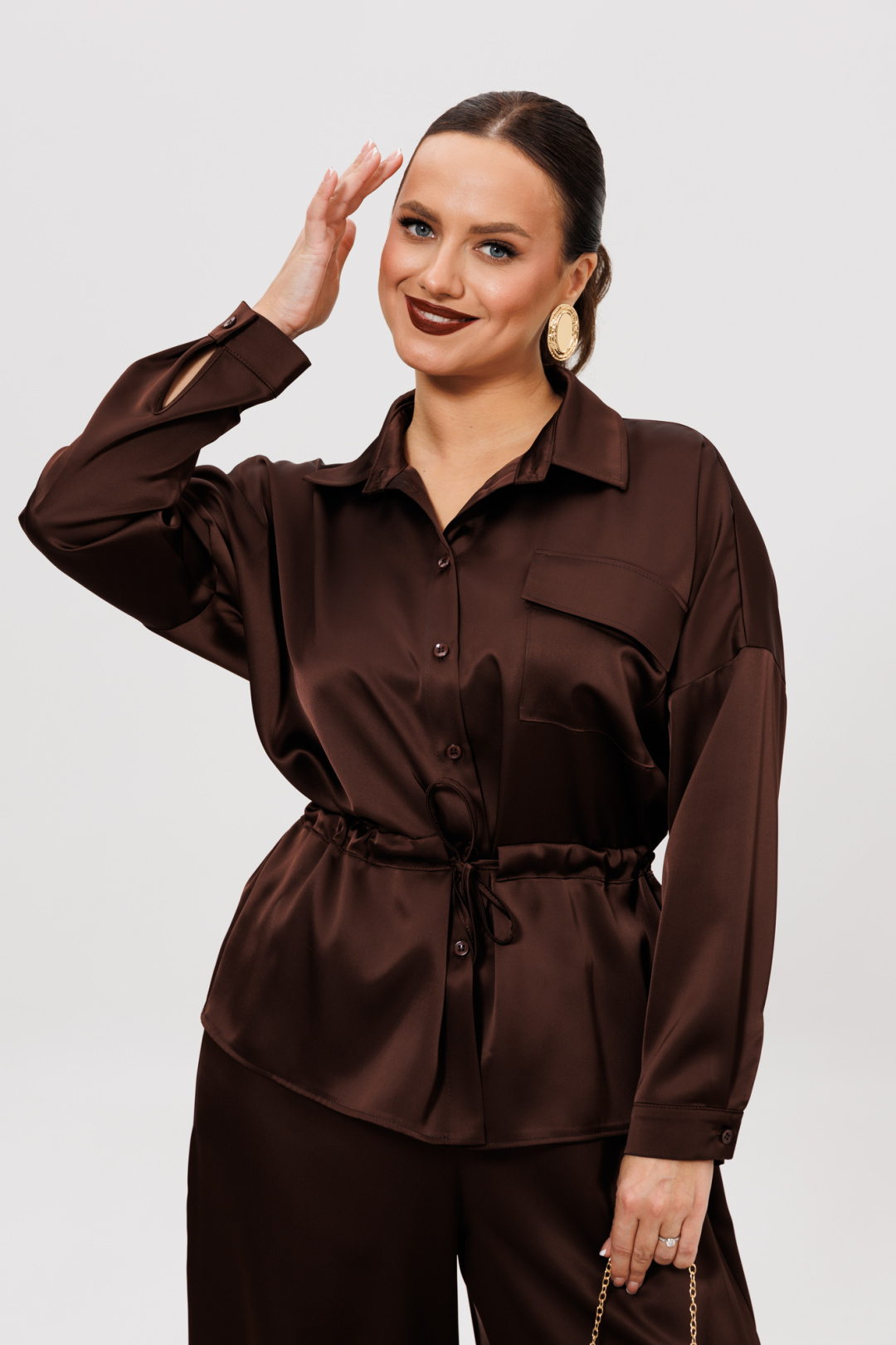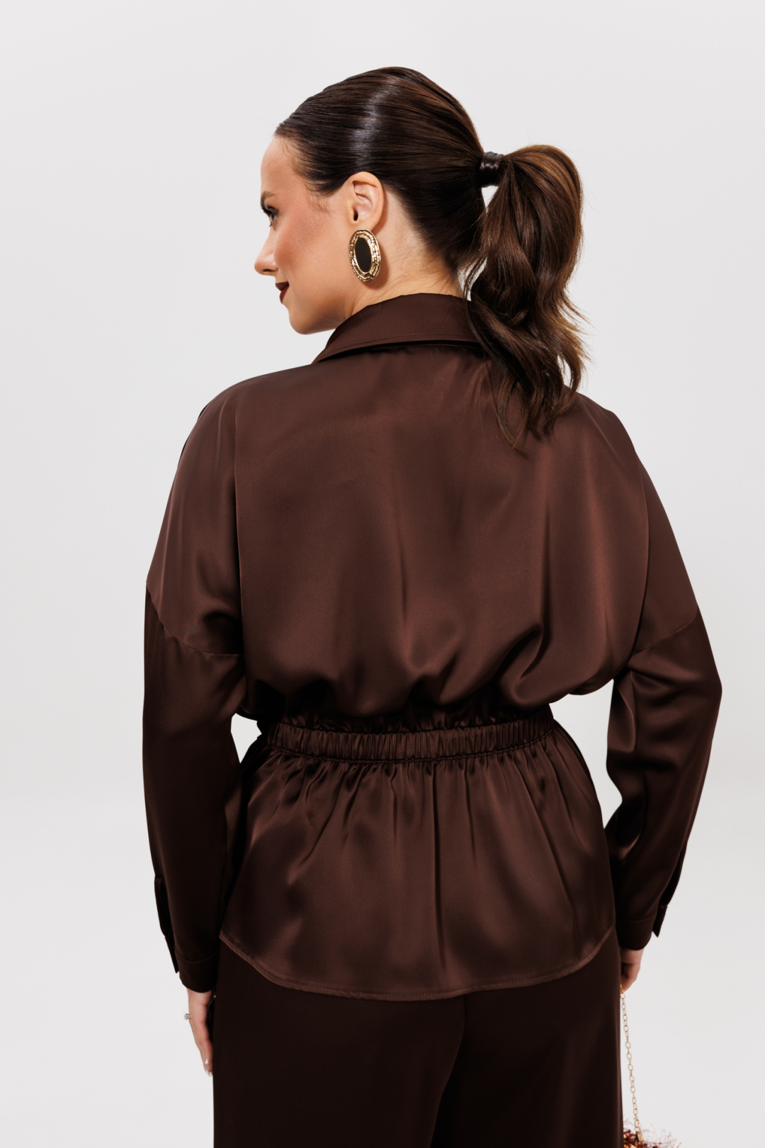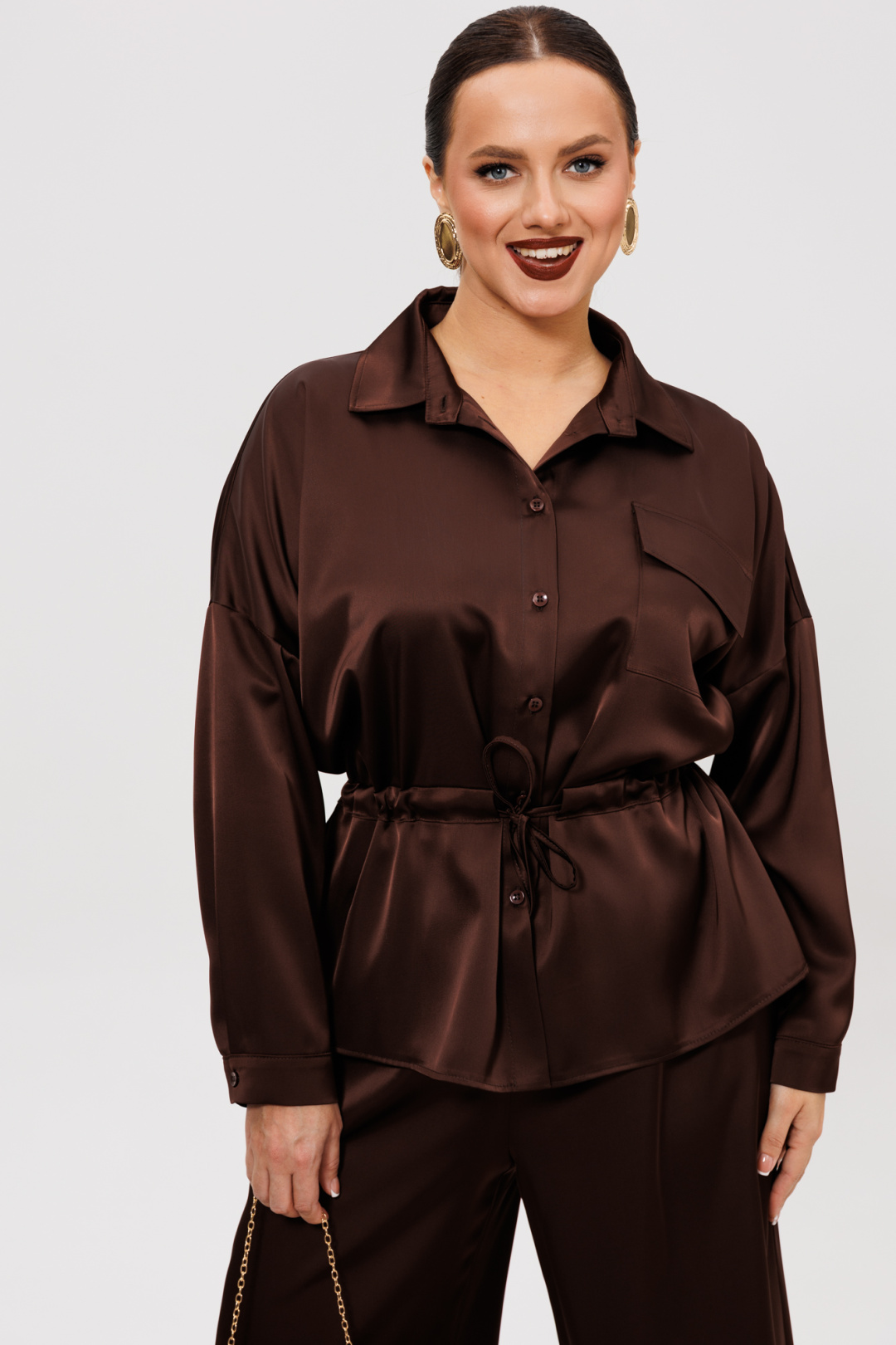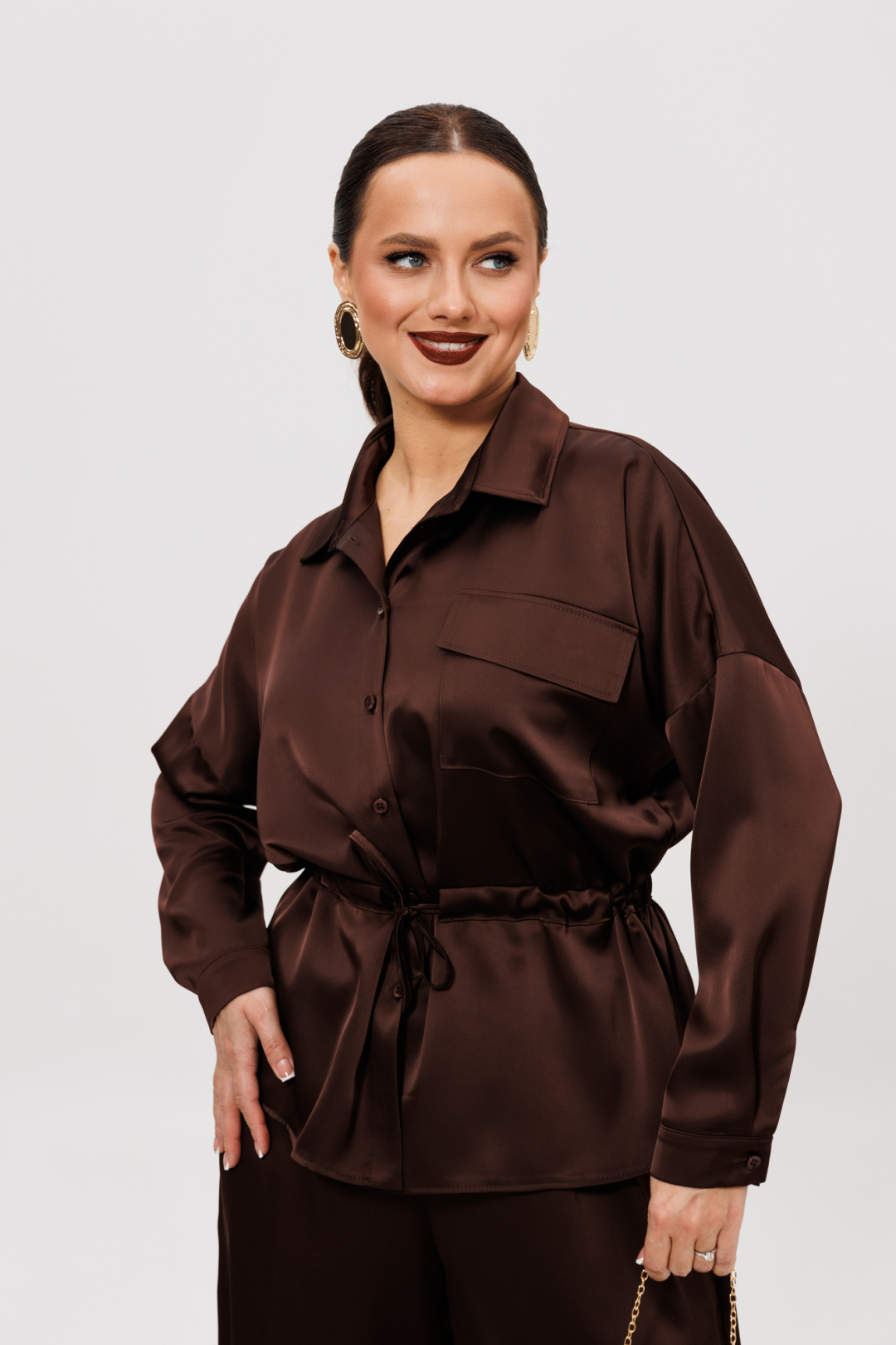 Блуза прямого силуэта со спущенной линией плеча. По переду накладной карман с клапаном (по правой части переда), центральная застежка на петли-пуговицы, настрочные кулисы со шнуром. Спинка цельная с настрочной кулисой, присборенная резинкой. Горловина оформлена воротником рубашечного типа со стойкой. Рукава одношовные с притачной манжетой, застегивающейся на пуговицы.