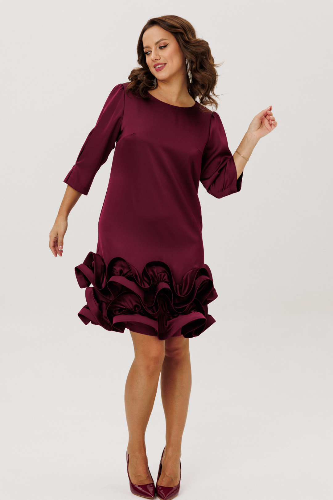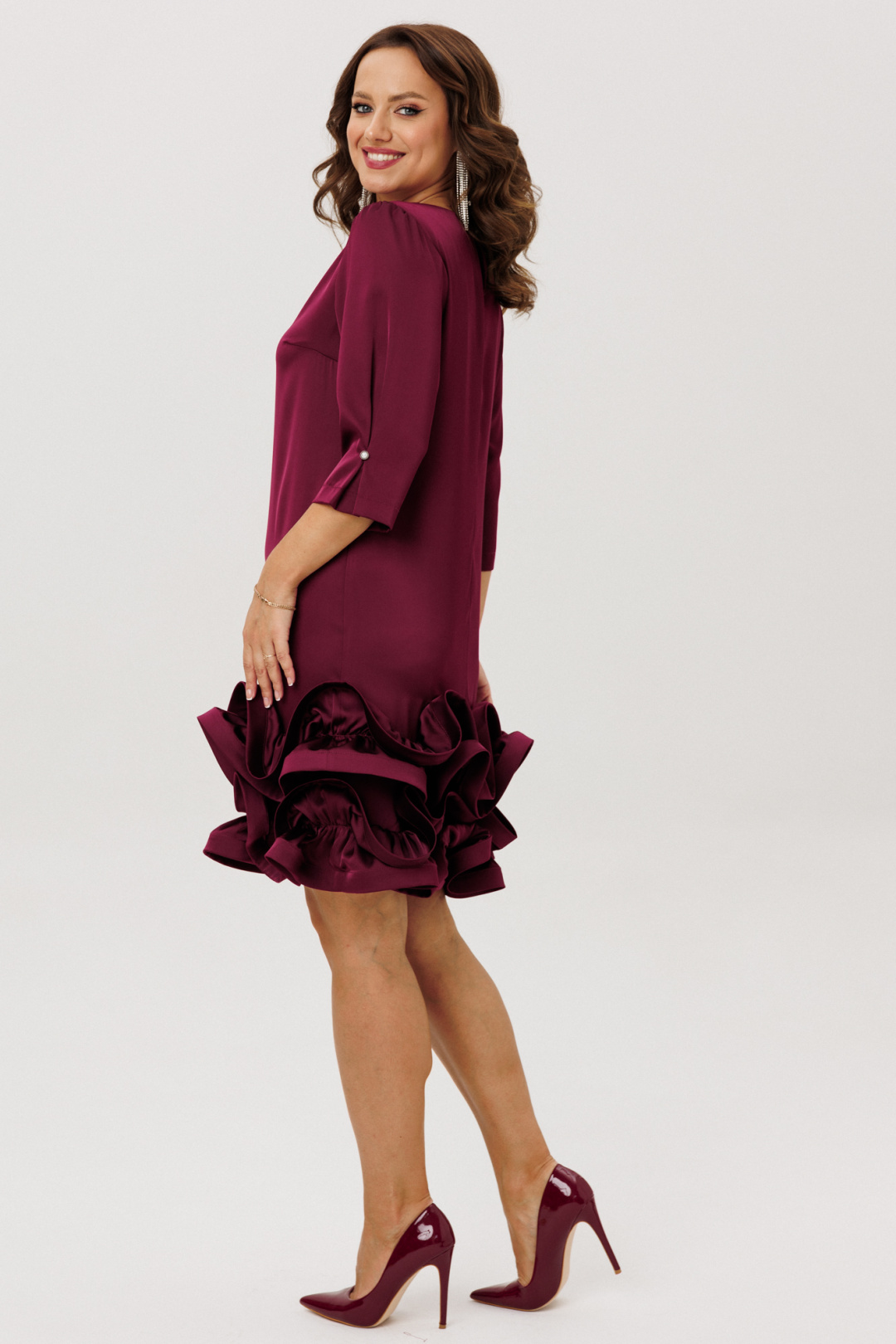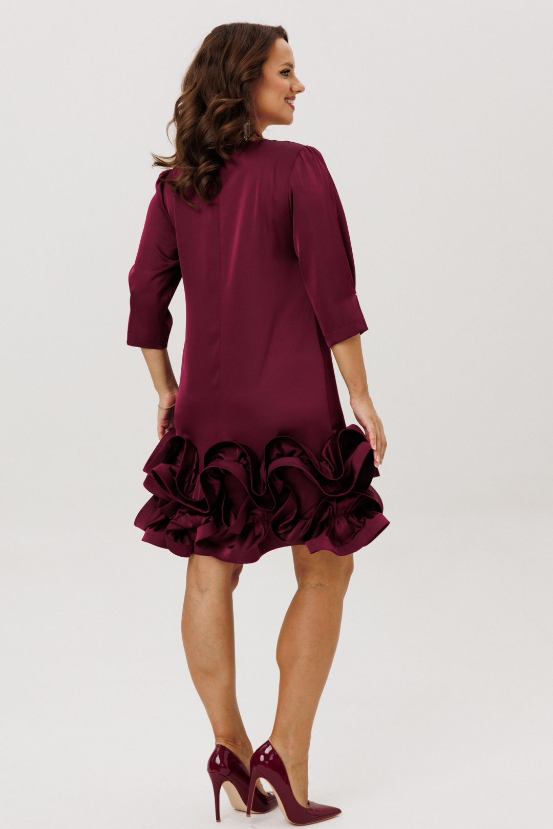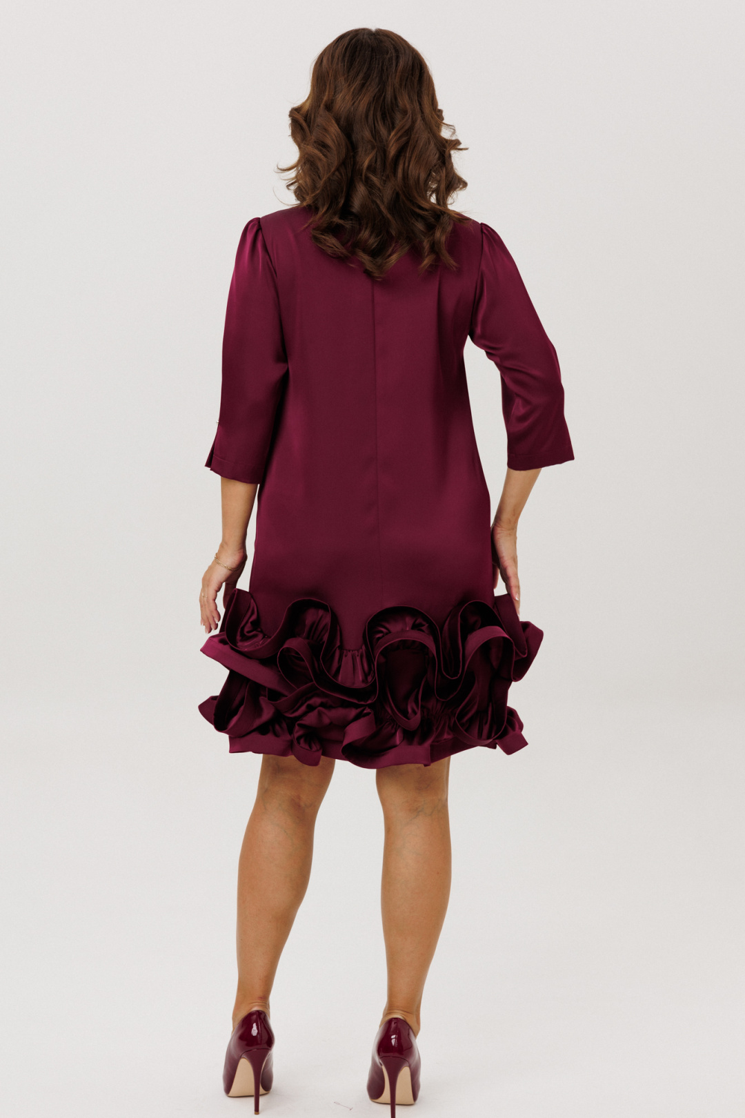 Нарядное платье полуприлегающего силуэта, выполненное из струящегося шелка «Армани» (немного тянется), без подкладки. По переду нагрудные вытачки. По спинке средний шов с застежкой на навесную петлю-пуговицу. Горловина округлой формы. Рукава втачные одношовные со сборкой по окату, встречной складкой и отделочной пуговицей по низу. Низ платья оформлен двумя присборенными воланами, края которых обработаны специальной тесьмой для придания формы изгибов воланам ( тесьма мягкая, подвижная).
