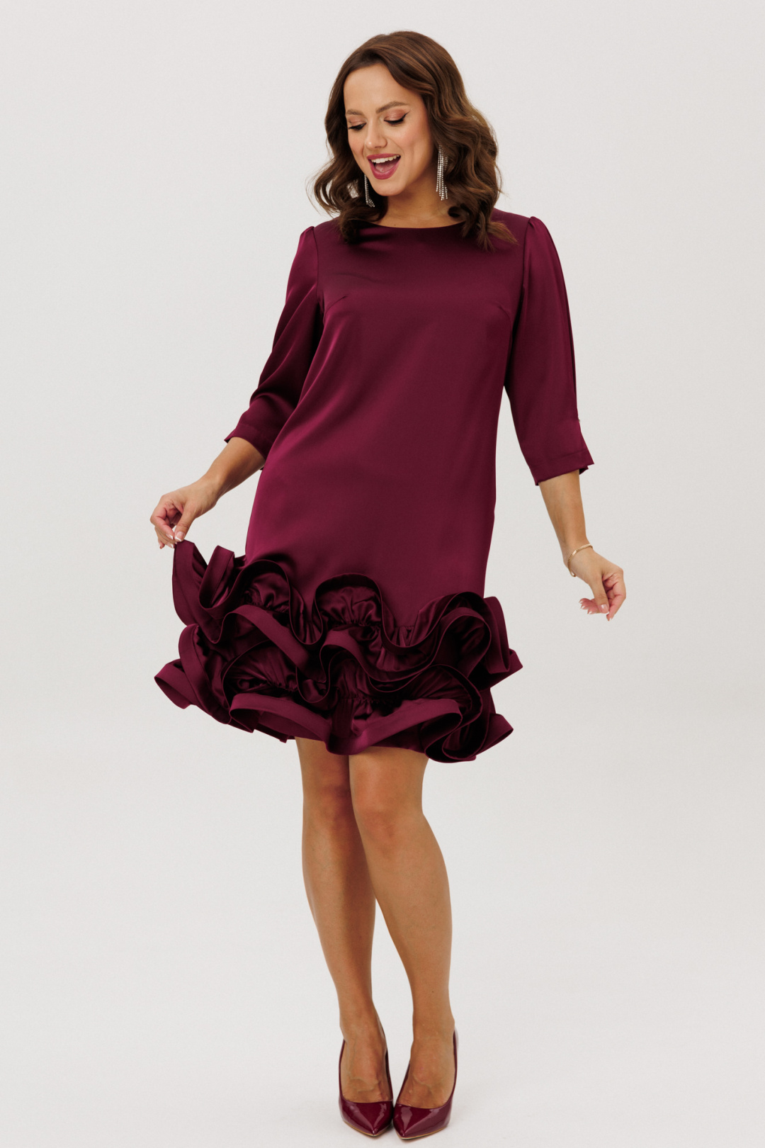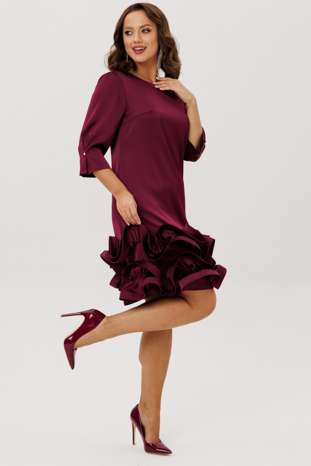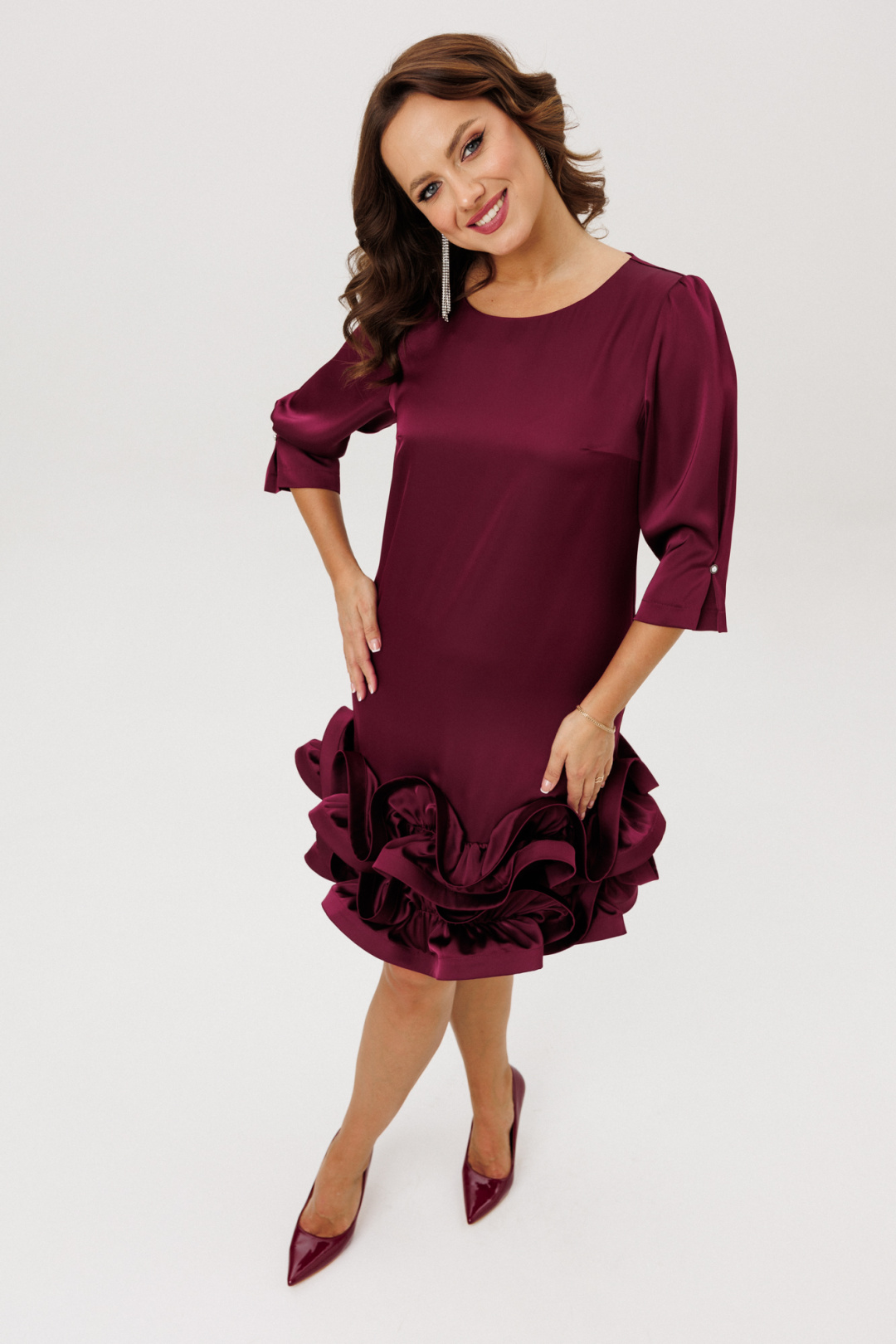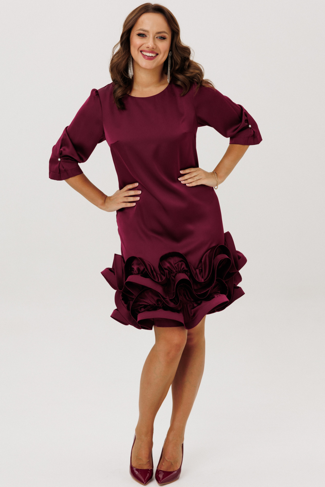 Нарядное платье полуприлегающего силуэта, выполненное из струящегося шелка «Армани» (немного тянется), без подкладки. По переду нагрудные вытачки. По спинке средний шов с застежкой на навесную петлю-пуговицу. Горловина округлой формы. Рукава втачные одношовные со сборкой по окату, встречной складкой и отделочной пуговицей по низу. Низ платья оформлен двумя присборенными воланами, края которых обработаны специальной тесьмой для придания формы изгибов воланам ( тесьма мягкая, подвижная).