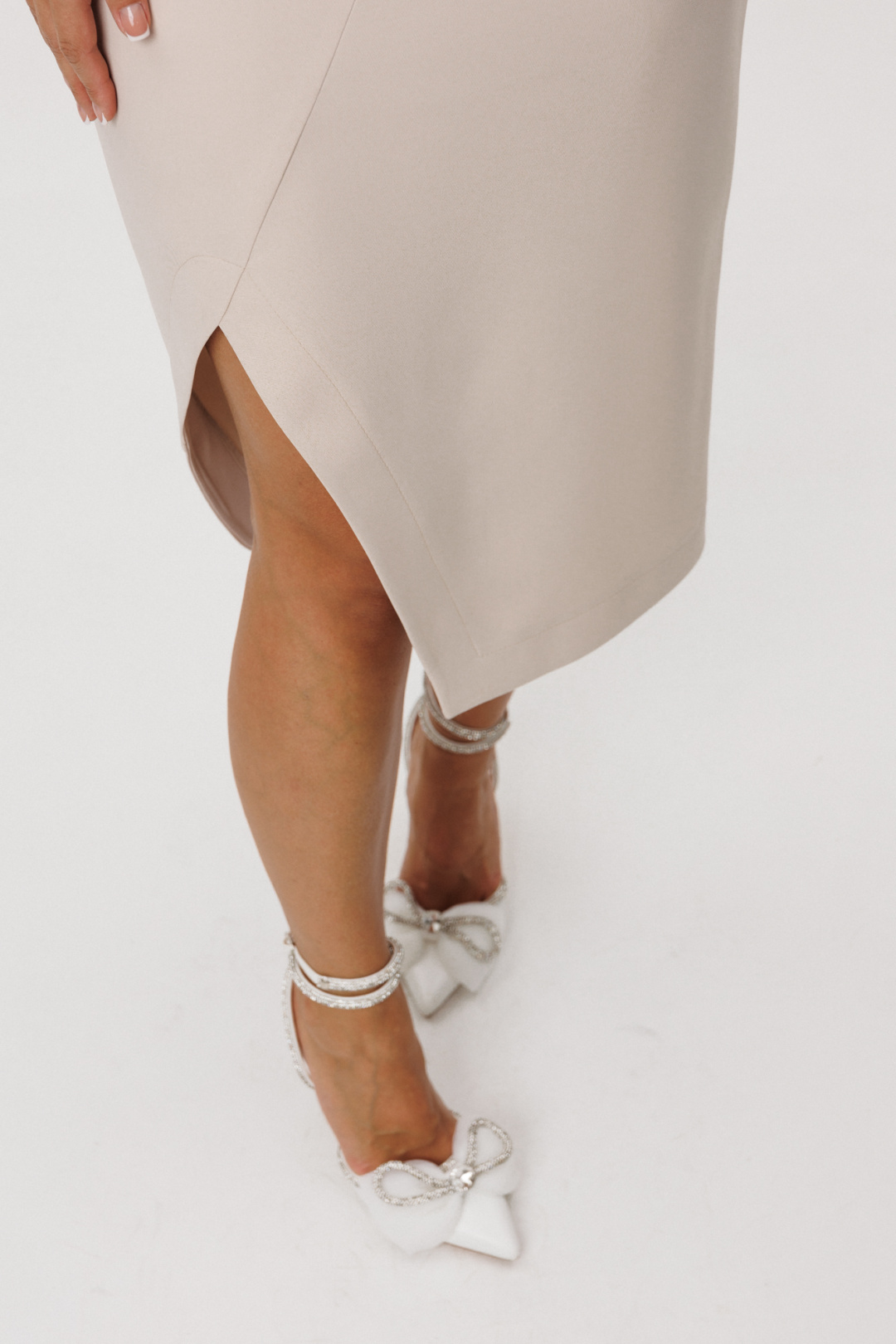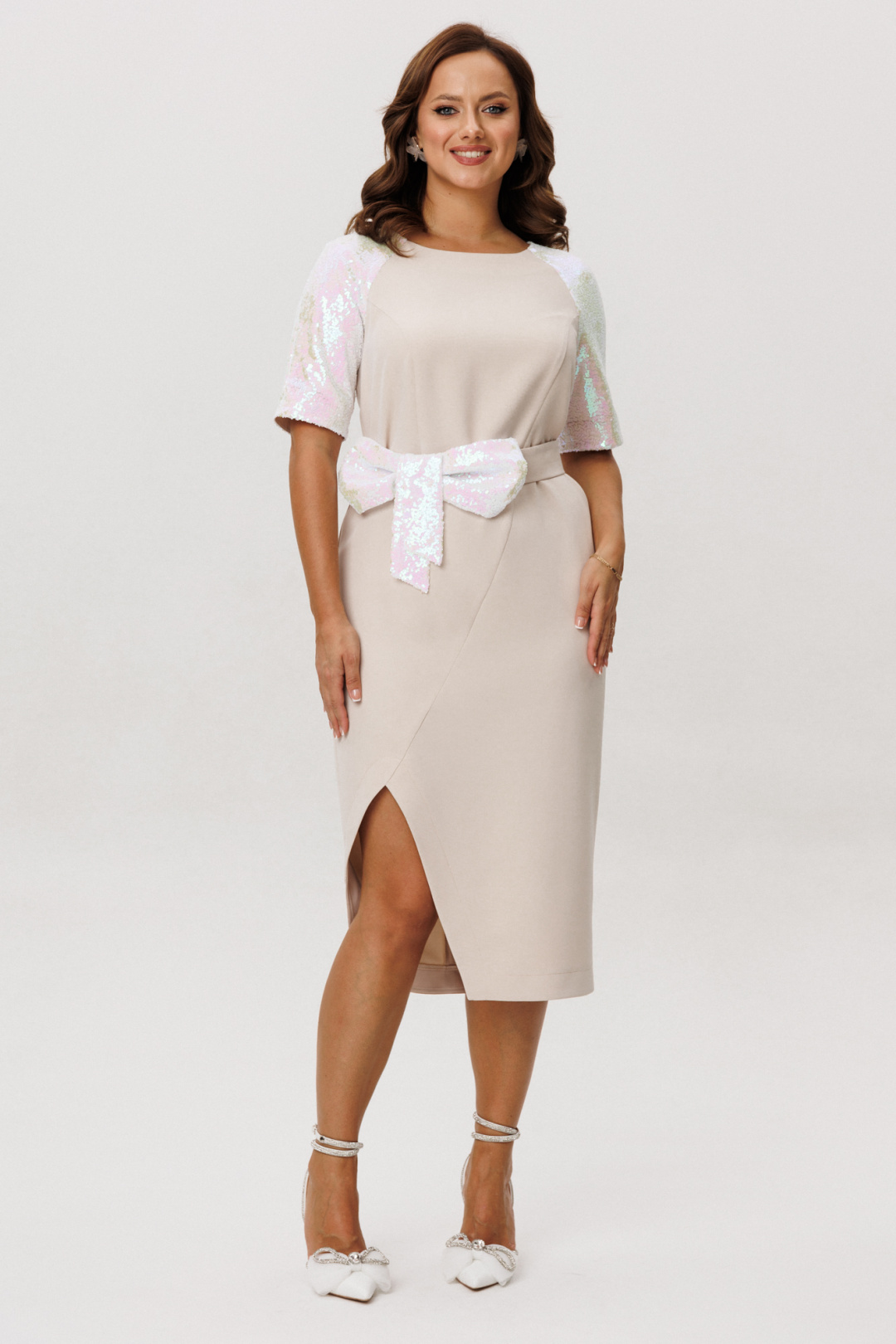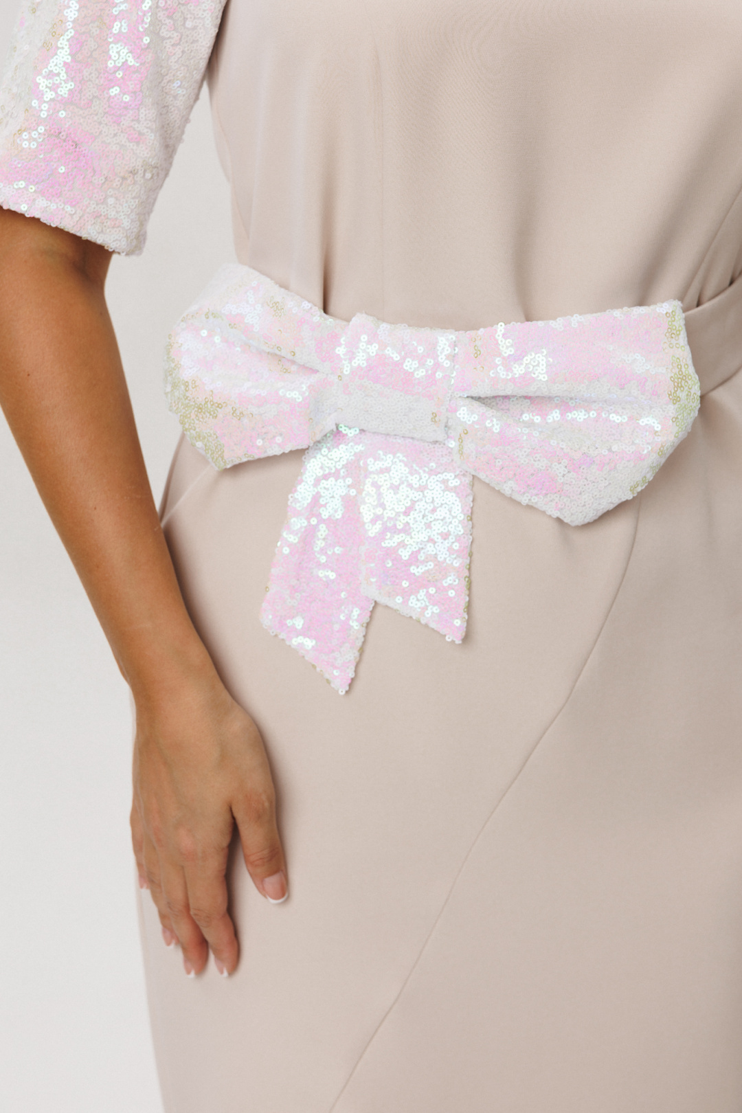 Платье полуприлегающего силуэта, покроя «Реглан». По переду ассиметричный подрез, переходящий в рельеф. Рельеф переходит в талиевую вытачку. По спинке средний шов, потайная застежка-молния и талиевые вытачки. Низ переда и спинки фигурной формы с разрезом по переду. Горловина округлой формы. Рукава-реглан со швом по середине и на подкладке. Само платье без подкладки. В комплект входит съемный пояс, выполненный из основной ткани, декорированный пышным бантом из пайеток.