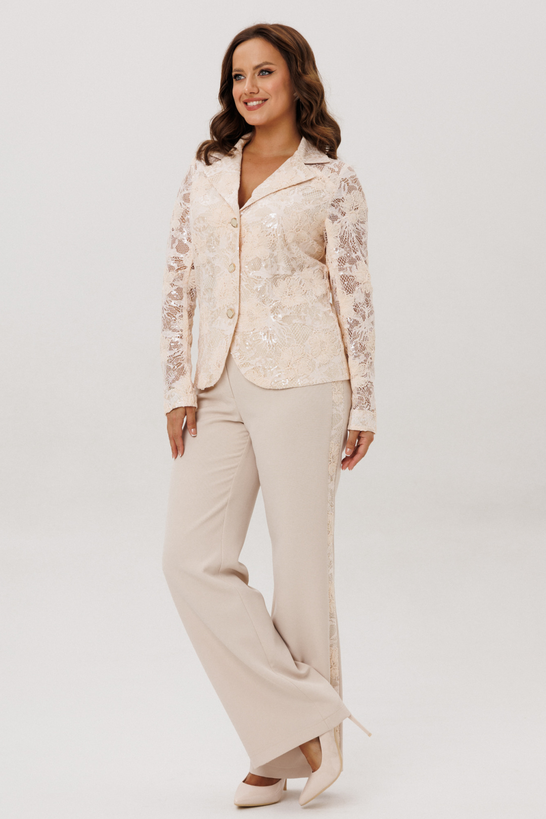Нарядный женский костюм, состоящий из жакета и брюк, выполненный из костюмной ткани (тянется) и из гипюра с вышивкой и пайетками (не тянется).