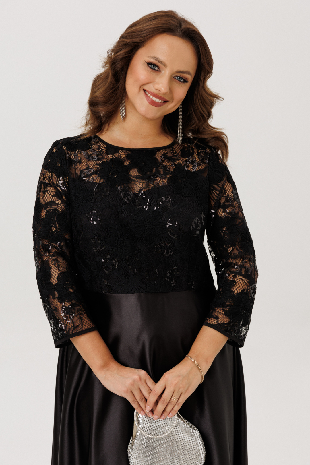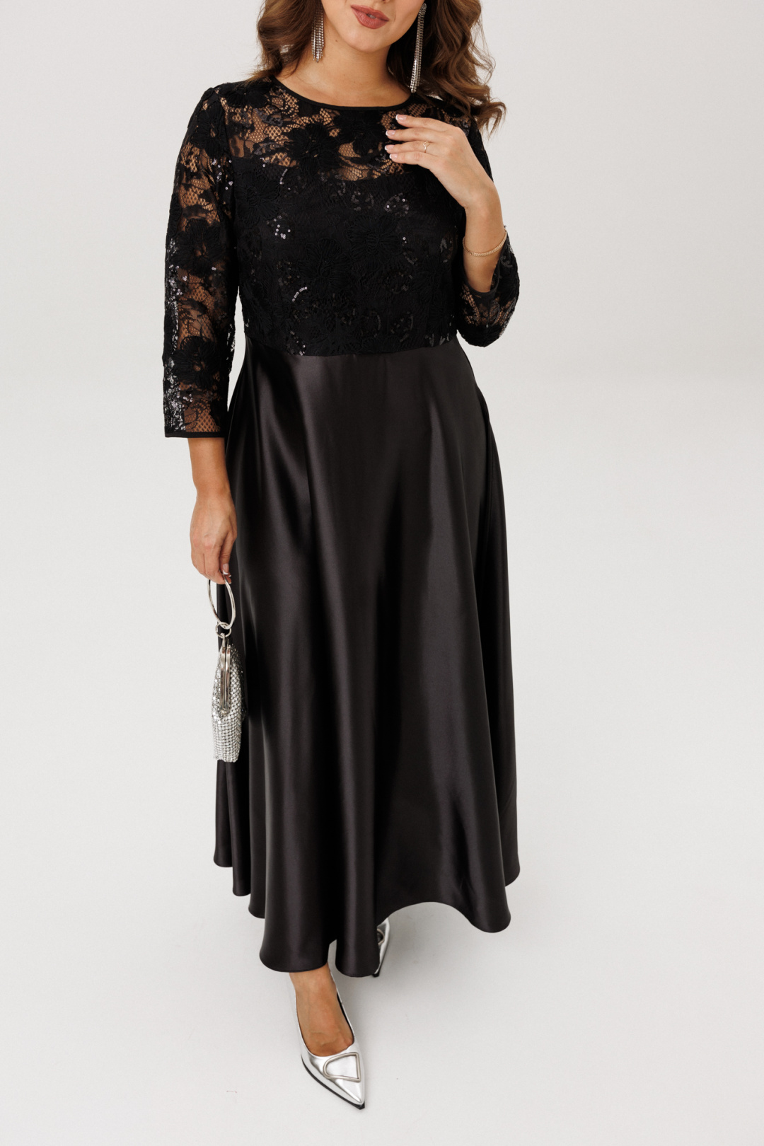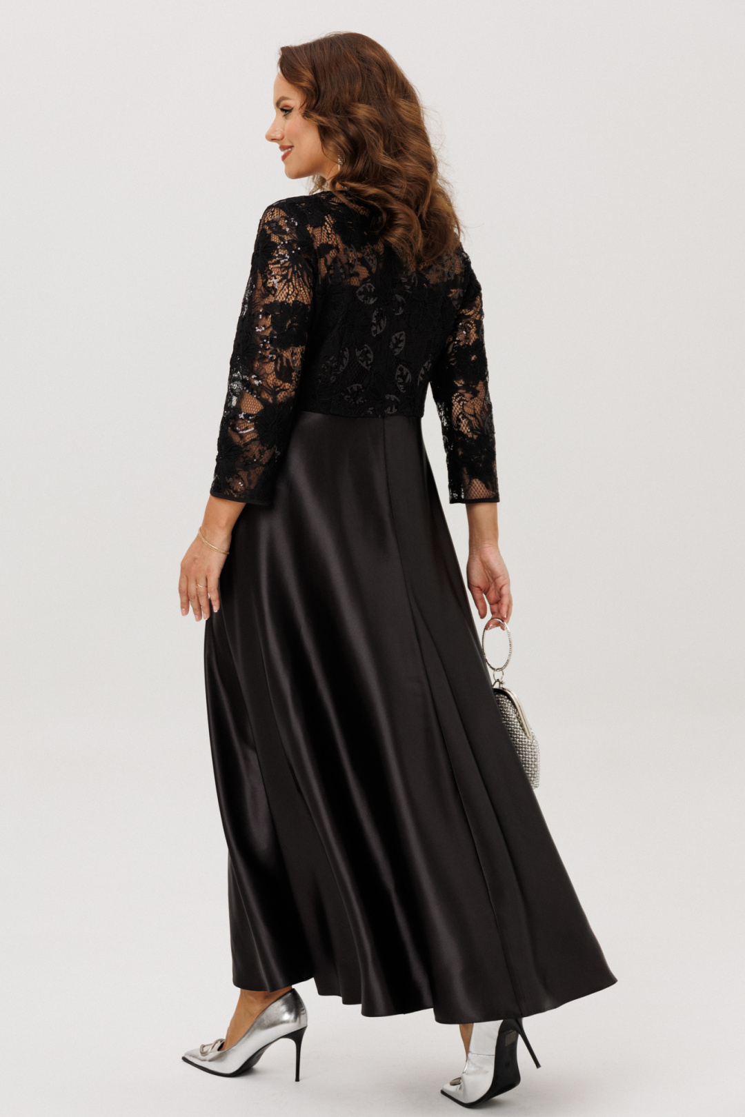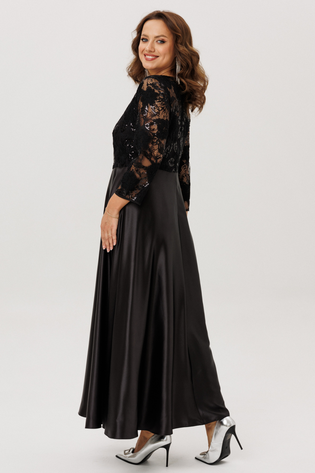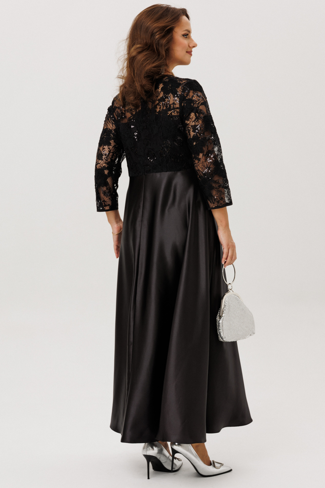 Нарядное женское платье отрезное по линии талии. Верхняя часть выполнена из гипюра с вышивкой и пайетками (не тянется), нижняя часть из плательного шелка «Армани» (немного тянется). По лифу переда – талиевые вытачки. По лифу спинки средний шов и потайная застежка-молния. По лифу переда и спинки – подкладка (немного тянется).  Горловина округлой формы, обработана окантовкой. Рукава втачные, одношовные, по низу обработаны окантовкой. Нижняя часть платья – «полусолнце» по спинке со средним швом.