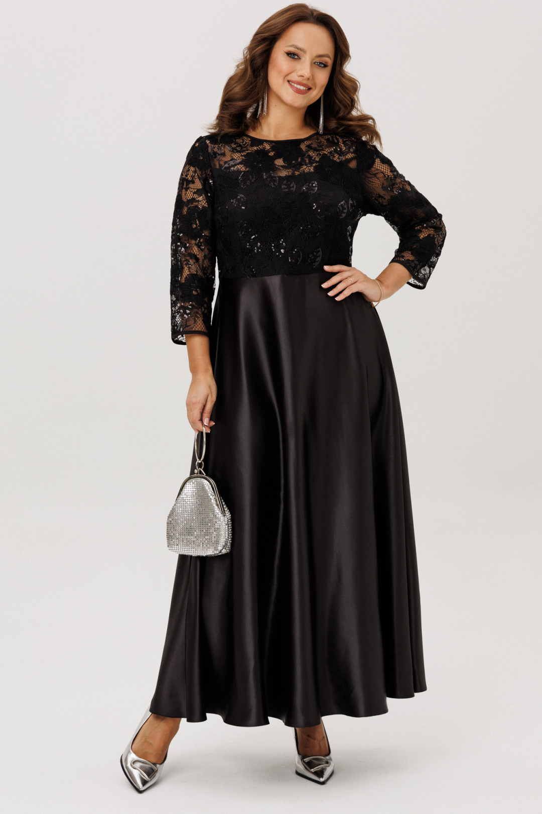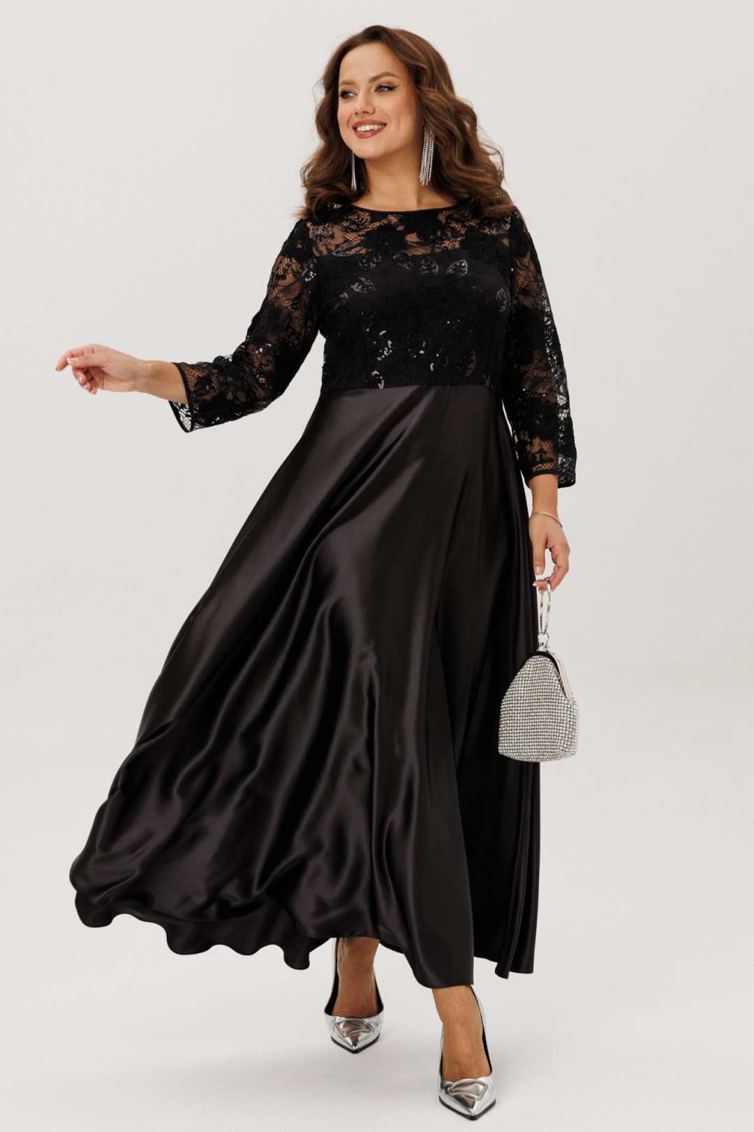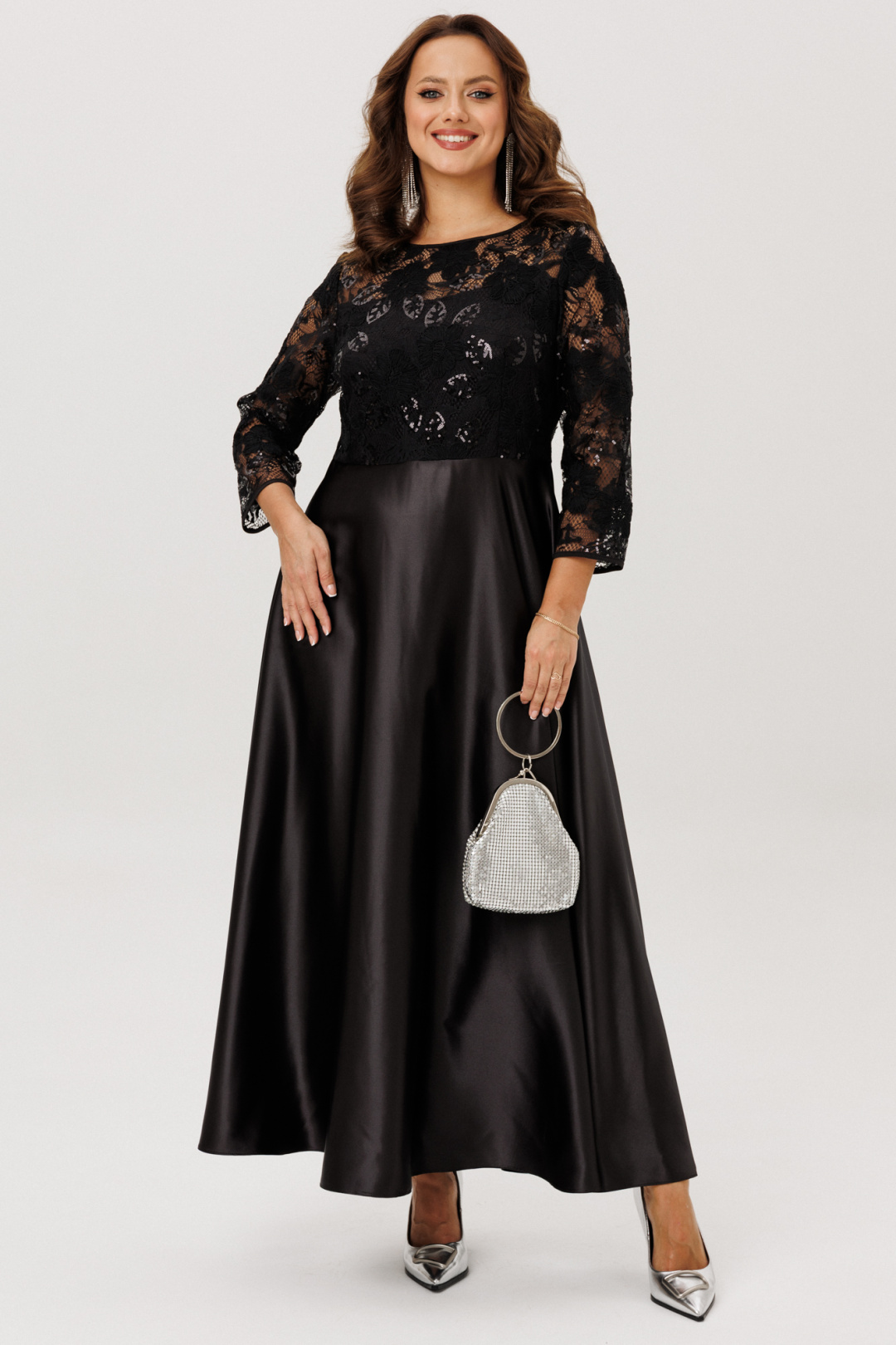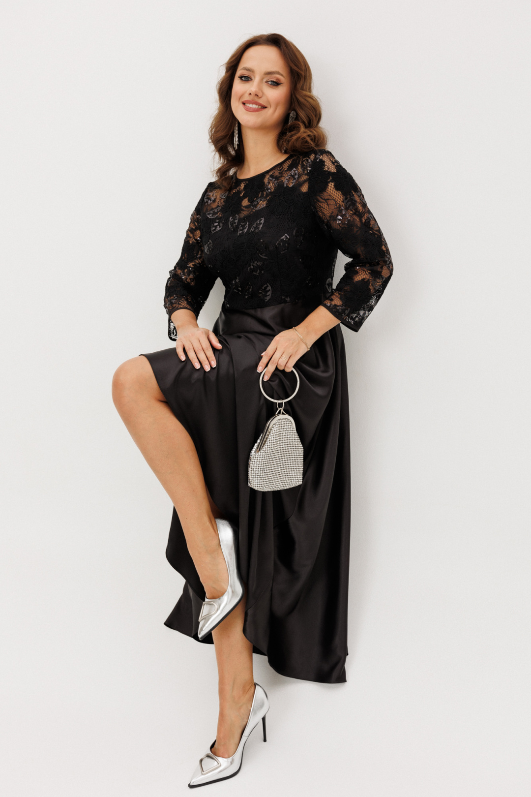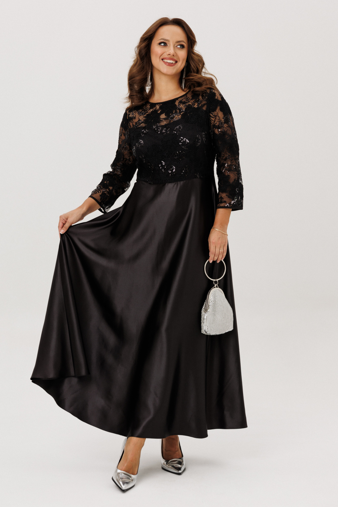Нарядное женское платье отрезное по линии талии. Верхняя часть выполнена из гипюра с вышивкой и пайетками (не тянется), нижняя часть из плательного шелка «Армани» (немного тянется). По лифу переда – талиевые вытачки. По лифу спинки средний шов и потайная застежка-молния. По лифу переда и спинки – подкладка (немного тянется).  Горловина округлой формы, обработана окантовкой. Рукава втачные, одношовные, по низу обработаны окантовкой. Нижняя часть платья – «полусолнце» по спинке со средним швом.