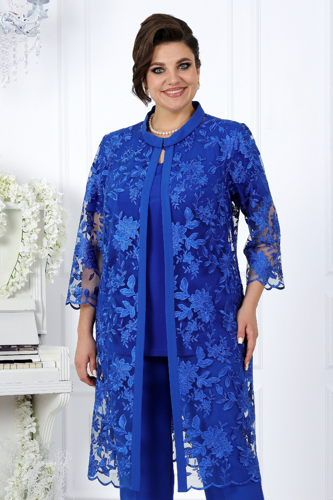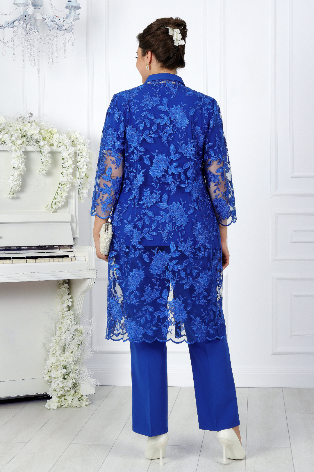 Комплект брючный 3-х предметный, состоящий из кардигана, выполненного из гипюра, джемпера, выполненного из трикотажного полотна «масло» и брюк, выполненных из костюмно-плательной ткани.