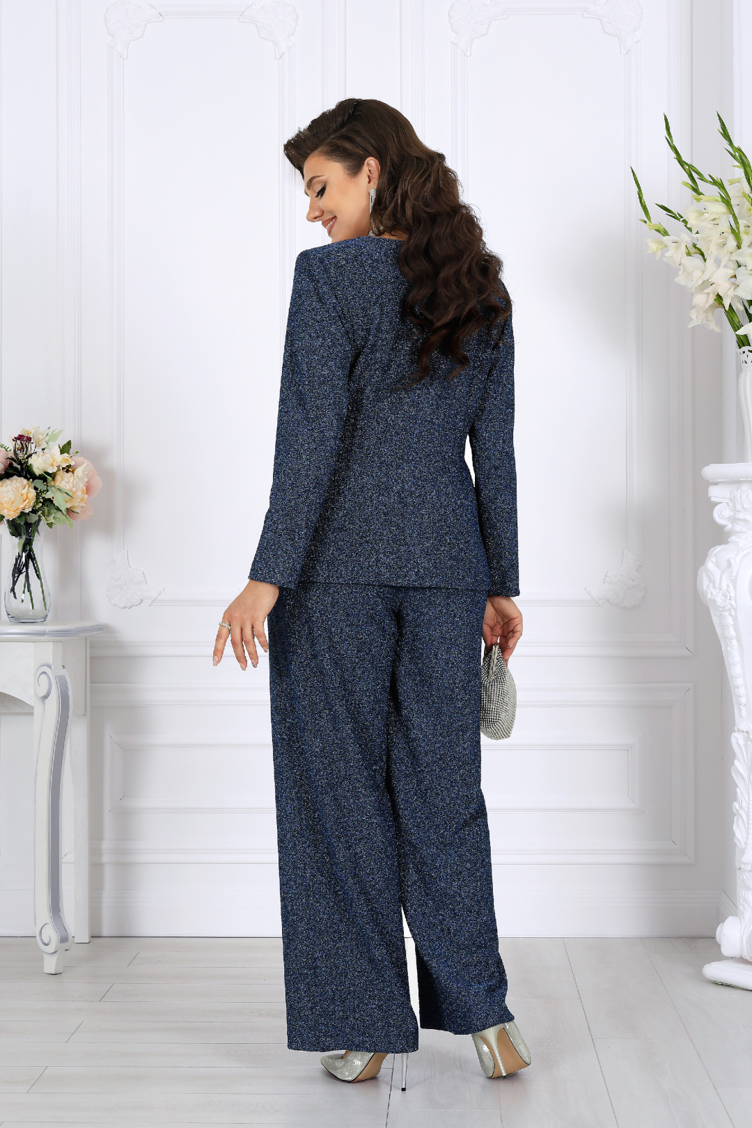Это не просто наряд — это ваша уверенность, статус и блеск, который будет сопровождать каждый ваш шаг. В этом костюме каждая деталь продумана так, чтобы создавать ощущение безупречного стиля и лёгкой роскоши. Мягкое мерцание люрекса делает образ выразительным и дорогим, а утончённый крой подчёркивает женственность и гармонию силуэта. Блузка с асимметричной деталью по линии талии — это модный акцент, который визуально формирует стройный силуэт и придаёт образу дизайнерскую изысканность. Нежная линия декольте в обрамлении округлой горловины элегантно подчёркивает женственность. Брюки прямого силуэта с комфортной посадкой — символ утончённой простоты и свободы. Эластичный пояс обеспечивает удобство, а мерцающая фактура ткани делает их достойным элементом вечернего гардероба. Такой костюм создан для особых случаев: новогодних вечеров, корпоратива, праздничного ужина или выхода в свет, но при этом он настолько универсален, что легко впишется и в деловой стиль. Комплект брючный 2-х предметный, состоящий из блузки и брюк. Блузка полуприлегающего силуэта, выполнена из трикотажного полотна с фактурной лицевой стороной «люрекс». Модель без подкладки, с плечевыми накладками. Спинка с талиевыми вытачками и средним швом. По линии талии в левой части переда – горизонтальный подрез с односторонними складками и отлетной деталью в шве. По линии талии в правой части переда обработан цельнокроеный пояс, край которого крепится в левом боковом шве. Горловина округлая, углубленная спереди. Рукав длинный, втачной. Длина блузки – 62 см. Длина рукава – 57 см. Брюки длинные, с посадкой на талии, выполнены из трикотажного полотна с фактурной лицевой стороной «люрекс». Модель без стрелок, без застежки. Спереди обработаны наклонные боковые карманы. Для лучшего прилегания по линии талии в притачном поясе предусмотрена эластичная лента, вставленная по всей длине. Длина брюк по боковому (с поясом) – 106 см (50-52 р-р), 107 см (54-58 р-р).