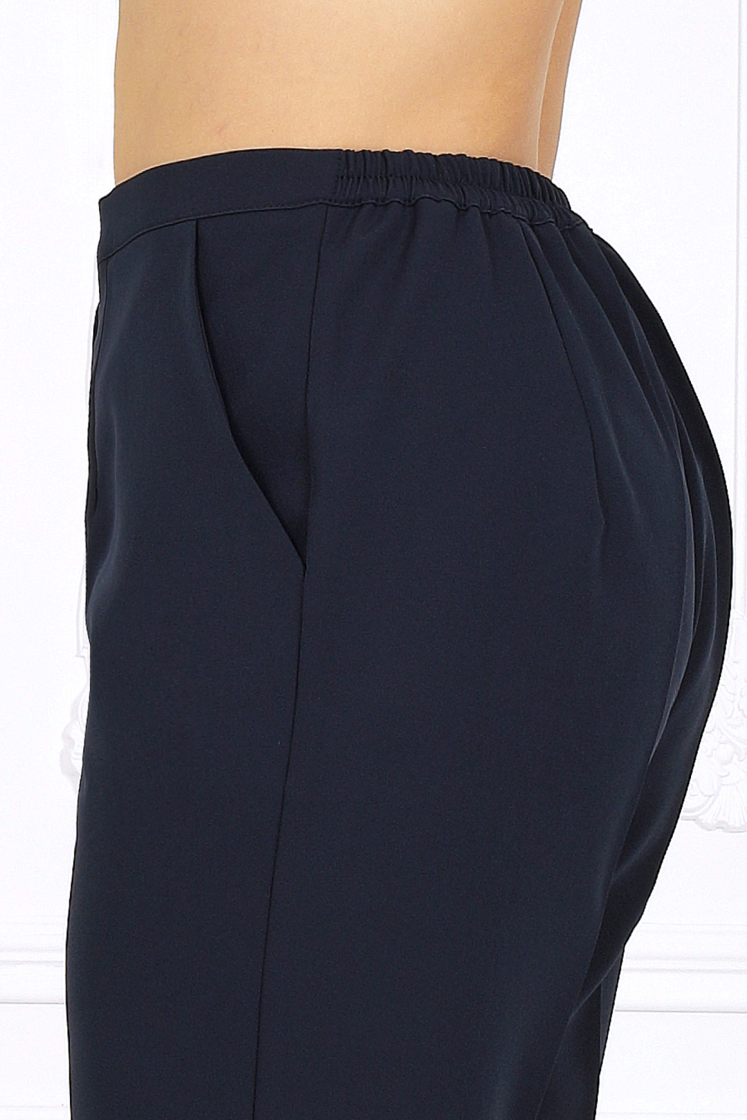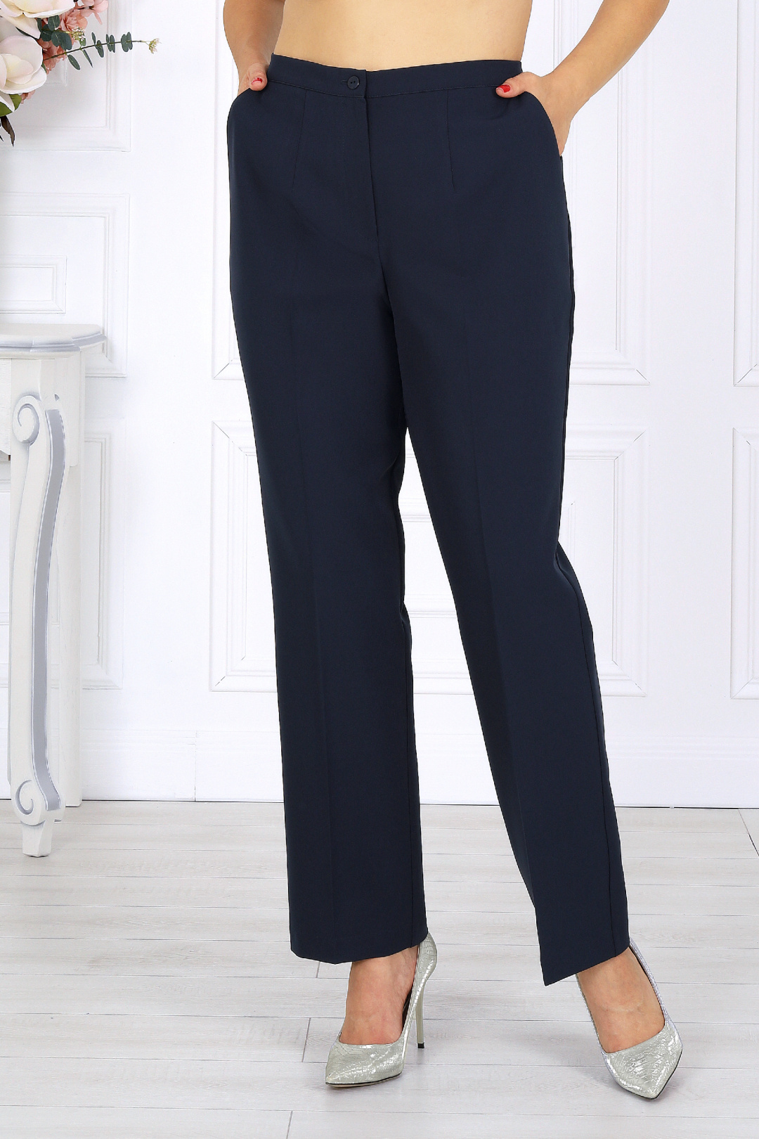 Брюки классические, длинные, с посадкой на талии, выполнены из костюмно- плательной ткани. Модель со стрелками. Передние и задние половинки брюк с талиевыми вытачками, направленными от пояса вниз. Спереди обработаны наклонные боковые карманы и центральная застёжка на тесьму-«молнию». Притачной пояс застегивается на 1 петлю и 1 пуговицу; для лучшего прилегания по линии талии в притачном поясе предусмотрена эластичная лента, вставленная по спинке. Длина брюк по боковому (с поясом) – 104 см (50 – 52 р-р), 105 см (54 – 58 р-р).