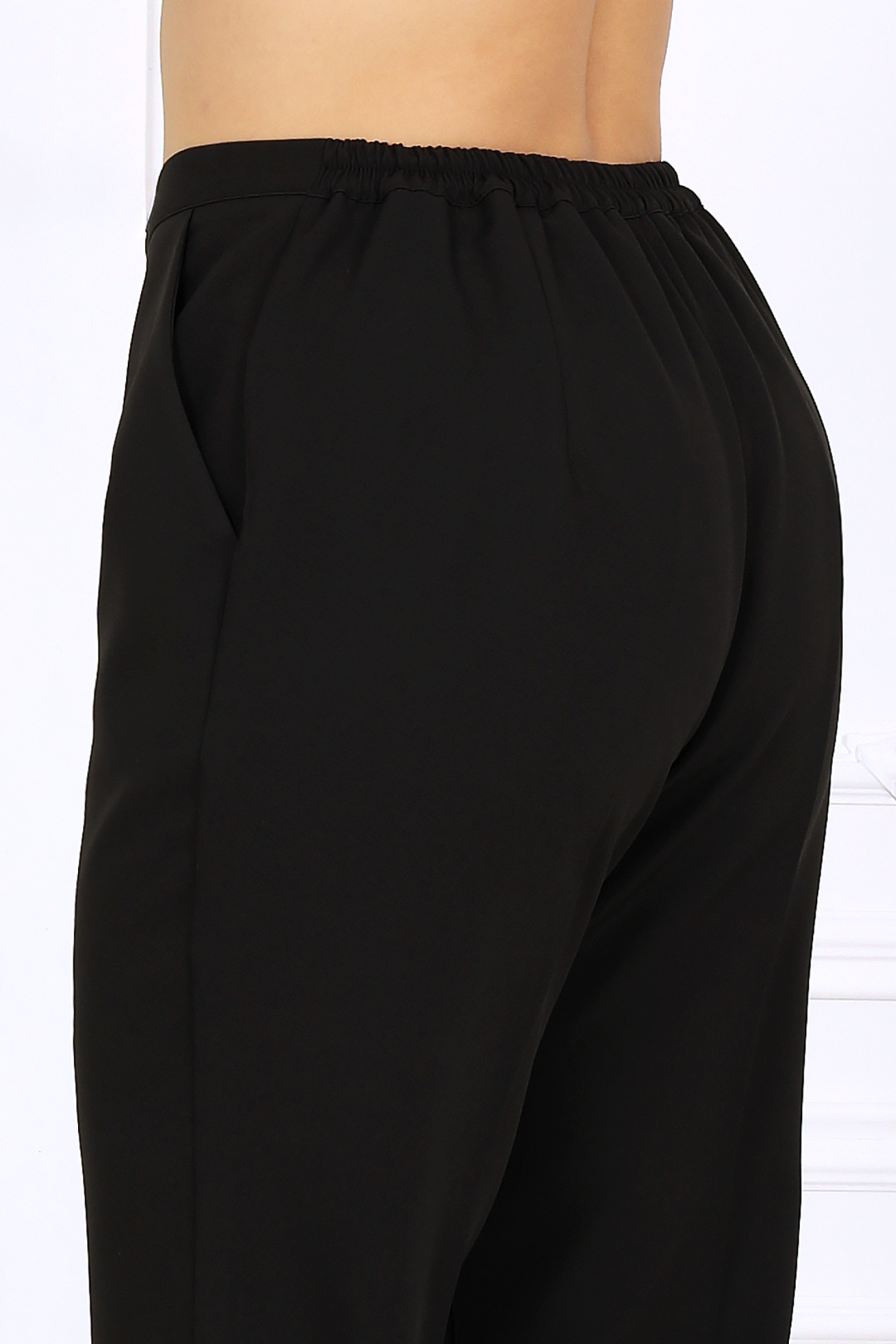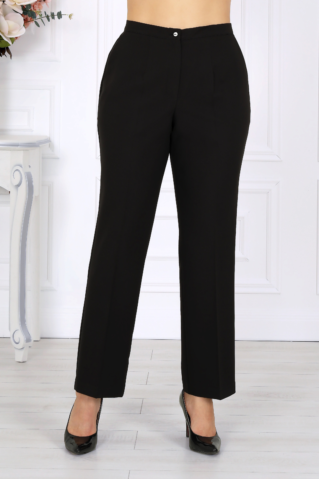 Брюки классические, длинные, с посадкой на талии, выполнены из костюмно- плательной ткани. Модель со стрелками. Передние и задние половинки брюк с талиевыми вытачками, направленными от пояса вниз. Спереди обработаны наклонные боковые карманы и центральная застёжка на тесьму-«молнию». Притачной пояс застегивается на 1 петлю и 1 пуговицу; для лучшего прилегания по линии талии в притачном поясе предусмотрена эластичная лента, вставленная по спинке. Длина брюк (с поясом) – 102 см (50-52р-р); длина брюк (с поясом) – 103 см (54-58р-р).
