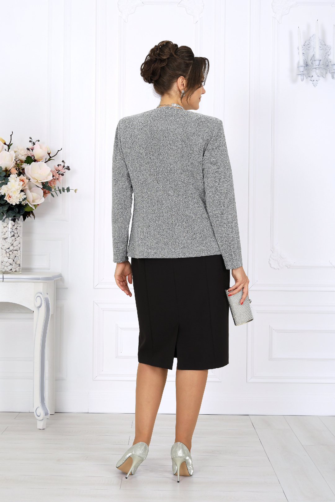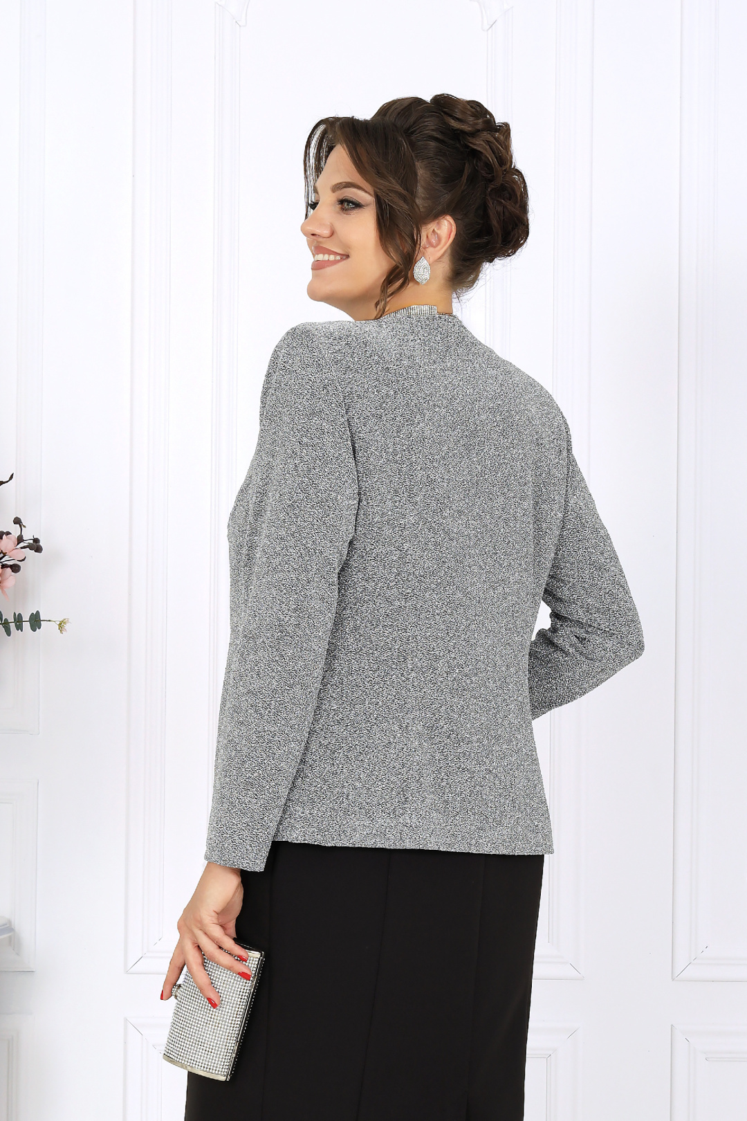 Жакет полуприлегающего силуэта, выполнен из трикотажного полотна с фактурной лицевой стороной «люрекс». Модель на трикотажной подкладке, с плечевыми накладками. Перед с нагрудными вытачками, направленными от проймы; спинка – с талиевыми. Фигурные борта фиксируются на запах по линии горловины при помощи внутренней застежки на 2 петли и 2 потайные пуговицы и внешней застежки - на 2 петли и 2 декоративные пуговицы, обтянутые основным материалом. Горловина округлой формой, спереди углубленная. Рукав втачной, длинный. Длина жакета – 62 см; длина рукава – 59 см.