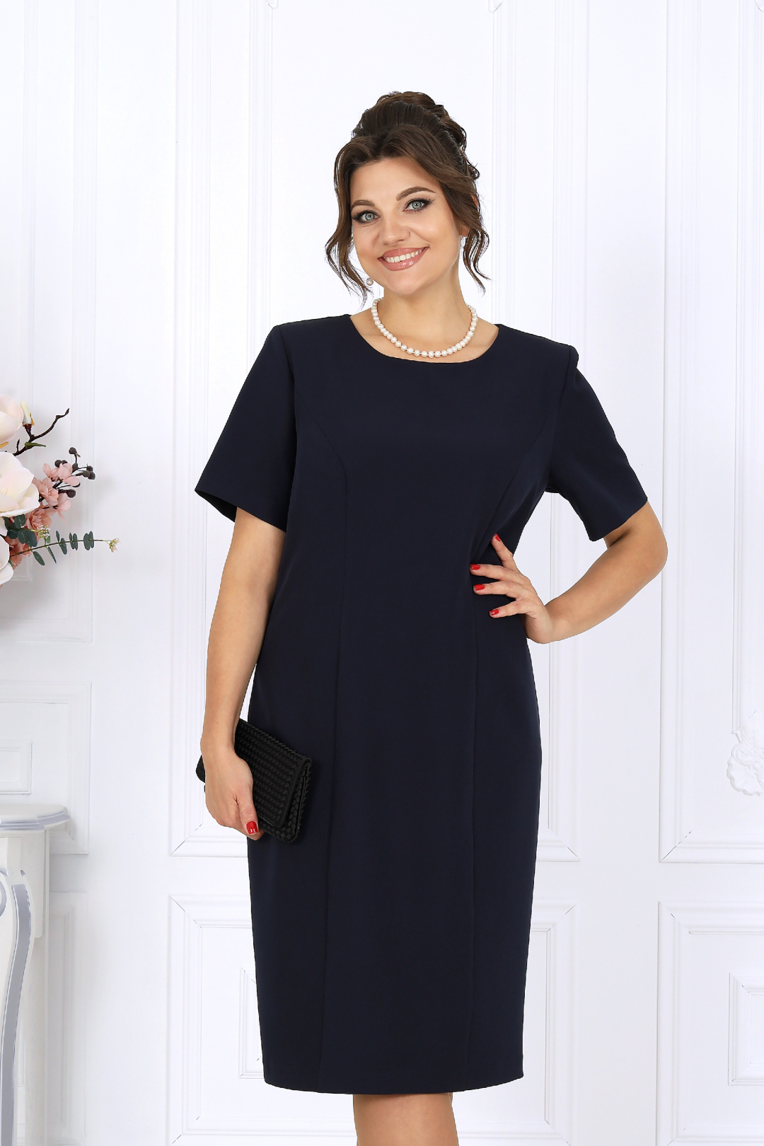 Платье полуприлегающего силуэта, выполнено из костюмно-плательной ткани. Модель на трикотажной подкладке, с плечевыми накладками. Перед и спинка с рельефными швами, направленными от проймы до низа. В верхней части среднего шва спинки обработана застежка на потайную тесьму-«молнию» (50см); в нижней части шва – шлица. Горловина округлой формы, спереди углубленная. Рукав втачной, короткий. Длина платья – 104 см; длина рукава – 25 см.