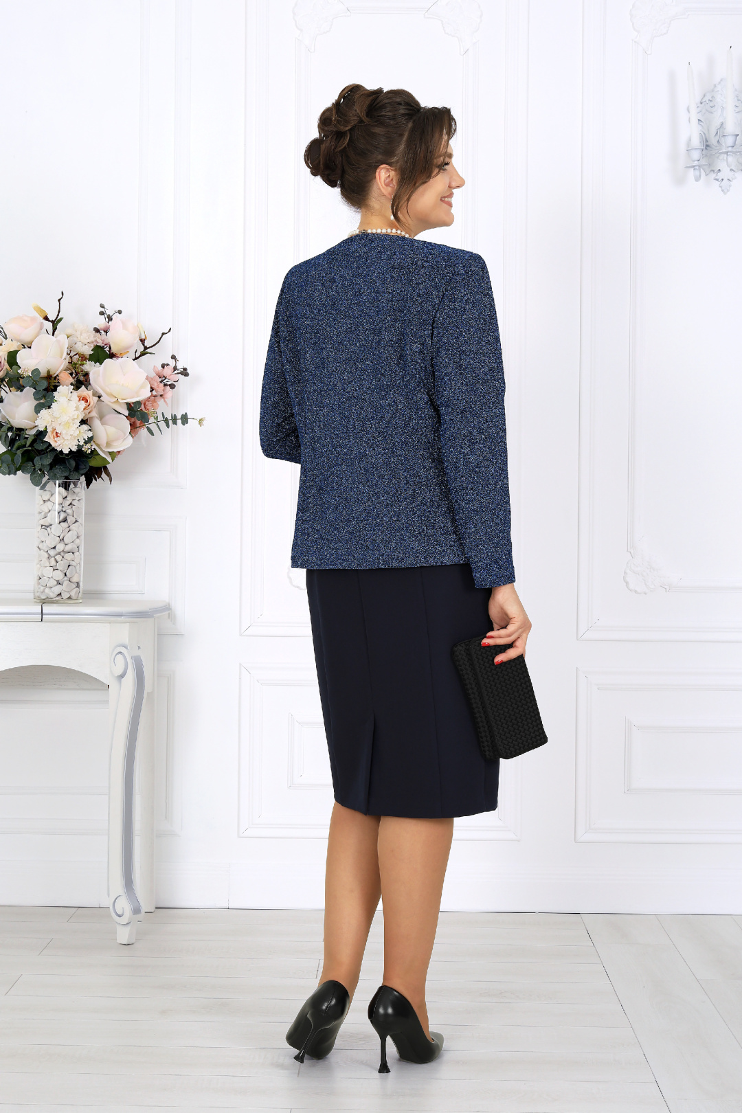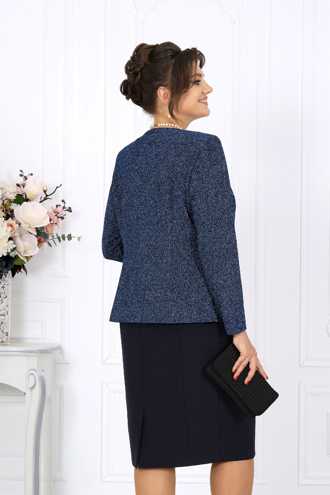 Жакет полуприлегающего силуэта, выполнен из трикотажного полотна с фактурной лицевой стороной «люрекс». Модель на трикотажной подкладке, с плечевыми накладками. Перед с нагрудными вытачками, направленными от проймы; спинка – с талиевыми. Фигурные борта фиксируются на запах по линии горловины при помощи внутренней застежки на 2 петли и 2 потайные пуговицы и внешней застежки - на 2 петли и 2 декоративные пуговицы, обтянутые основным материалом. Горловина округлой формой, спереди углубленная. Рукав втачной, длинный. Длина жакета – 62 см; длина рукава – 59 см.