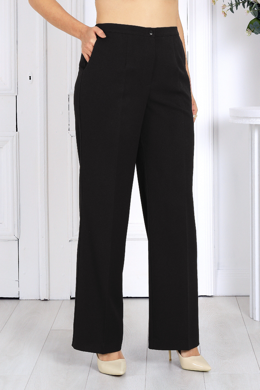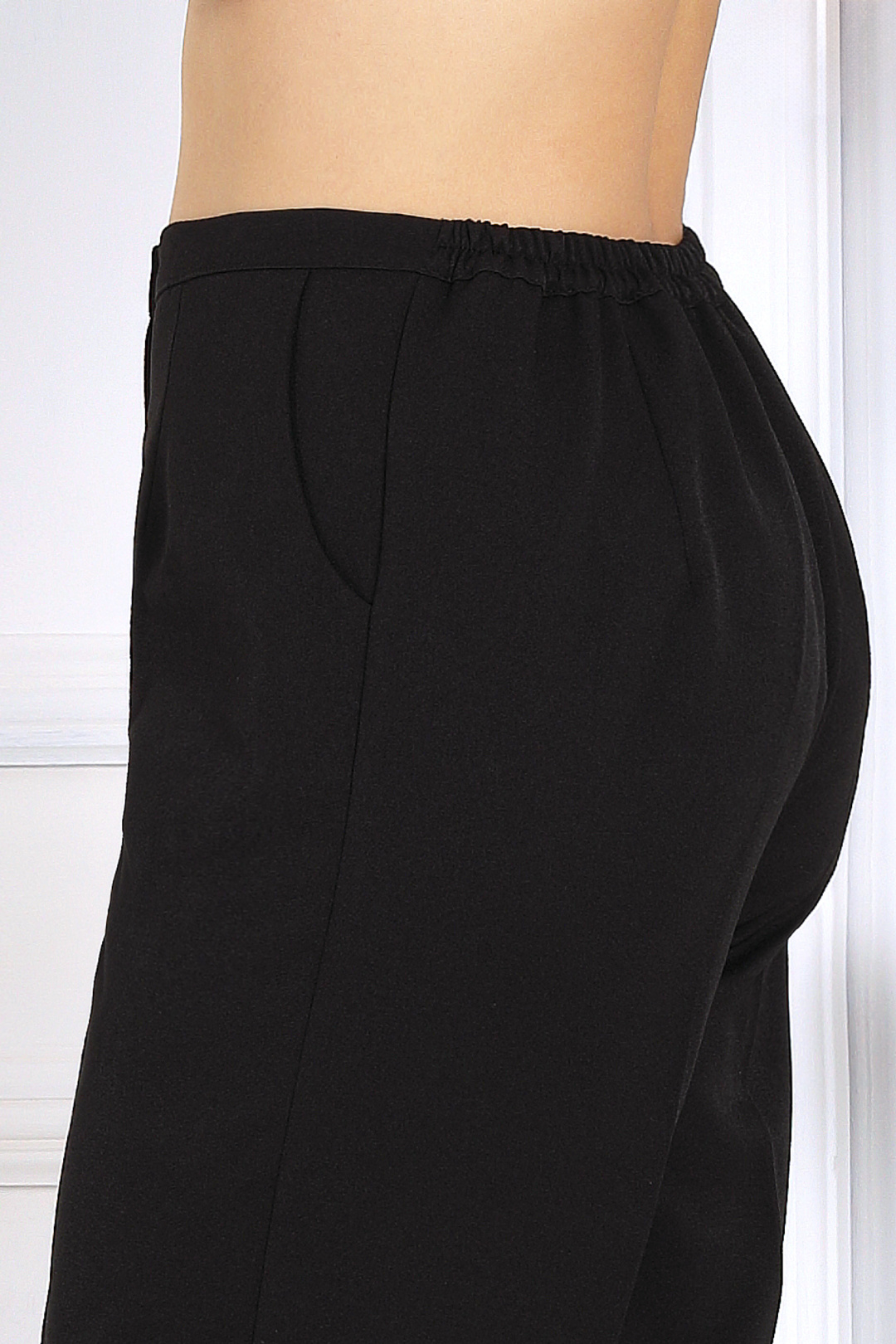 Брюки классические, с кантами и посадкой на талии, выполнены из костюмной поливискозы. Модель с центральной застёжкой на тесьму-«молнию», на притачном поясе, застегивающемся на петлю и пуговицу. Передние и задние половинки брюк с талиевыми вытачками, направленными от пояса вниз. Спереди обработаны боковые наклонные карманы. Для лучшего прилегания брюк в области талии в поясе по задним половинкам вставлена эластичная лента. Длина брюк по боковому (с поясом)-107.
