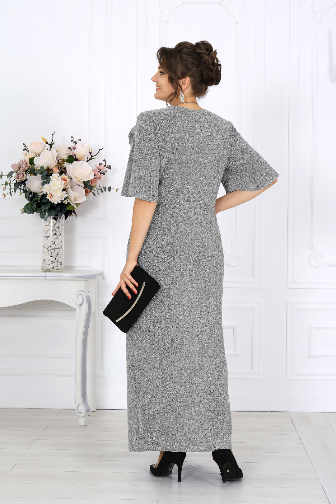 Платье женское полуприлегающего силуэта, выполнено из трикотажного полотна с фактурной лицевой стороной «люрекс». Модель на трикотажной подкладке, с плечевыми накладками. В левом боковом шве обработана застежка на потайную тесьму-«молнию» (35 см). Перед платья с горизонтальным подрезом по линии талии и отлетной деталью в шве подреза. В правой части переда обработан рельеф с разрезом в нижней части. Вдоль рельефного шва заложены односторонние складки, направленные к центру переда. Спинка с талиевыми вытачками. Горловина спинки округлая, по переду V-образная, углубленная. Рукав короткий, втачной, формы «крылышко на запах», со скругленными краями. Платье дополнено съемным «цветком» из основного полотна. Длина платья - 136 см; длина рукава - 31 см.