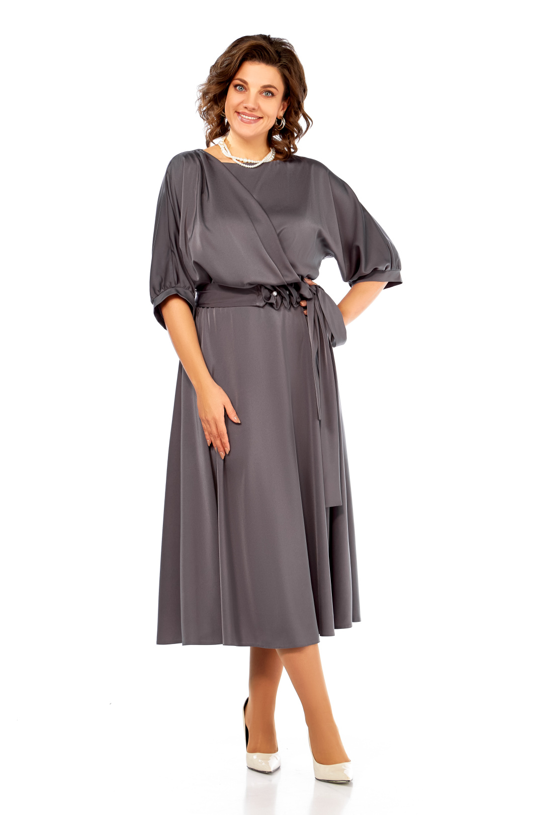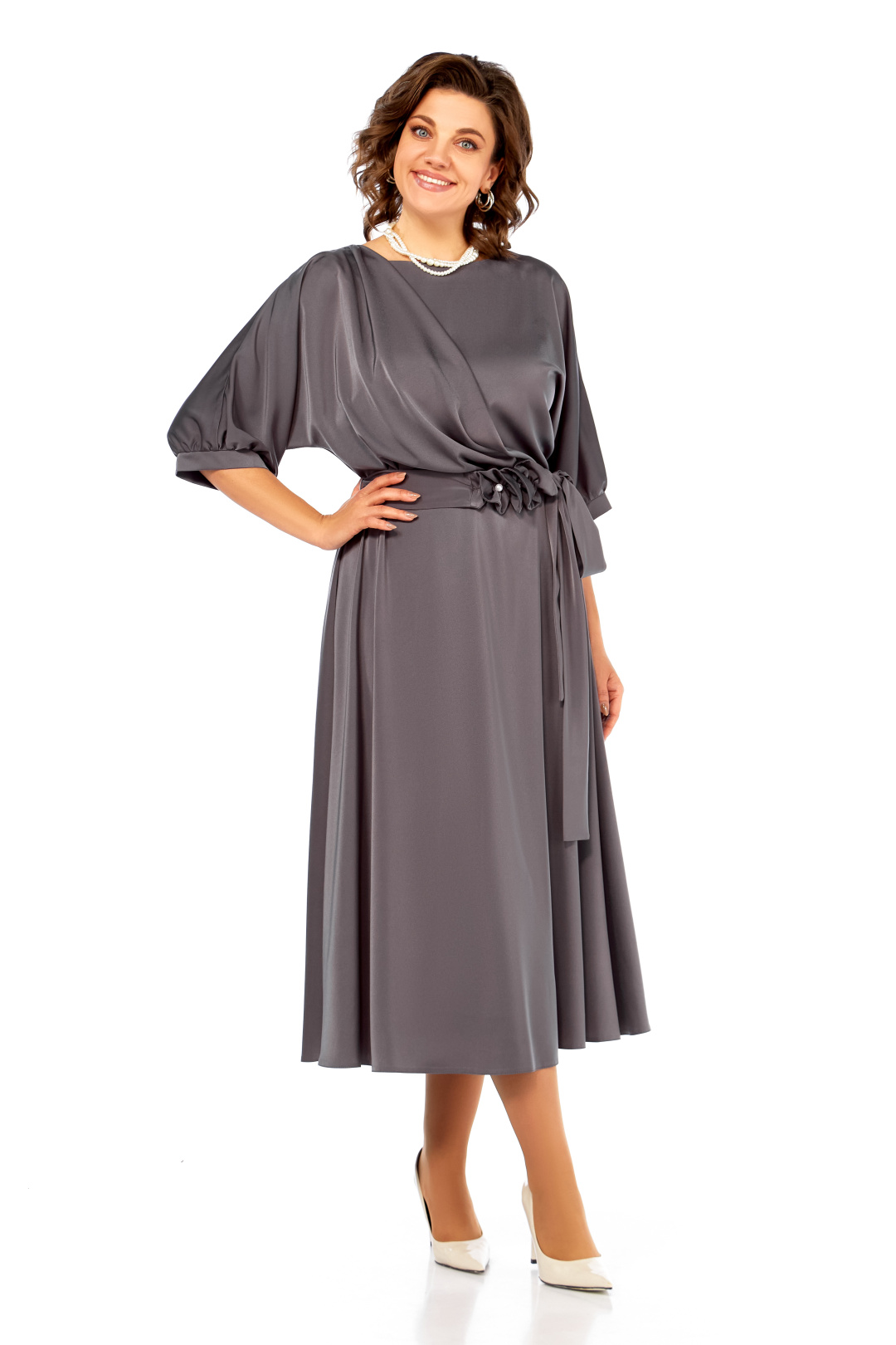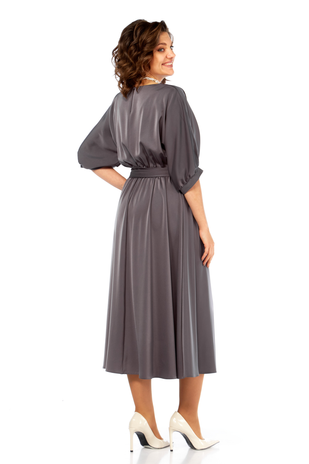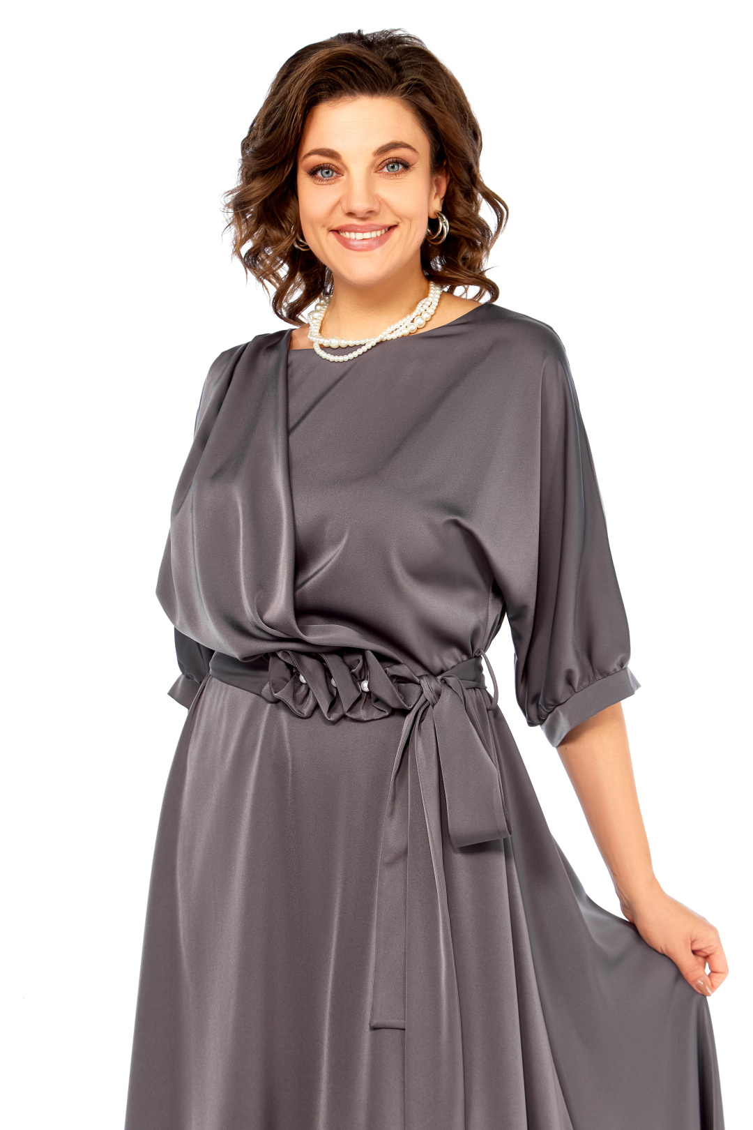 Нарядное платье из струящейся ткани, отрезное по линии талии. Верх летучая мышь, по низу рукава сборка и притачная манжета. Вырез горловины округлой формы. По переду ассиметричная деталь от плеча до линии подреза. По линии подреза резинка. Нижняя часть платья клеш. К платью прилагается интересный пояс, украшенный стразами.