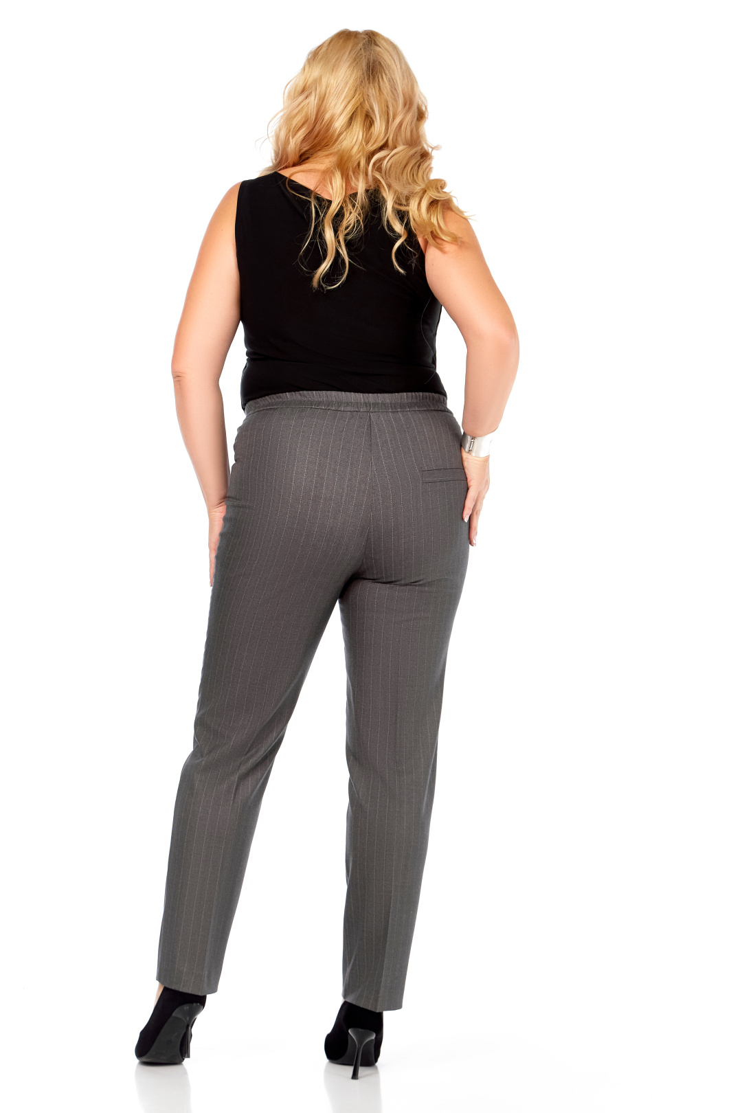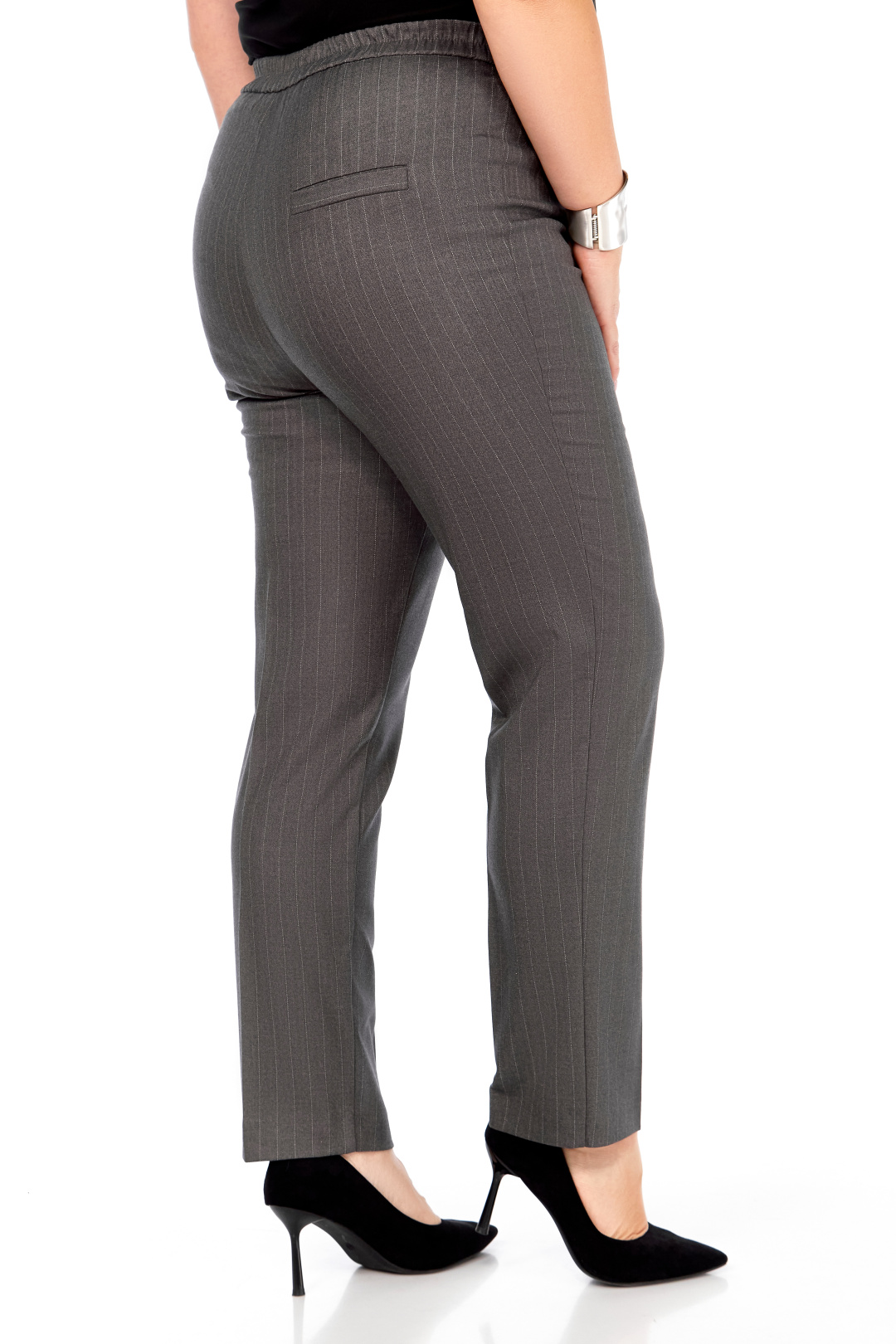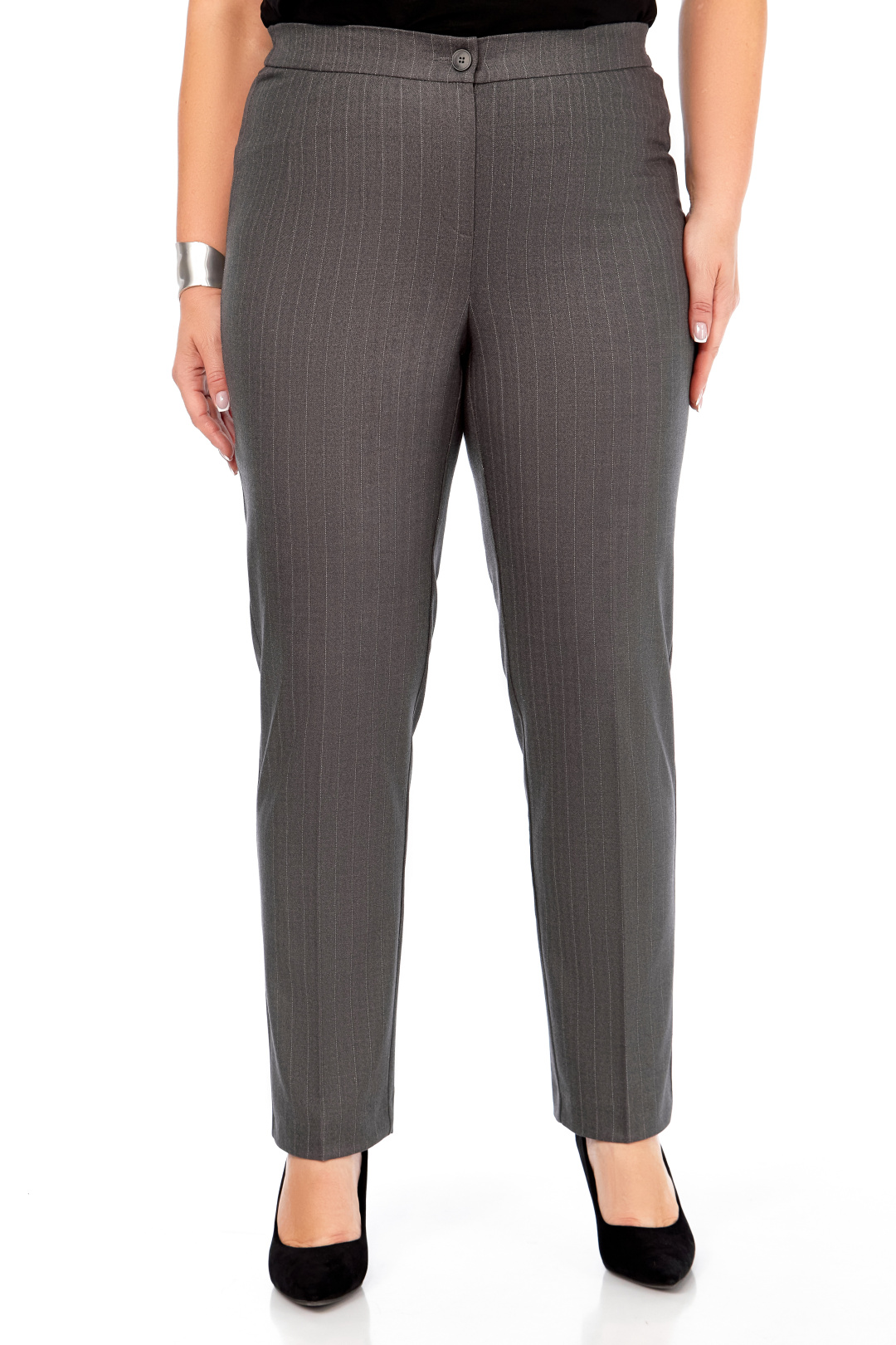 Элегантные серые брюки в тонкую полоску — идеальный выбор для современного гардероба. Модель слегка заужена к низу, обеспечивая аккуратный силуэт, в то время как классический дизайн с застежкой на пуговицу и молнию добавляет функциональности. Пояс с резинкой по спинке гарантирует комфортную посадку. Длина брюк составляет 105 см, что позволяет эффектно сочетаться как с обувью на каблуке, так и с более низкой подошвой. Вертикальный принт в полоску визуально вытягивает силуэт, делая образ более стройным и элегантным.