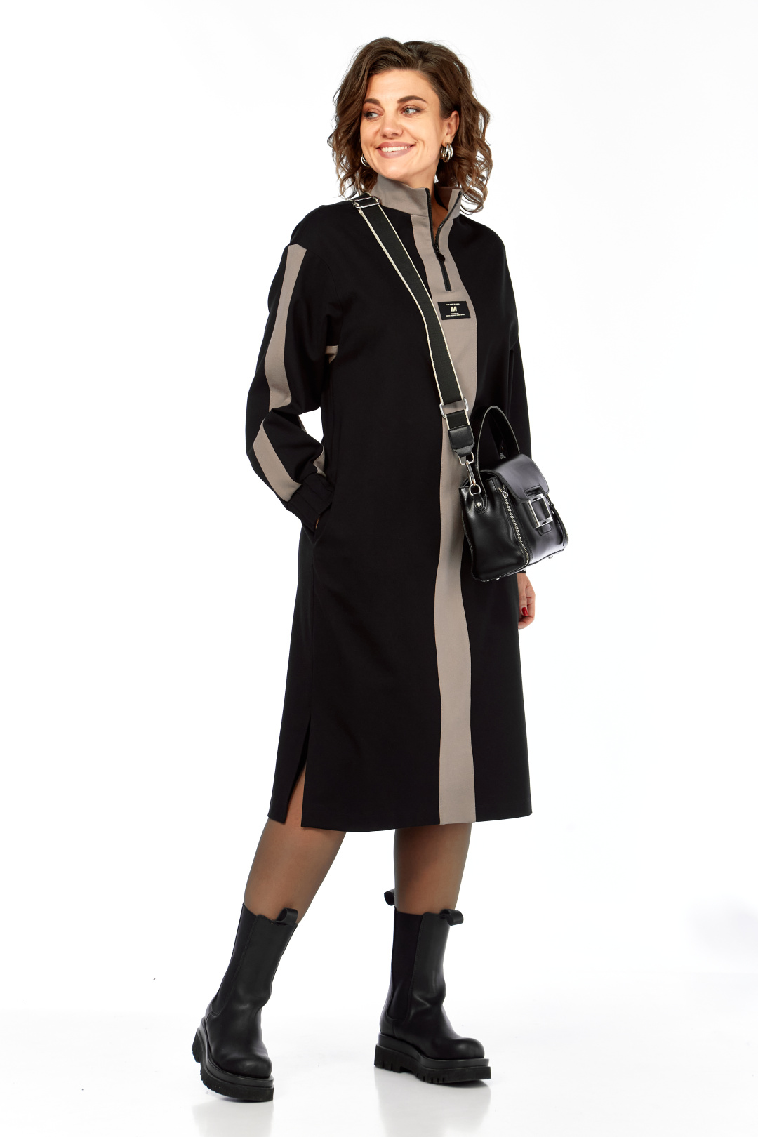 Платье в стиле спорт-шик прямого силуэта, с воротником-стойкой. По переду, по центру контрастная отделка, молния, переходящая в воротник, декоративная нашивка. В боковых швах карманы и разрезы в низу. Рукав апущенный на манжете, с контрастными полосками.
