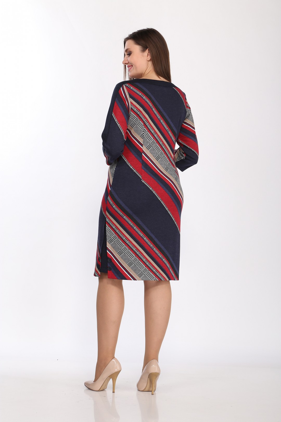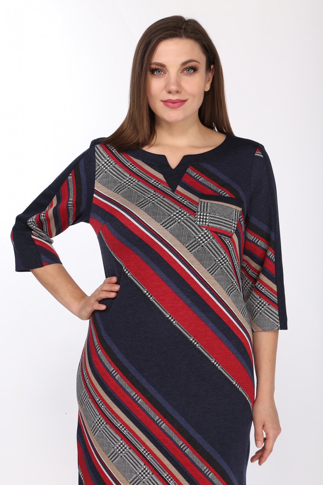 Платье полуприлегающего силуэта с полукруглым вырезом горловины, обработанной вставкой из отделочной ткани. По центру горловины V-образный вырез. Перед с накладными карманами с одной стороны и нагрудными вытачками. Верх кармана обработан притачной деталью из отделочной ткани. В нижней части платья края боковых швов с напуском, между ними вставка. На напусках пуговицы. Рукав втачной, длиной 3/4. По центру рукава вставка. Спинка со вставкой вдоль горловины и плечевых швов и талиевыми вытачками. Размеры 48-52: длина платья 100 см, длина рукава 42 см. Размеры 54-58: Длина изделия 102 см, длина рукава изделия 44 см.