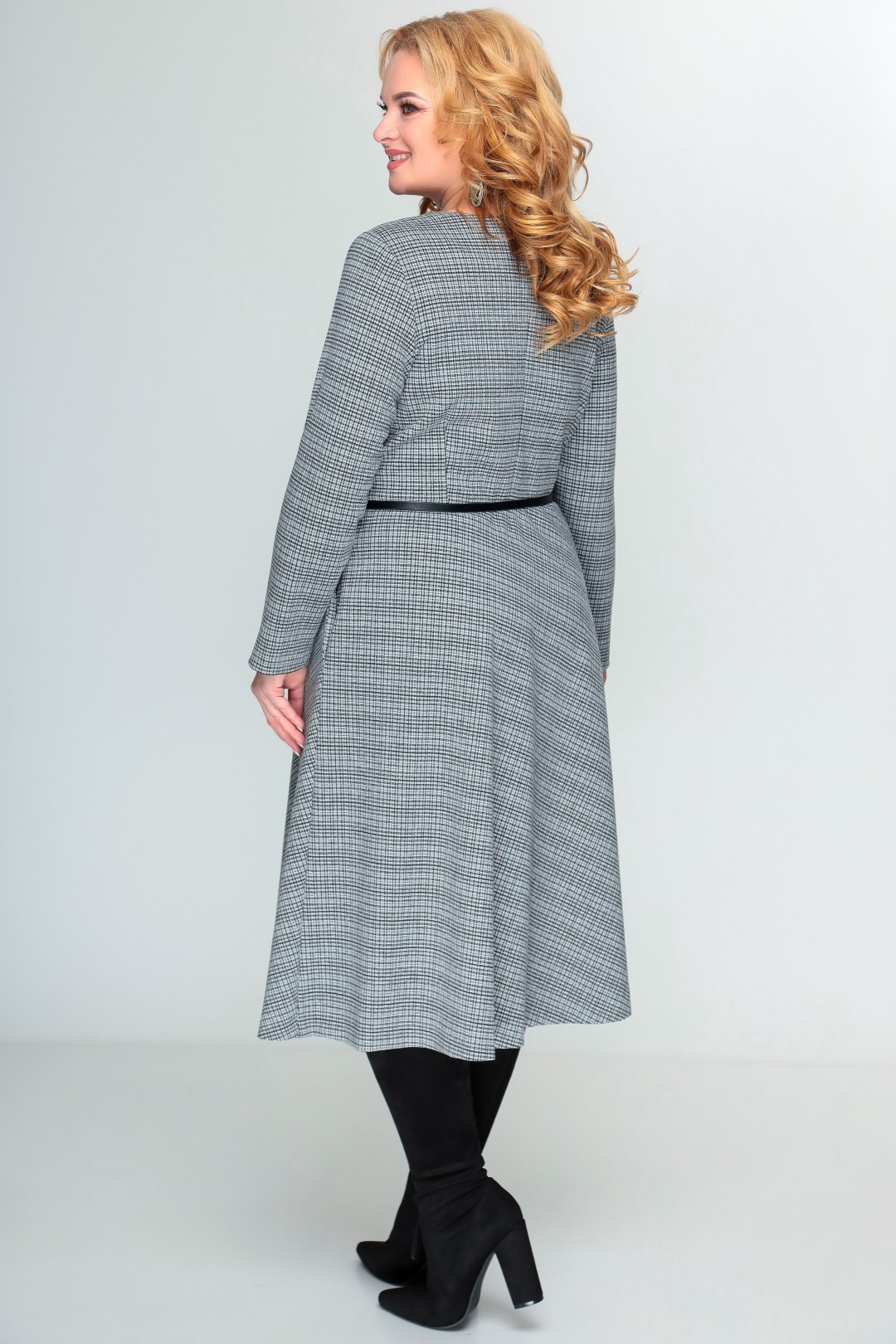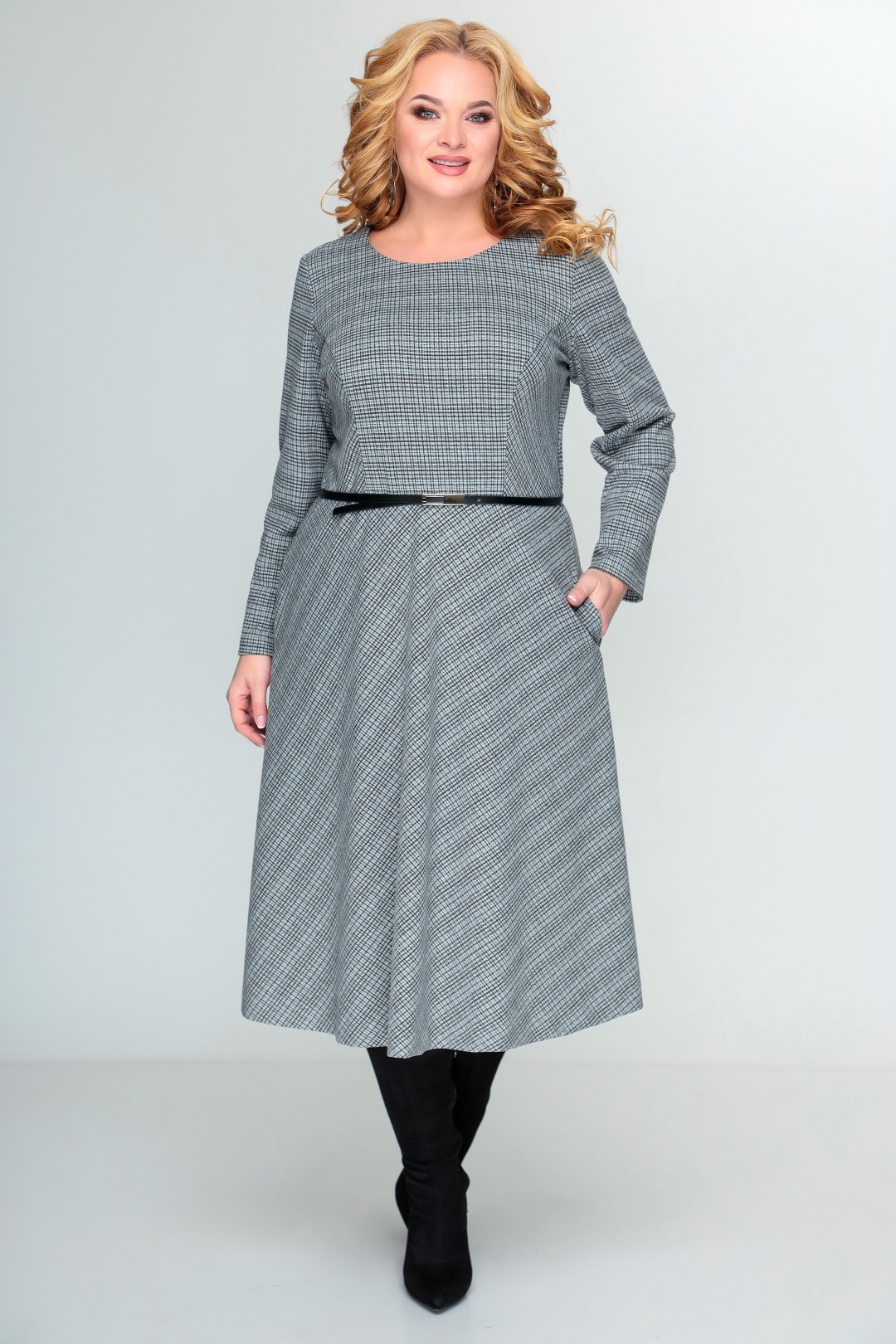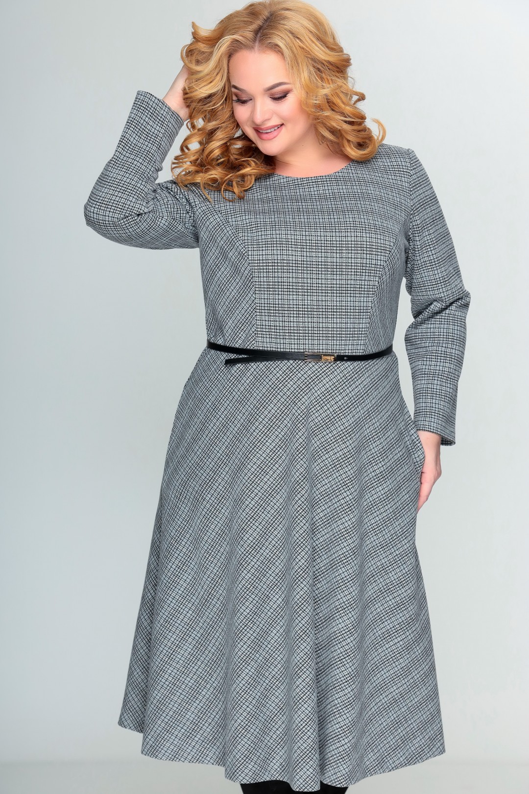 Платье женское полуприлегающего силуэта. Выполнено из трикотажного полотна. Платье отрезное по линии талии. По лифу переда расположены рельефы, по лифу спинки – талиевые вытачки. Нижняя часть платья А-силуэта. Спинка лифа платья со средним швом, в который вставлена потайная молния. Юбка платья переда и спинки цельнокроеные, выполнены по косой. В боковых швах юбки расположены карманы. Рукав втачной одношовный, длинный. В комплект входит ремень. Длина рукава 60 см (+ /- 1 см). Длина платья по среднему шву спинки 116 см (+/ - 1 см).