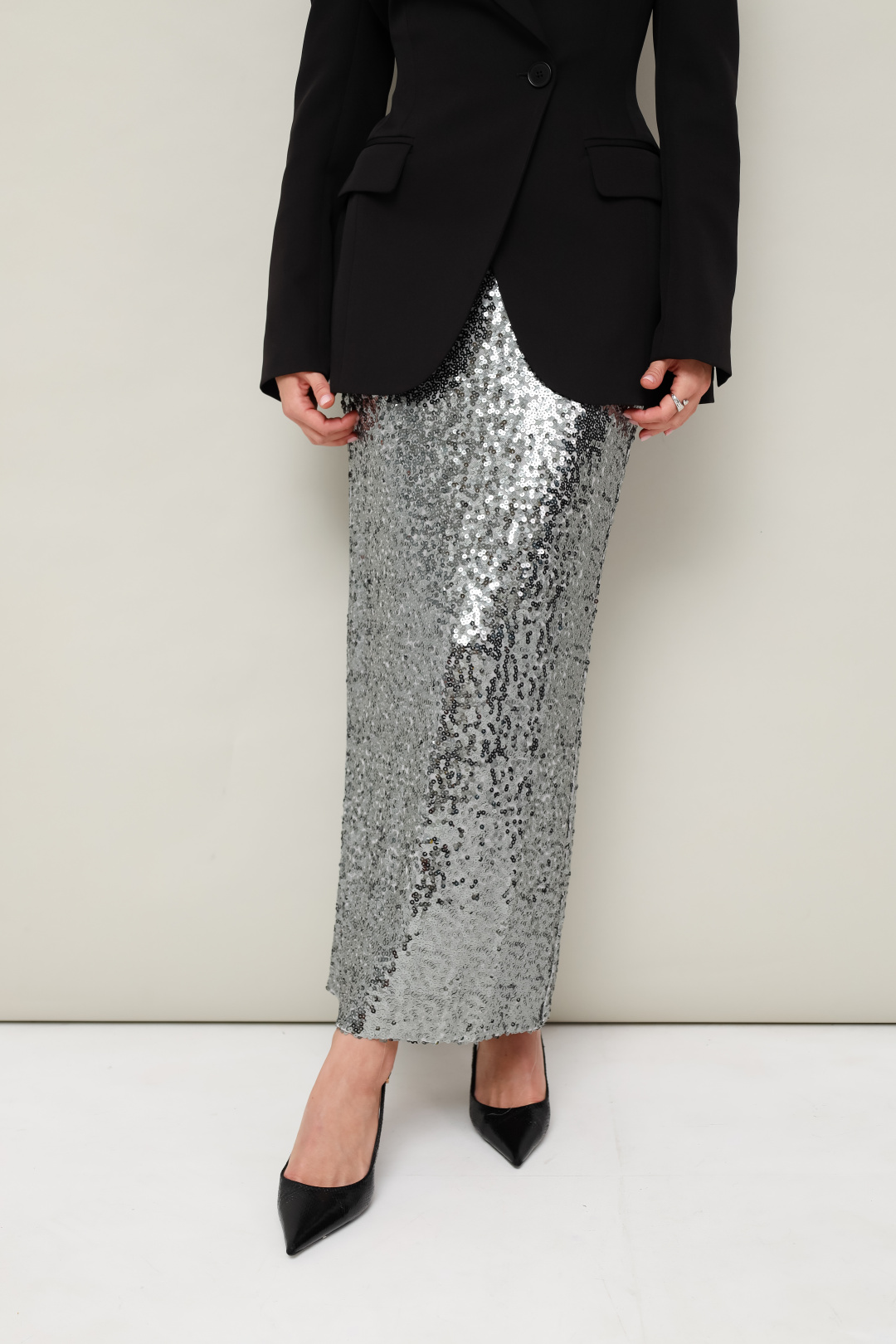 Элегантная серебряная юбка, декорированная мерцающими пайетками, является идеальным выбором для торжественных мероприятий. Юбка длиной миди с прямым полуприлегающим силуэтом элегантно облегает фигуру, создавая изысканный вид. Пояс на удобной резинке обеспечивает идеальную посадку, адаптируясь к вашим формам. Внутренняя подкладка гарантирует комфорт при ношении. Эта юбка станет изысканным дополнением к вашему гардеробу, подчеркивающим вашу утонченность и вкус.