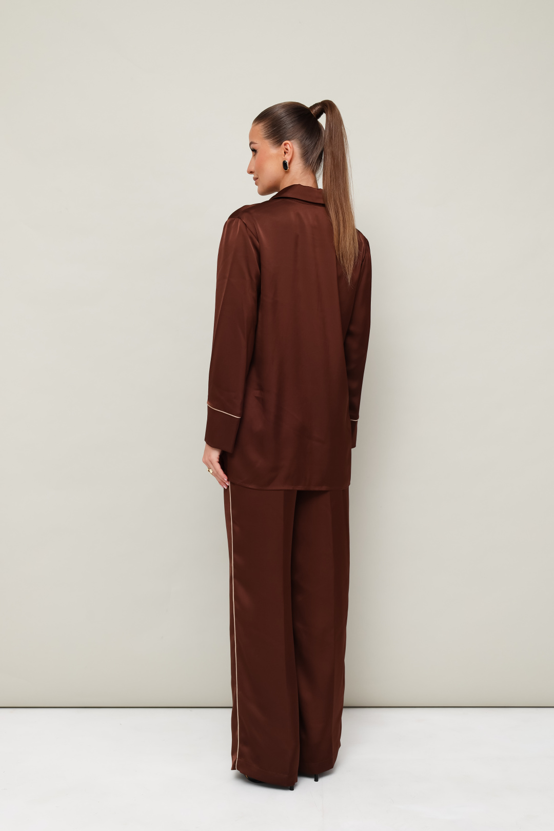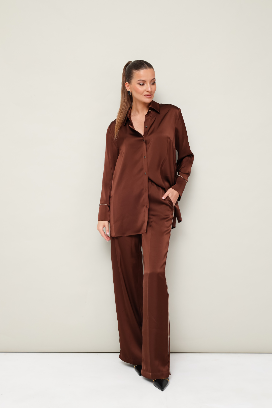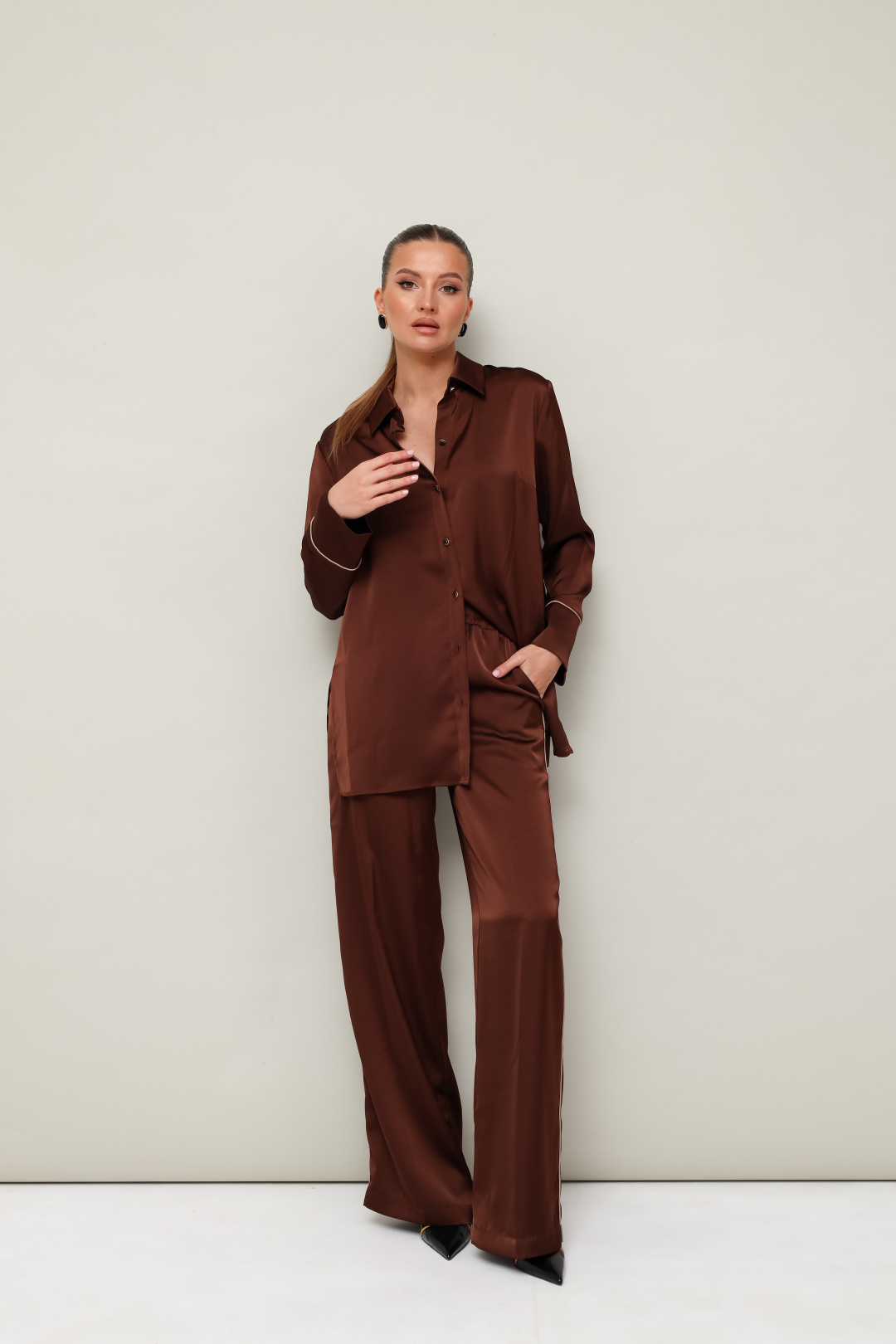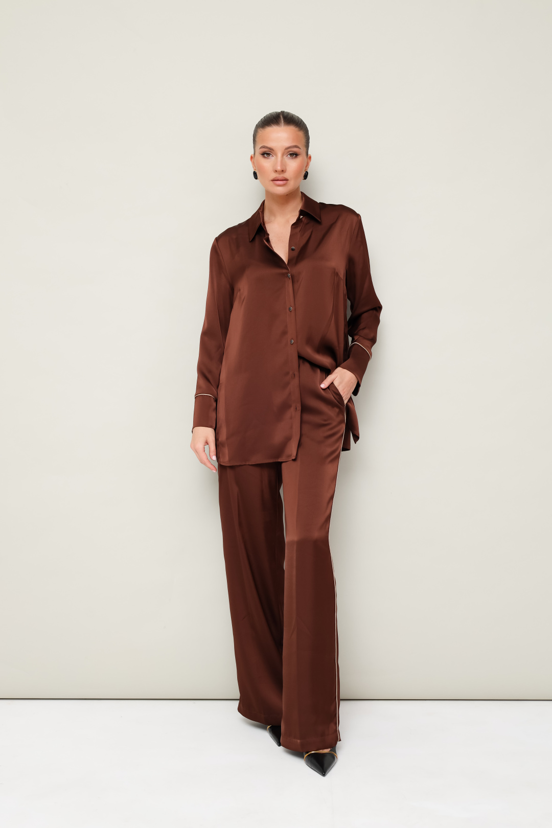 брюк, выполнен из струящейся ткани с