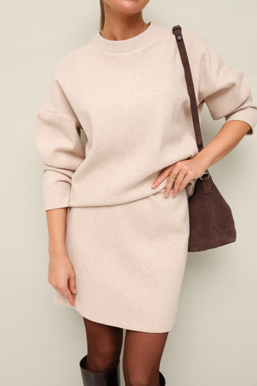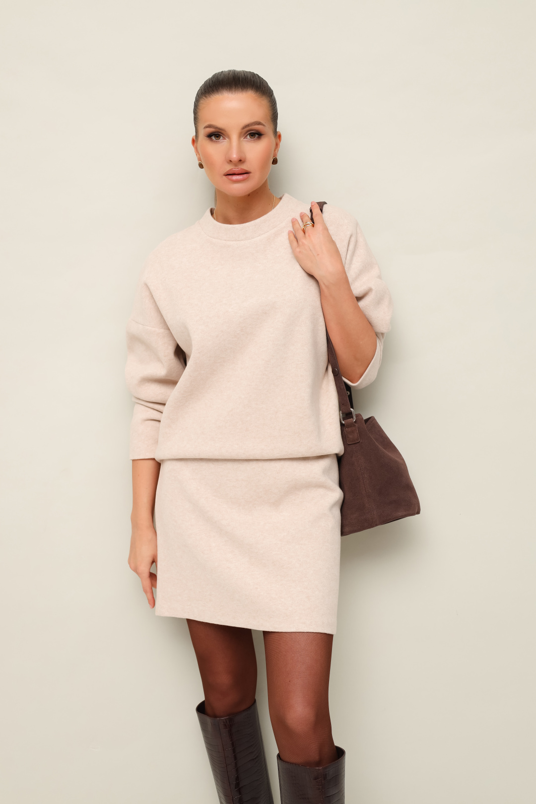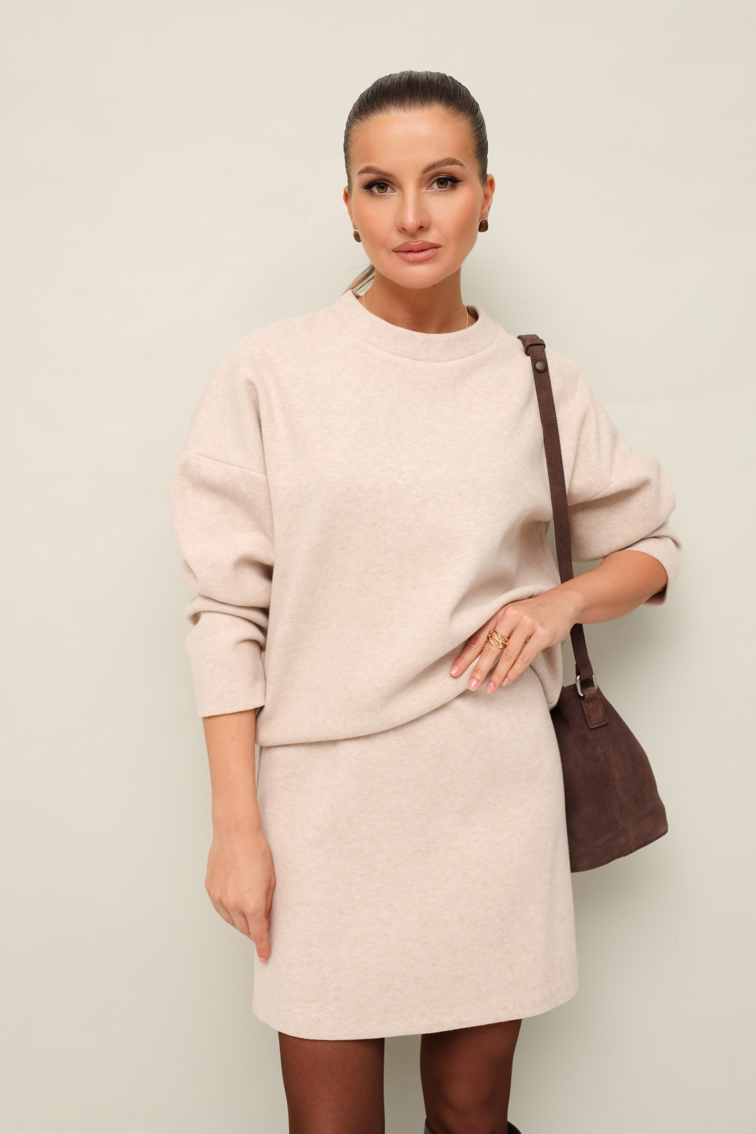 Комфортный трикотажный комплект, состоящий из джемпера и юбки. Джемпер со спущенной линией втачивания рукава. Юбка прямого кроя, пояс на резинке.