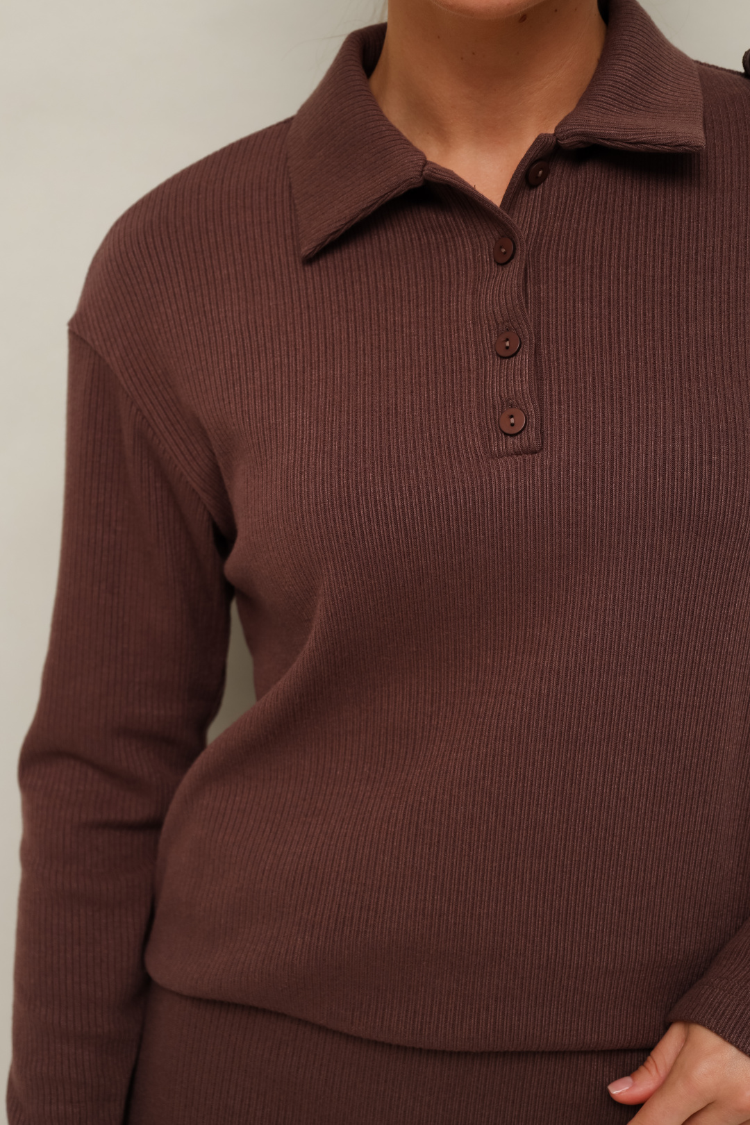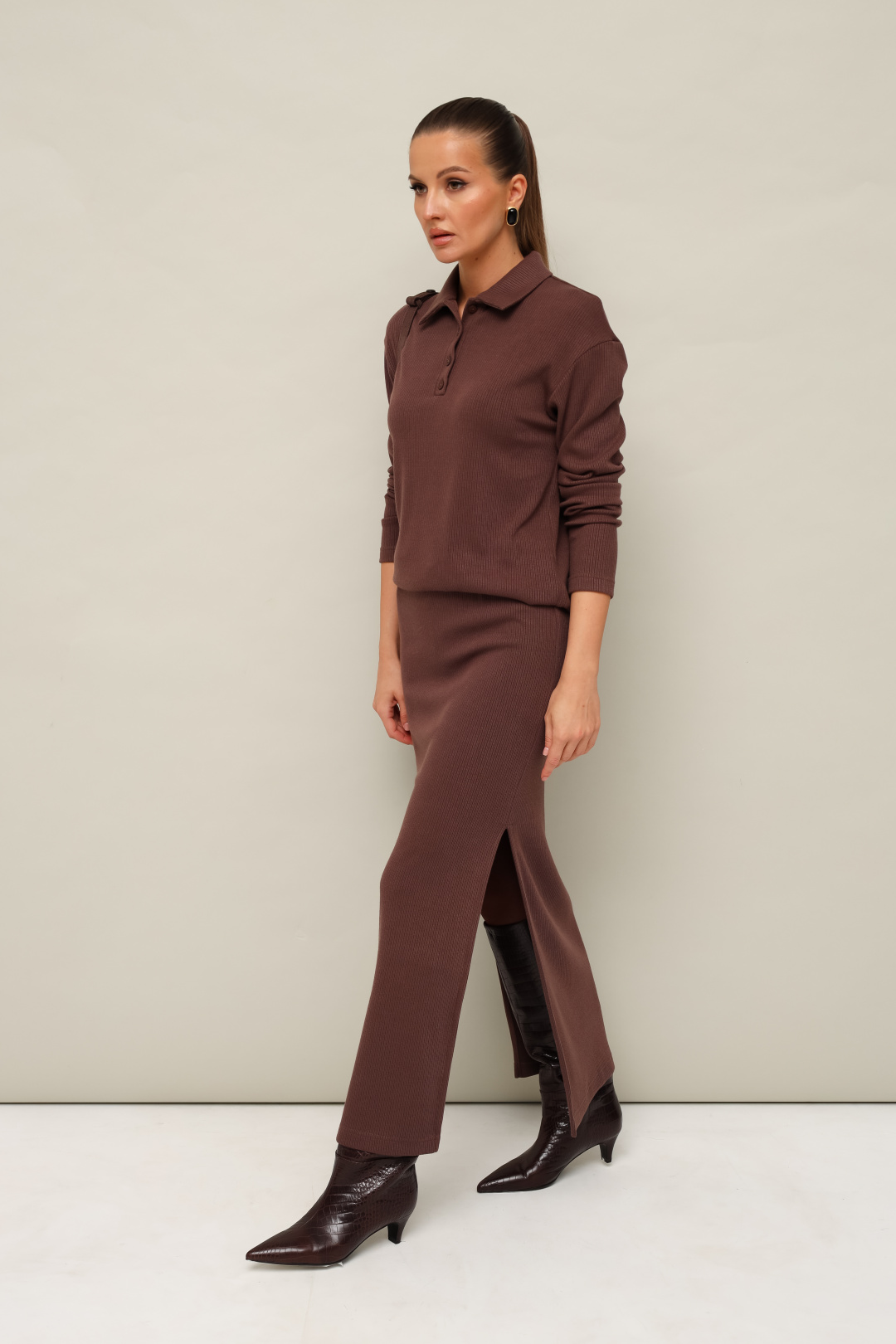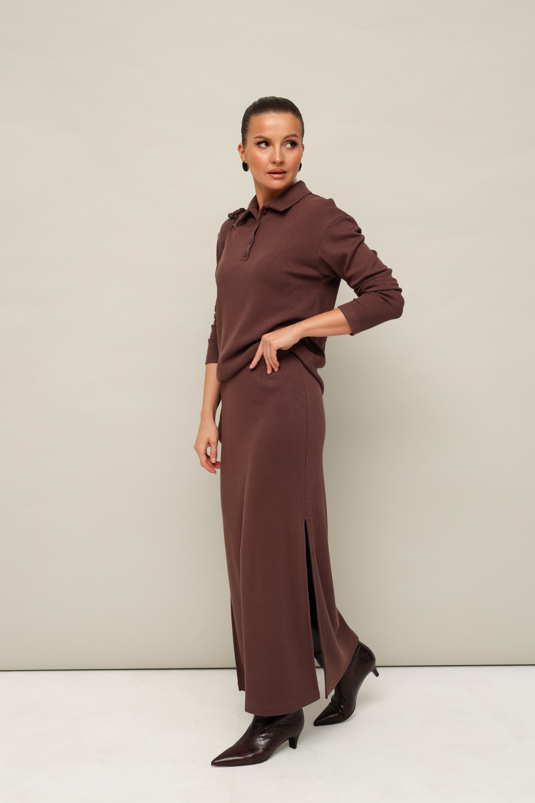 Комфортный трикотажный комплект, состоящий из поло и юбки. Поло с отложным воротником с цельнокроеной стойкой. Вырез горловины обработан притачными планками с застежкой на петли и пуговицы. Спущенная линия втачивания рукава. Юбка прямого кроя, пояс на резинке, в боковых швах обработаны высокие разрезы.