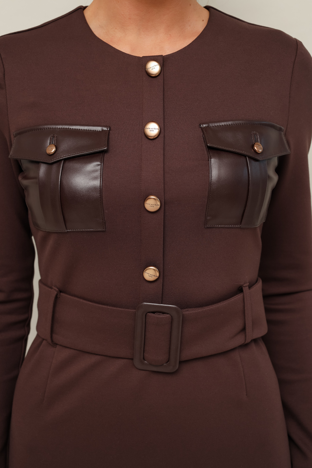Горловина округлой формы. По лифу обработана планка с пуговицами и нагрудные накладные карманы с клапанами. Длинные втачные рукава. Спинка с застежкой на потайную молнию в среднем шве. Для удобства движения сзади обработан разрез.