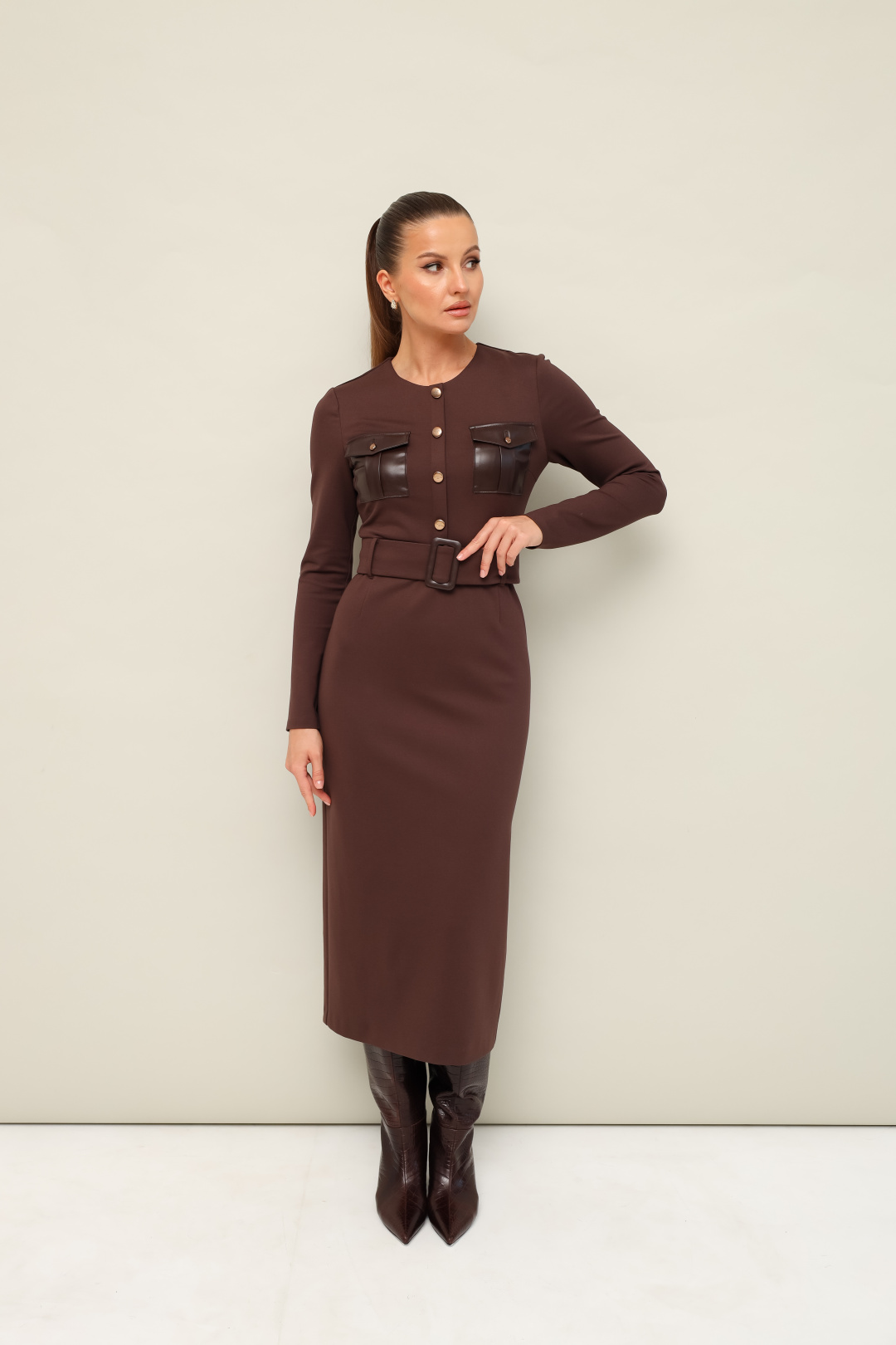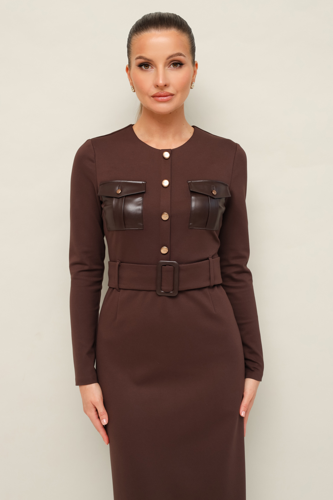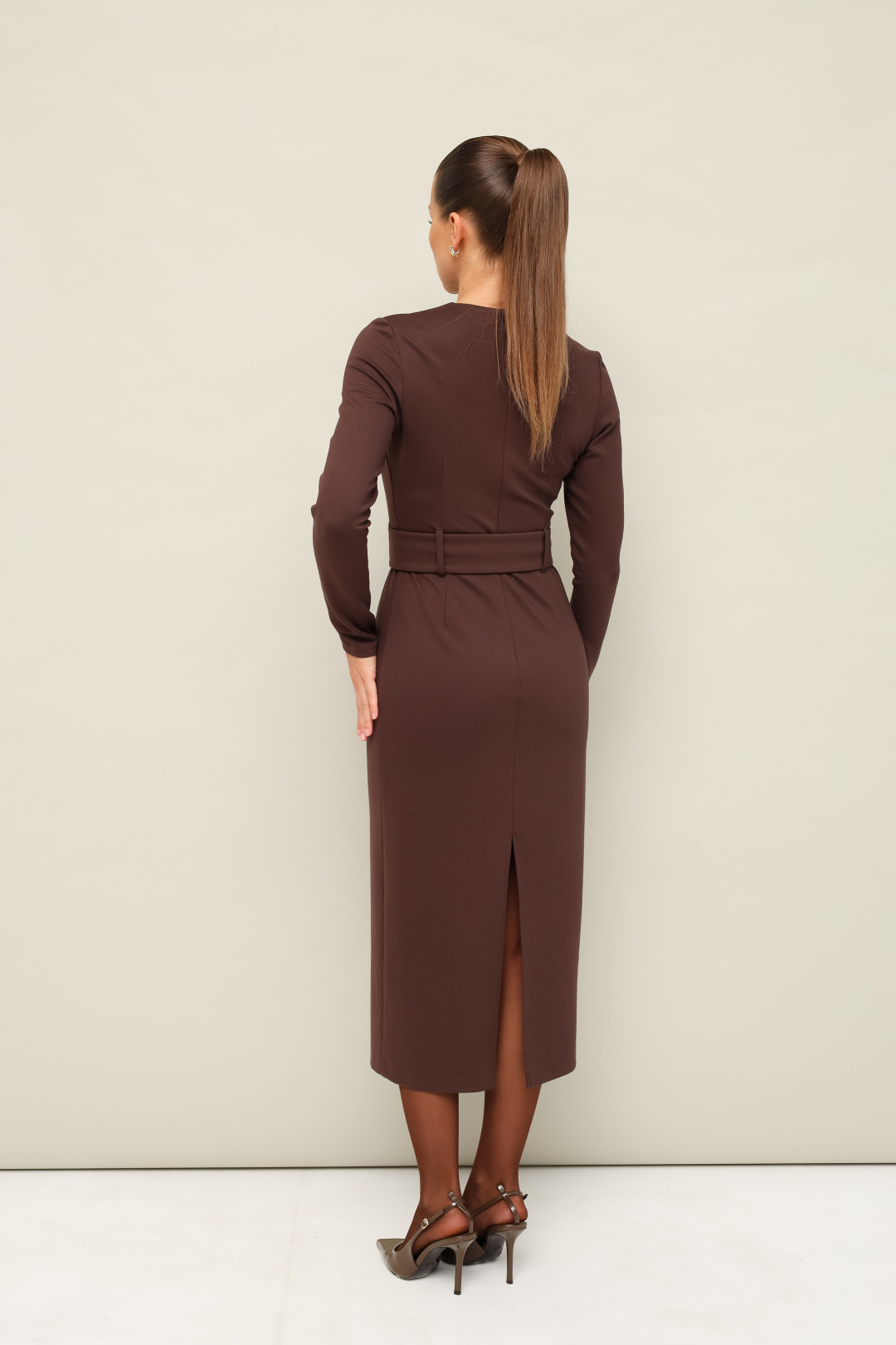 Платье прилегающего силуэта, отрезное по линии талии, выполнено из эластичного трикотажного полотна.