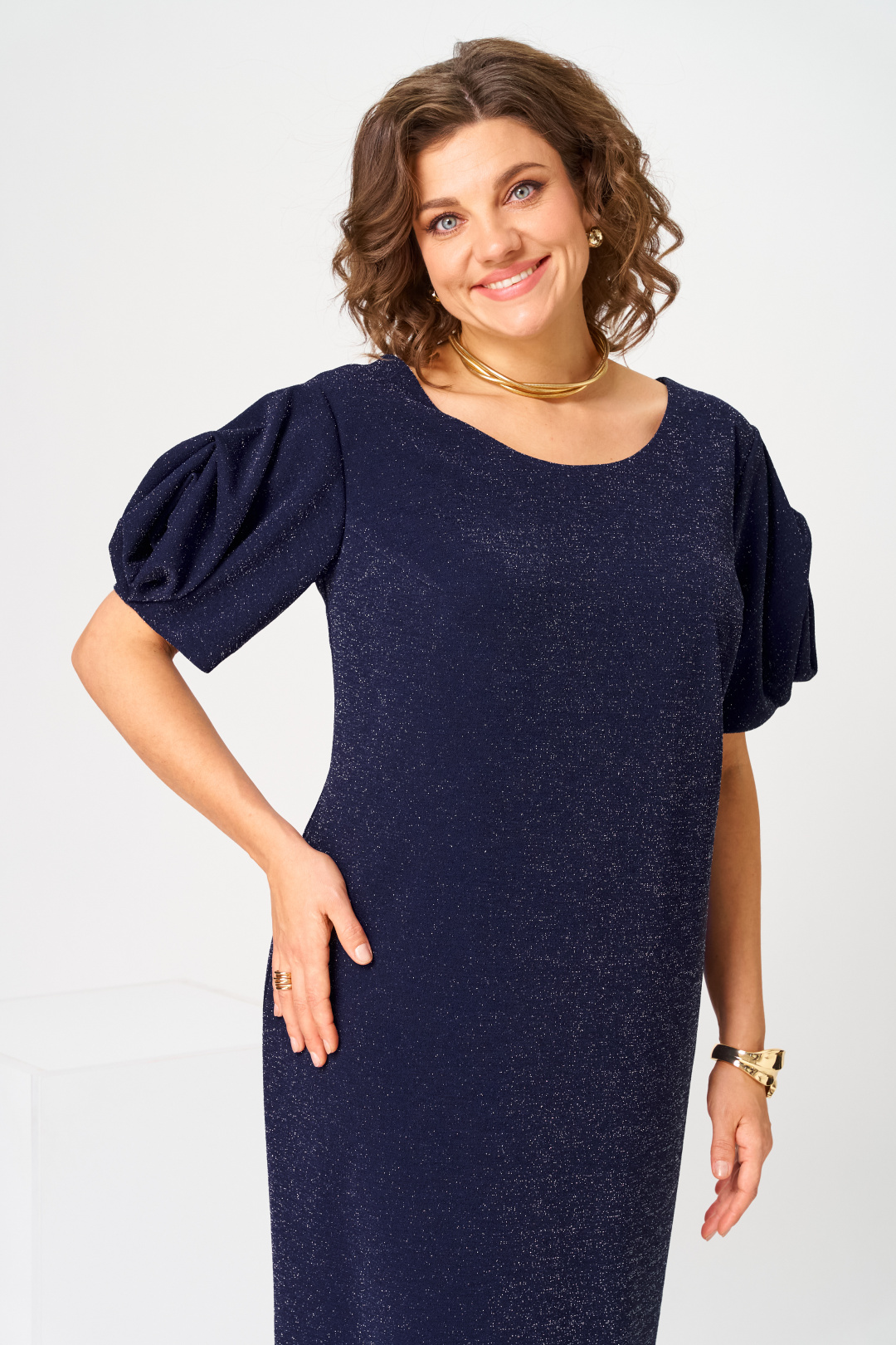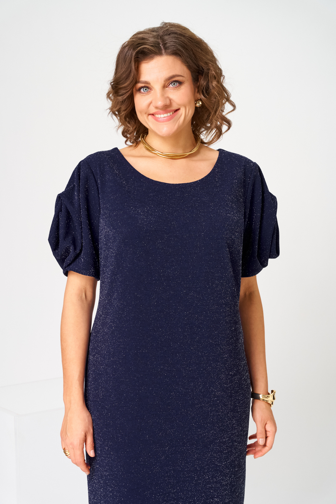 Платье женское, предназначено к нарядной торжественной одежде. Платье женское, полу прилегающего силуэта, длиной ниже колен. Перед с 2-мя нагрудными вытачками. Спинка с 2-мя таллиевыми вытачками, со средним швом, заканчивающимся шлицей. Горловина круглая, обточная, без воротника. Застёжка на потайную тесьму молнию в среднем шве спинки. Рукав втачной одно шовный, короткий, с обтачным низом, на подкладке. Рукав декоррирован цветком. Платье на подкладке. Платье с плечевыми накладками. Длина платья по спинке 110 см, длина рукава 26 см.