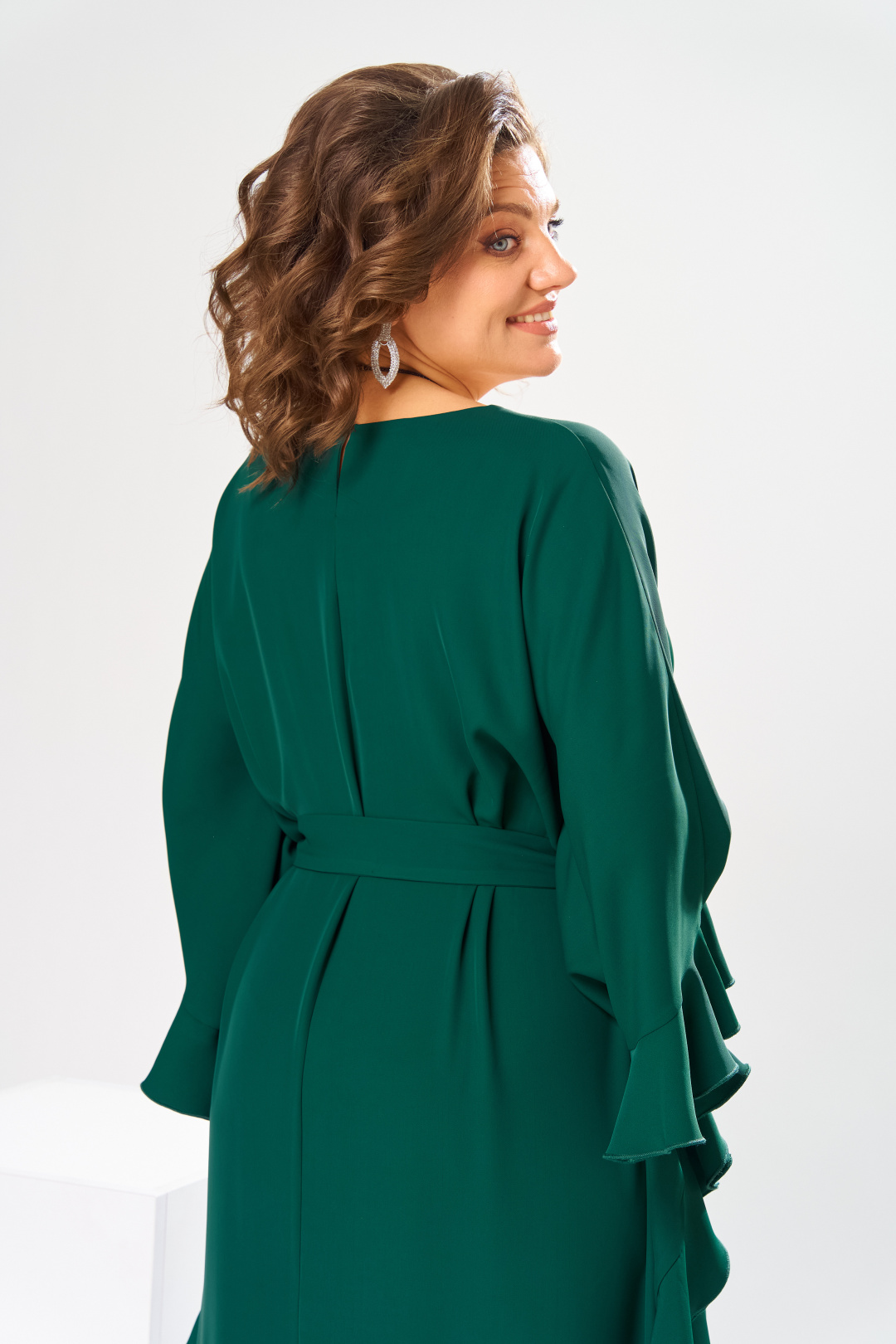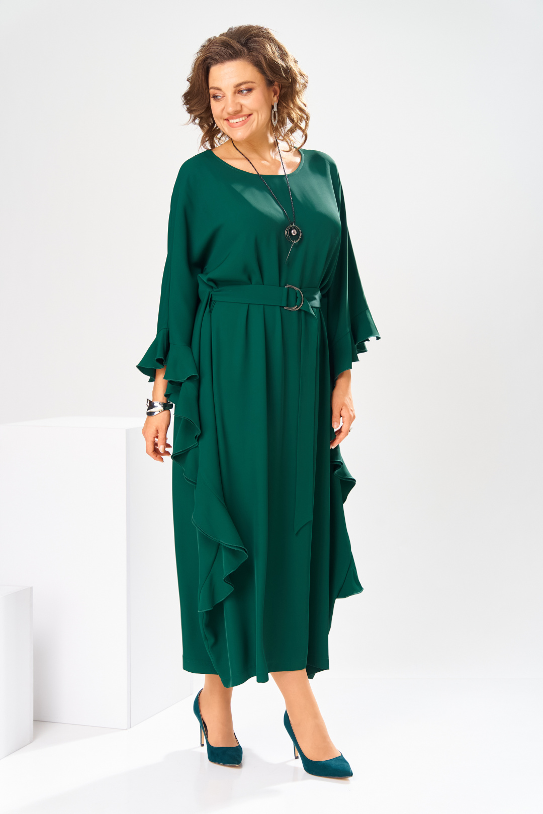 Платье женское, относится к нарядной торжественной одежде. Платье пончо свободного кроя, длинное. Перед цельнокроеный. Спинка со средним швом, вверху с разрезом, фиксирующимся по горловине на 1-ну навесную петлю и 1-ну пришивную пуговицу. Горловина круглая, обточная, без воротника, по переду горловины отделочная строчка 0,6 см. Рукав цельнокроеный удлинённый. Низ рукава и боковые швы декорированы приточной оборкой. По боковым швам зафиксирован уровень пройм и место расположения петель на уровне линии талии отделочными строчками. К платью прилагается съёмный пояс с пряжкой, фиксируемые на платье в петли на уровне линии талии. Платье без плечевых накладок. Длина спинки платья 132 см, ширина на уровне глубины проймы 66 см, ширина по линии талии 66 см, ширина плеча+длина рукава 56,5 см.
