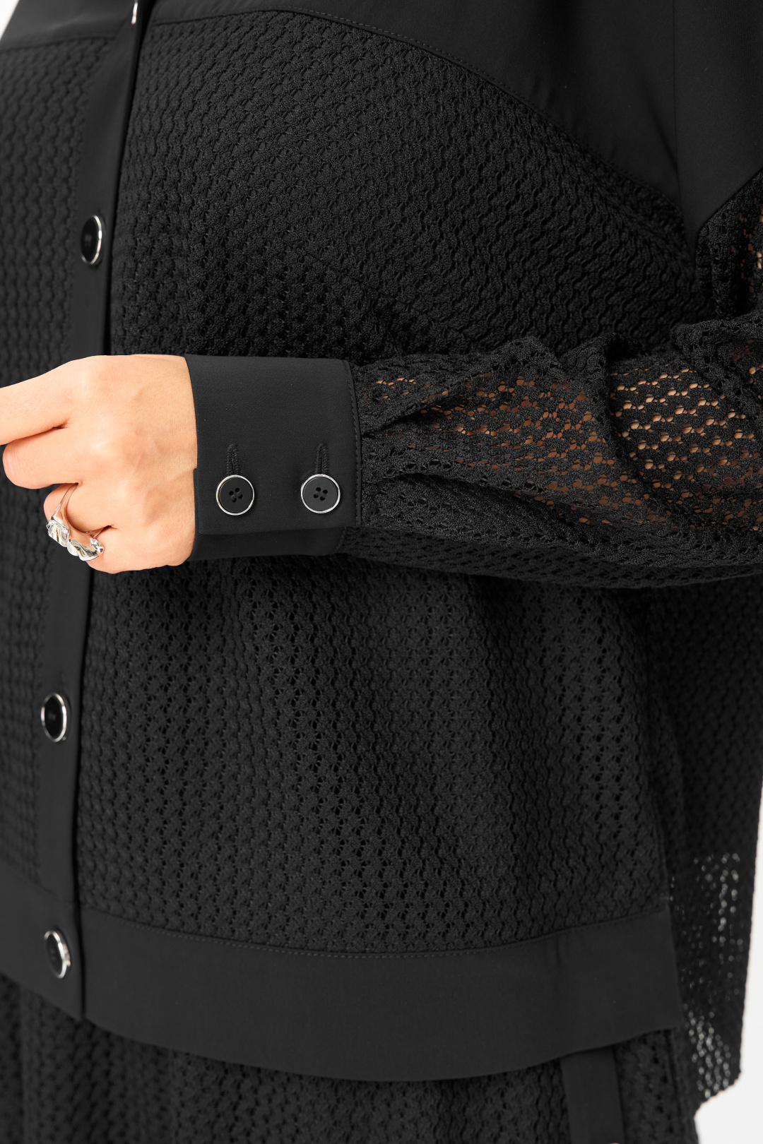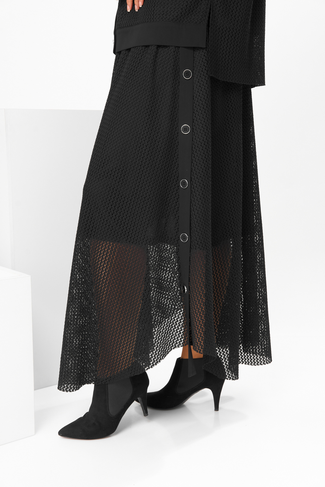 Костюм женский, предназначен для повседневной носки. Костюм женский, 2-х предметный жакет и юбка. Жакет прямого силуэта, длиной до линии бёдер с фигурным низом "ступенька". Перед с отрезными кокетками, с 2-мя нагрудными вытачками, с 2-мя притачными вертикальными планками, с 2-мя притачными горизонтальными планками внизу. На левой части кокетки настрочная аппликация. Спинка с отрезной кокеткой. Центральная часть переда и спинки на подкладке. Горловина круглая с втачным воротником, с закруглёнными концами. Застёжка центральная, бортовая, на вертикальных планках, на 5-ть обмётанных петель и 5-ть пришивных пуговиц. Жакет со спущенным плечом. Рукав втачной, длинный одно шовный на 2-е обмётанные петли и 2-е пришивные пуговицы. Жакет без плечевых накладок. Юбка женская, расширенная к низу, длинная с фигурным низом. Боковые швы с отлётными вертикальными планками, зафиксированными на юбке на 5-ть пришивных пуговиц на каждом боковом шве. Юбка с притачным поясом, собранным на эластичную тесьму, закреплённую 2-мя отделочными строчками. Юбка на подкладке. Длина спинки жакета 67 см, ширина рукава под проймой 21 см. Длина юбки по боковому шву без пояса 67 см