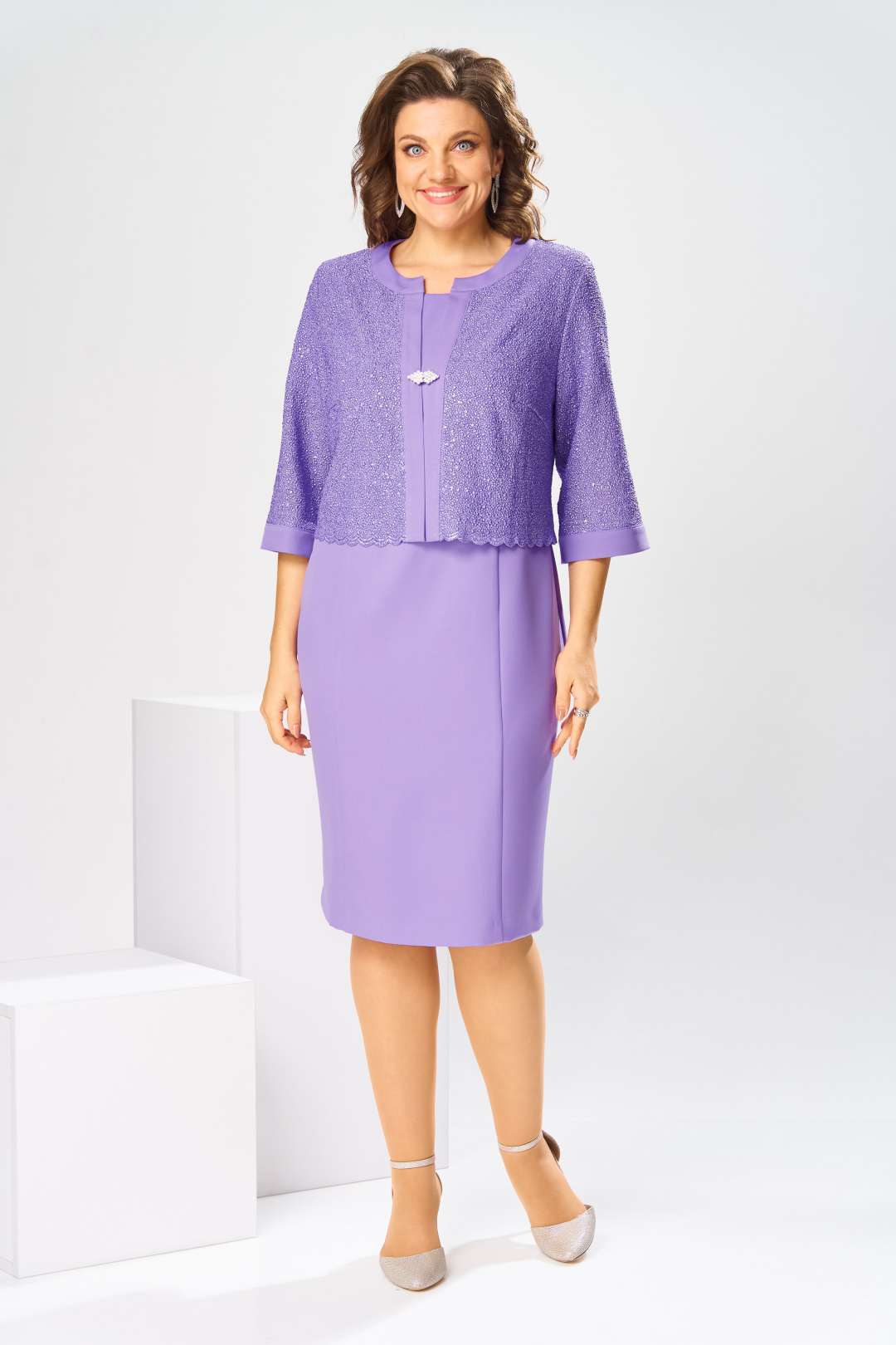 Комплект женский, относится к торжественно-нарядной одежде. Комплект женский, 2-х предметный, жакет и платье. Жакет женский прямого силуэта, длиной до линии талии, выполнен из кружевного полотна. Перед с 2-мя нагрудными вытачками, с 2-мя притачными вертикальными планками, с притачными планками по горловине. Спинка с притачной планкой по горловине. Горловина круглая, обточная, без воротника. Застёжка на декоративный пришивной крючок. Рукав втачной одно шовный, длиной 3/4 с притачной манжетой. Жакет без плечевых накладок. Платье женской длиной за колено, полу прилегающего силуэта. Перед с 2-мя отрезными бочками. Спинка с 2-мя таллиевыми вытачками, со средним швом, заканчивающимся шлицей. Горловина круглая, обточная, без воротника. Застёжка на потайную тесьму-молнию в среднем шве спинки. Рукав втачной, короткий, одно шовный. Платье с плечевыми накладками. Длина спинки жакета 45 см, длина рукава 41 см. Длина спинки платья 100 см, длина рукава 19 см.