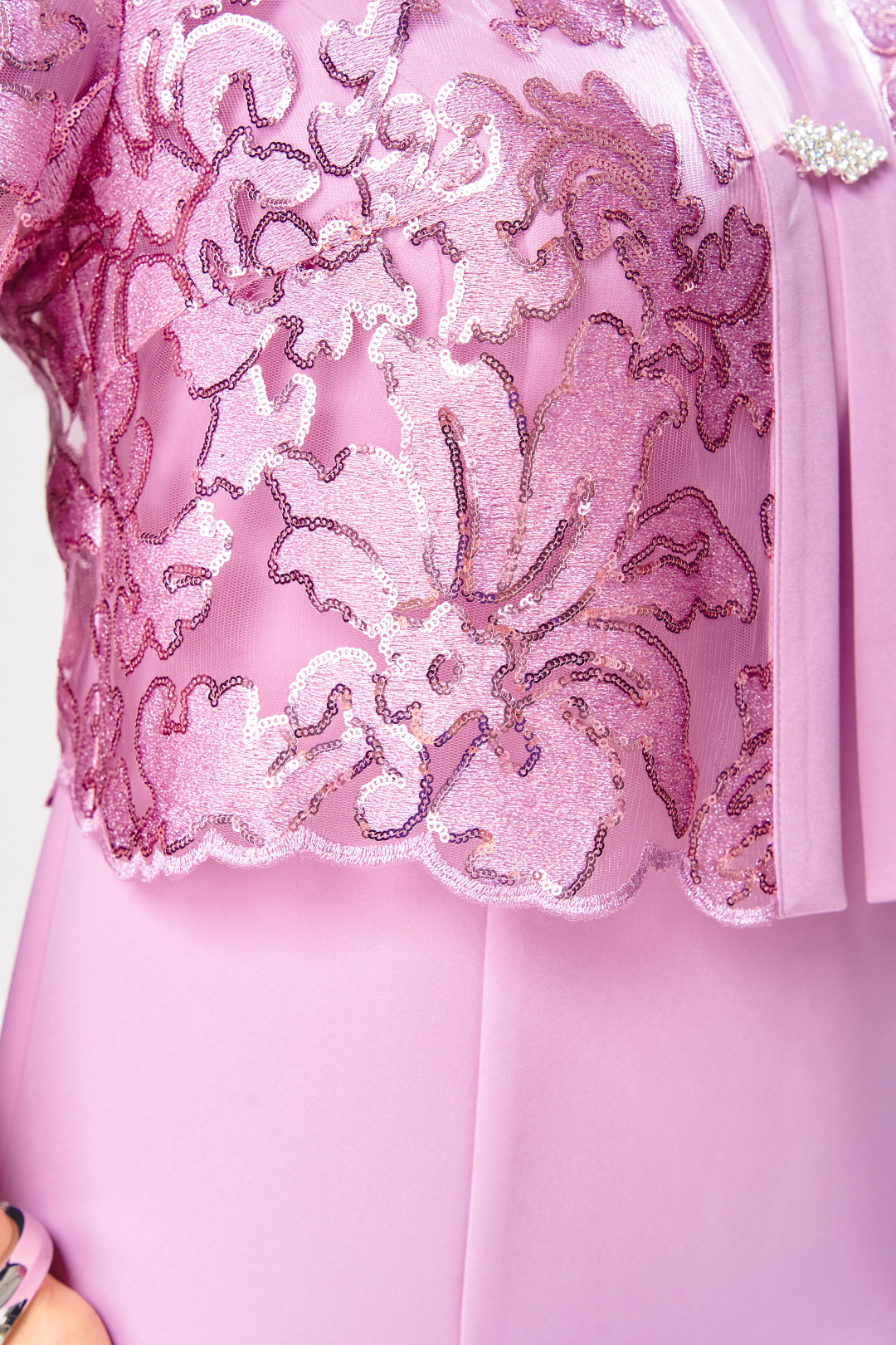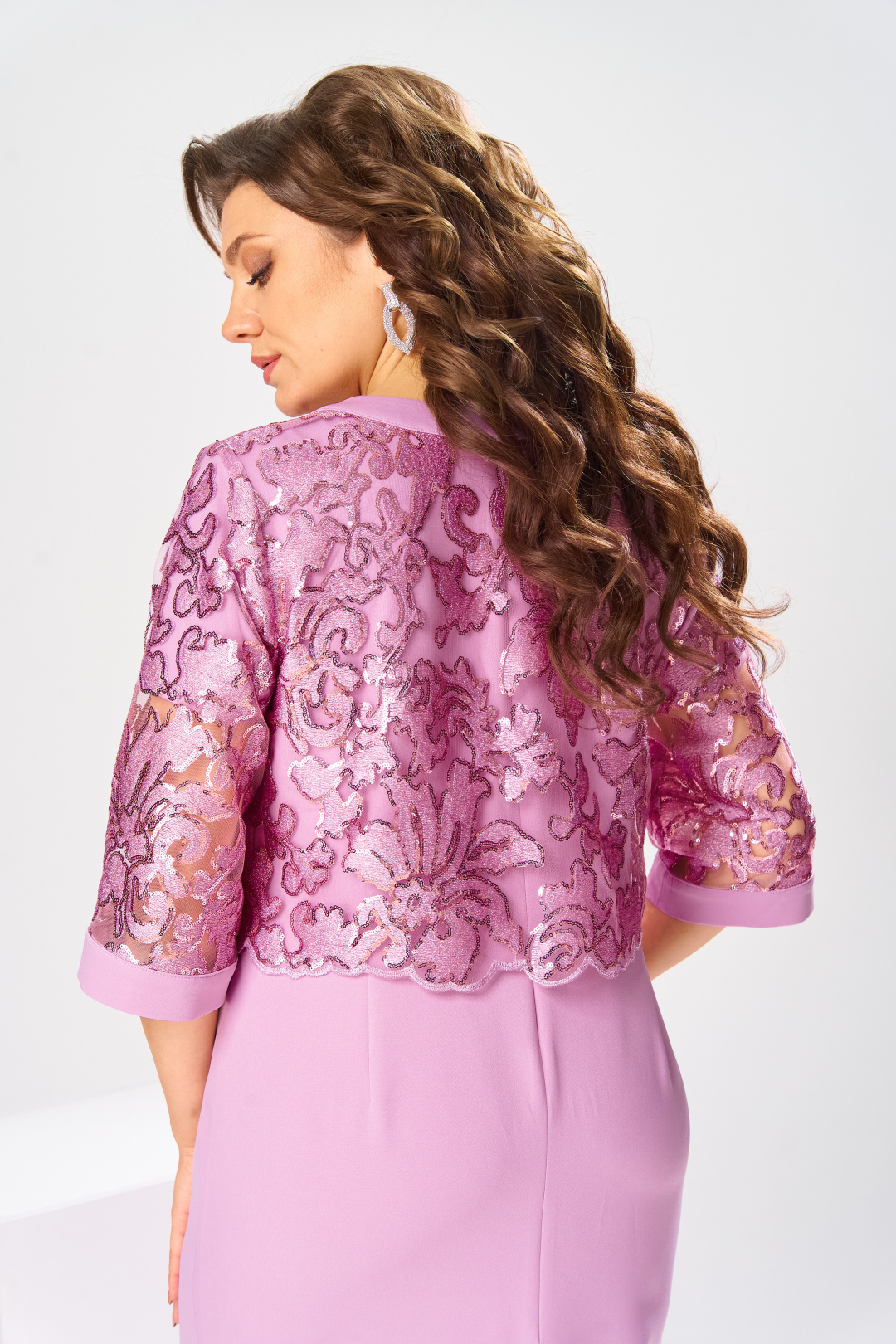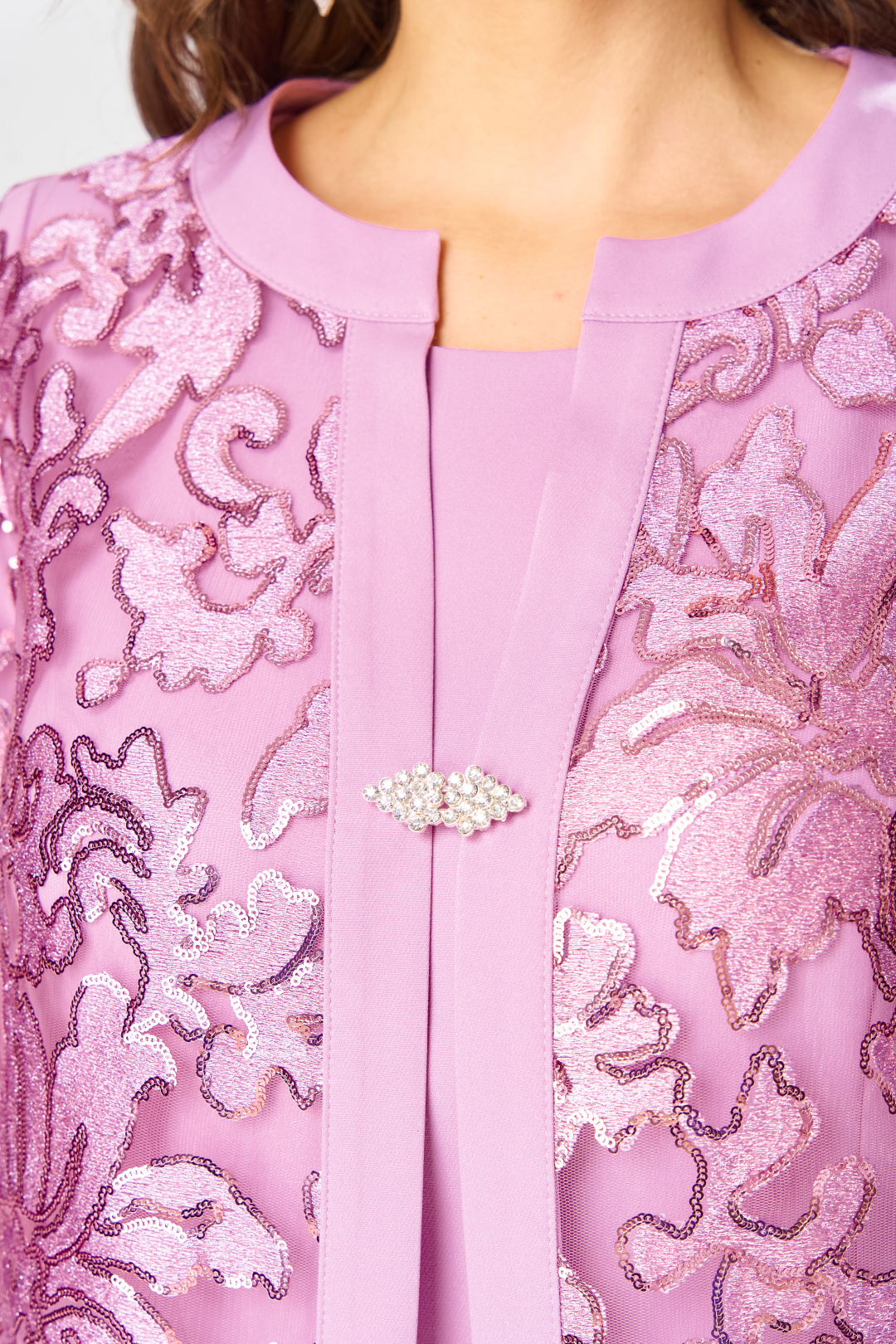Комплект женский, относится к торжественно-нарядной одежде. Комплект женский, 2-х предметный, жакет и платье. Жакет женский прямого силуэта, длиной до линии талии, выполнен из кружевного полотна. Перед с 2-мя нагрудными вытачками, с 2-мя притачными вертикальными планками, с притачными планками по горловине. Спинка с притачной планкой по горловине. Горловина круглая, обточная, без воротника. Застёжка на декоративный пришивной крючок. Рукав втачной одно шовный, длиной 3/4 с притачной манжетой. Жакет без плечевых накладок. Платье женской длиной за колено, полу прилегающего силуэта. Перед с 2-мя отрезными бочками. Спинка с 2-мя таллиевыми вытачками, со средним швом, заканчивающимся шлицей. Горловина круглая, обточная, без воротника. Застёжка на потайную тесьму-молнию в среднем шве спинки. Рукав втачной, короткий, одно шовный. Платье с плечевыми накладками. Длина спинки жакета 45 см, длина рукава 41 см. Длина спинки платья 100 см, длина рукава 19 см.
