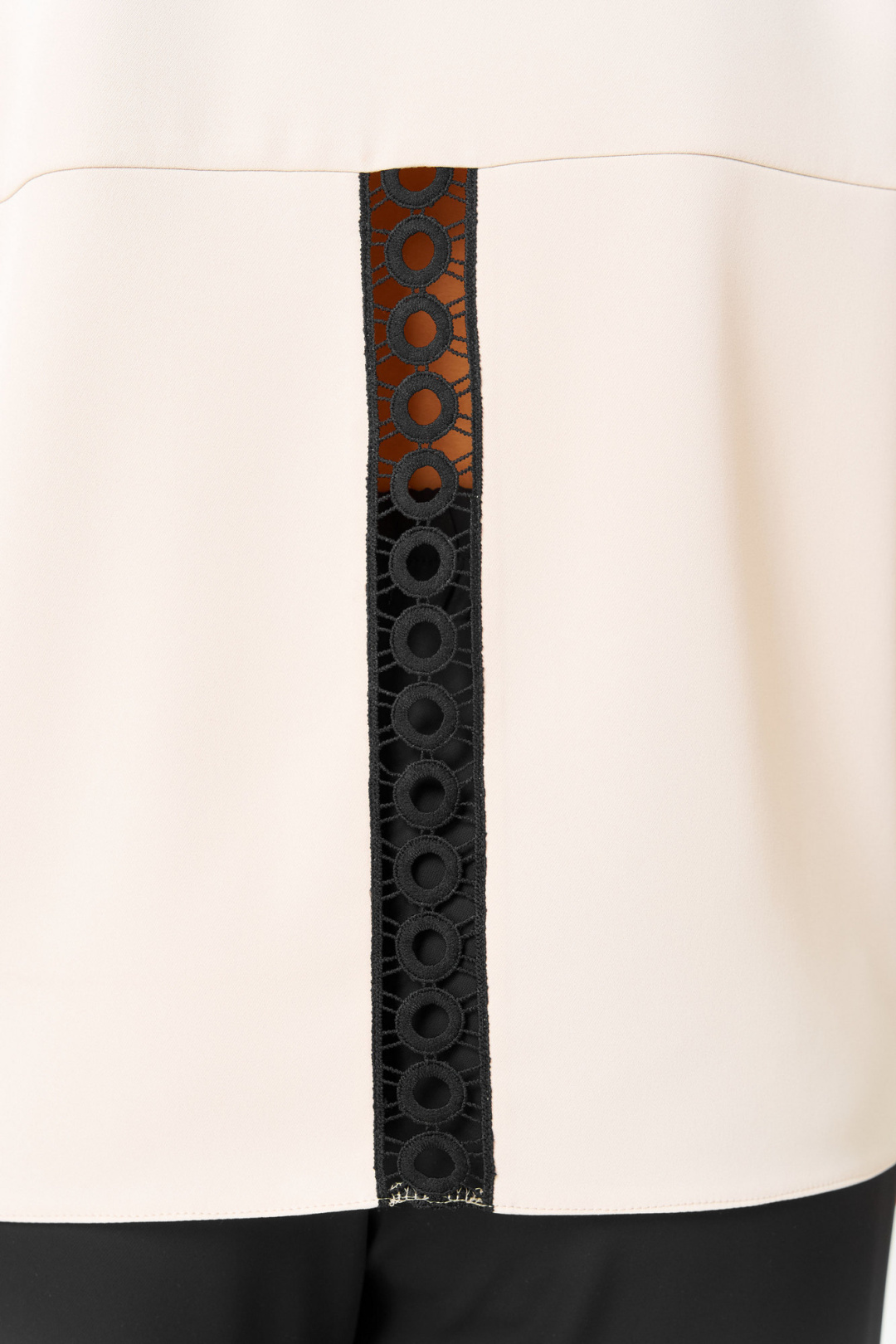 Блузка женская из текстильной ткани с цельнокроеным рукавом. Прямого силуэта. По спинке расположен подрез. В шов вставлено кружево. Рукав 3/4, низ рукава с манжетой. По плечевому шву вставлено кружево. Вырез лодочка. Обработан притачной бейкой.