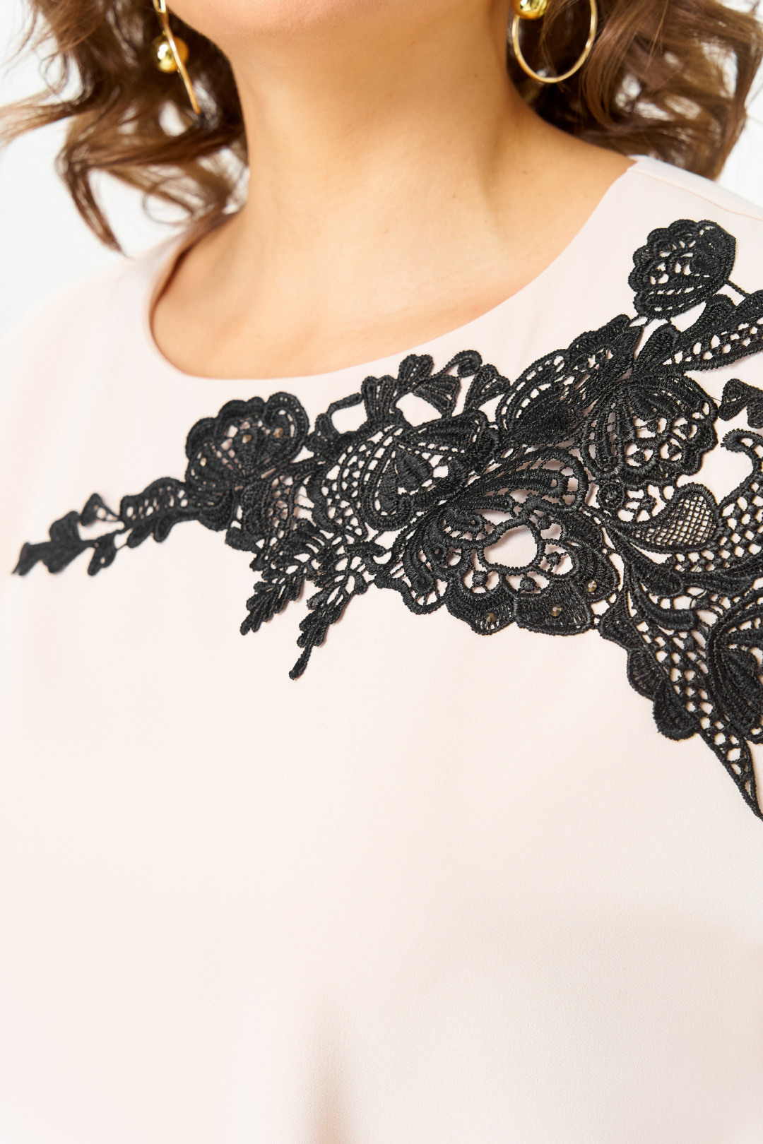 Блузка женская из текстильной ткани с цельнокроеным рукавом. Прямого силуэта. По переду блузки настрочена аппликация. По спинке расположен средний шов. Рукав 3/4, низ рукава с манжетой. Вырез горловины круглый, обработан обтачкой. Блузка застегивается на петлю-пуговицу.