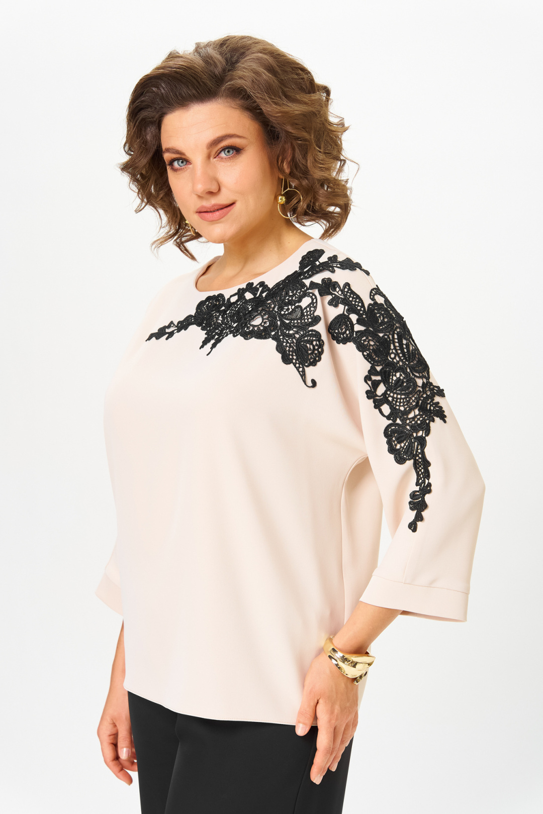 Блузка женская из текстильной ткани с цельнокроеным рукавом. Прямого силуэта. По переду блузки настрочена аппликация. По спинке расположен средний шов. Рукав 3/4, низ рукава с манжетой. Вырез горловины круглый, обработан обтачкой. Блузка застегивается на петлю-пуговицу.