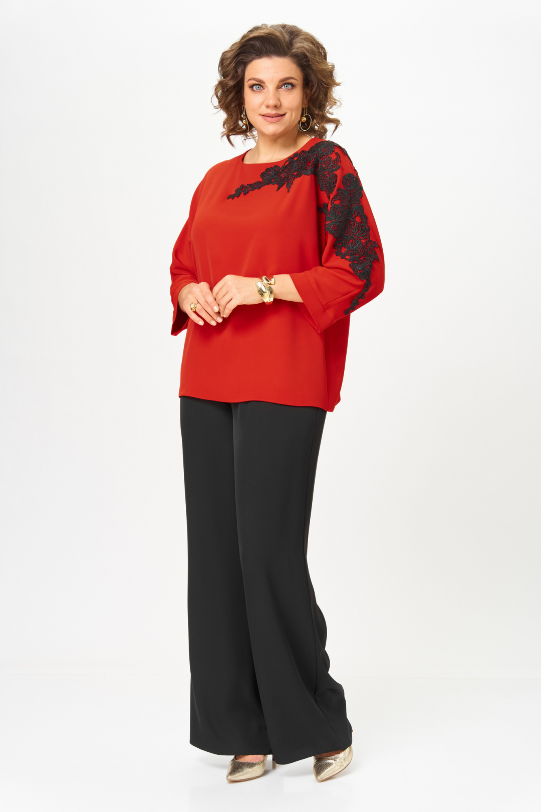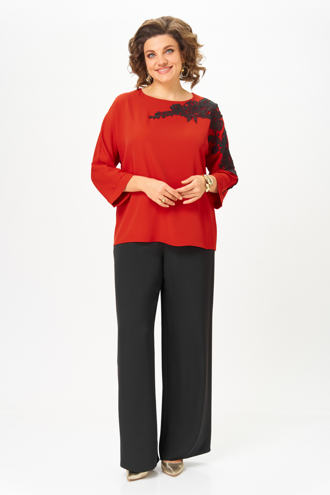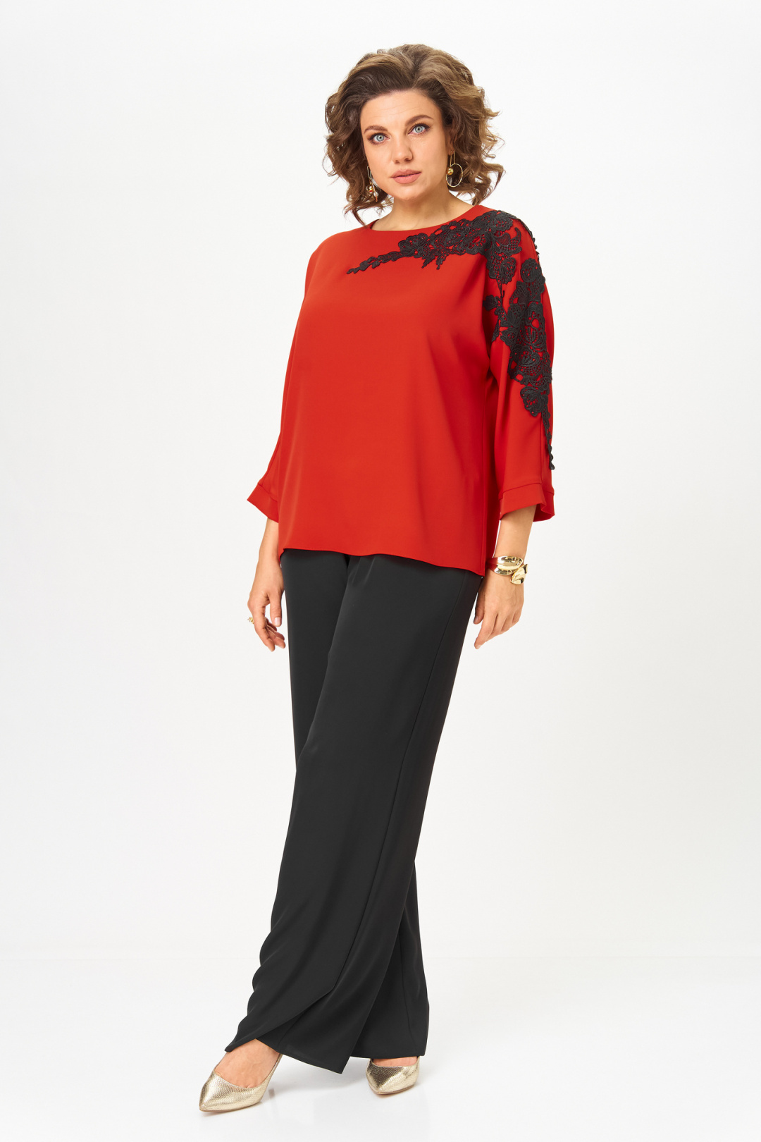 Блузка женская из текстильной ткани с цельнокроеным рукавом. Прямого силуэта. По переду блузки настрочена аппликация. По спинке расположен средний шов. Рукав 3/4, низ рукава с манжетой. Вырез горловины круглый, обработан обтачкой. Блузка застегивается на петлю-пуговицу.