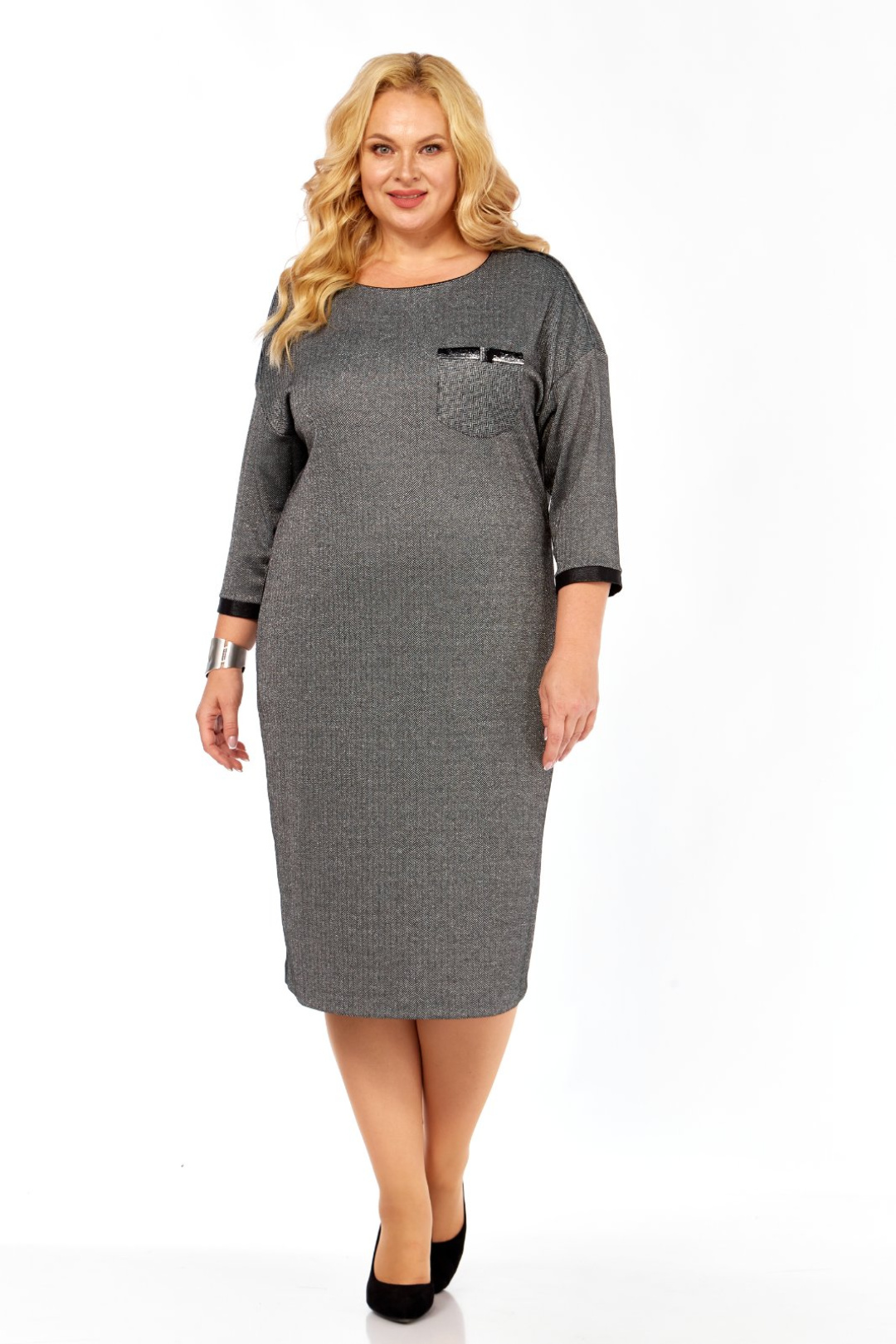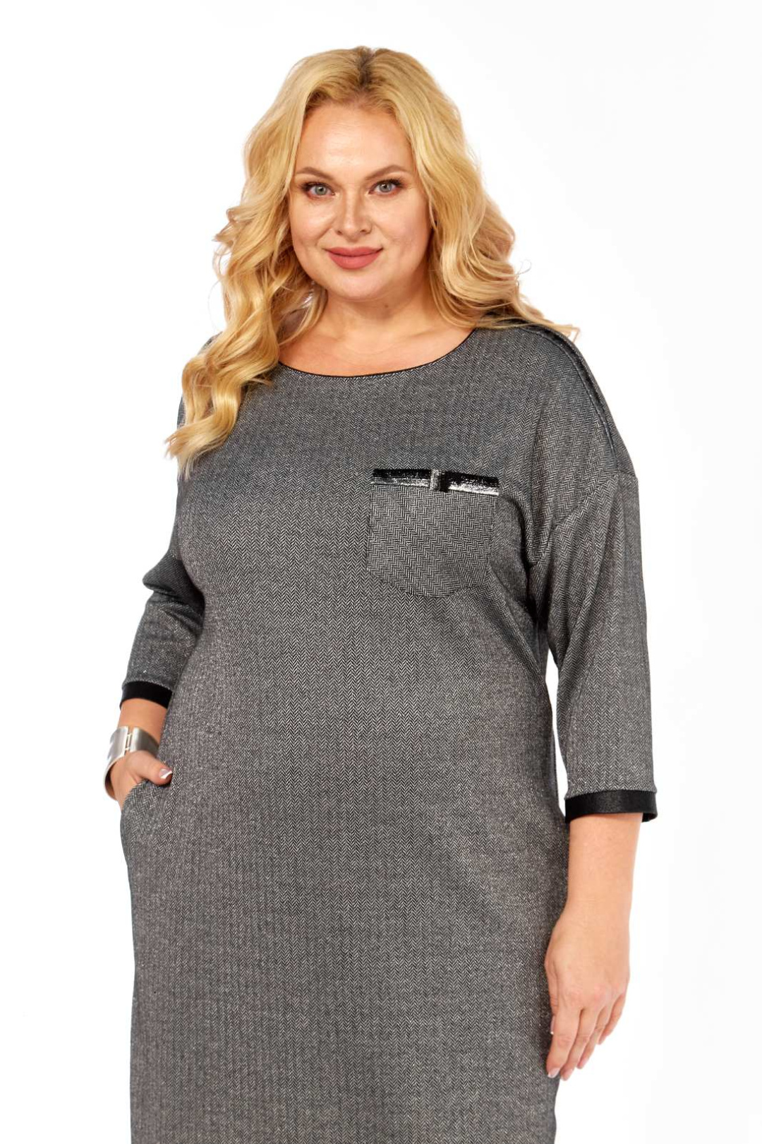 Силуэт полуприлегающий. Рукав со спущенной линией плеча. Внизу рукава манжеты контрастного цвета. Длина рукава от горловины 55 см. Горловина круглая, оформлена контрастным кантиком. В верхней части переда, слева, расположен накладной карман. Плечевые швы и карман декорированы пришивной отделочной тесьмой. По бокам платье отделано вставками контрастного цвета. В боковых швах на уровне бёдер выполнены потайные карманы. Длина платья по спинке 106 см. Платье выполнено из трикотажного полотна с люрексом.
