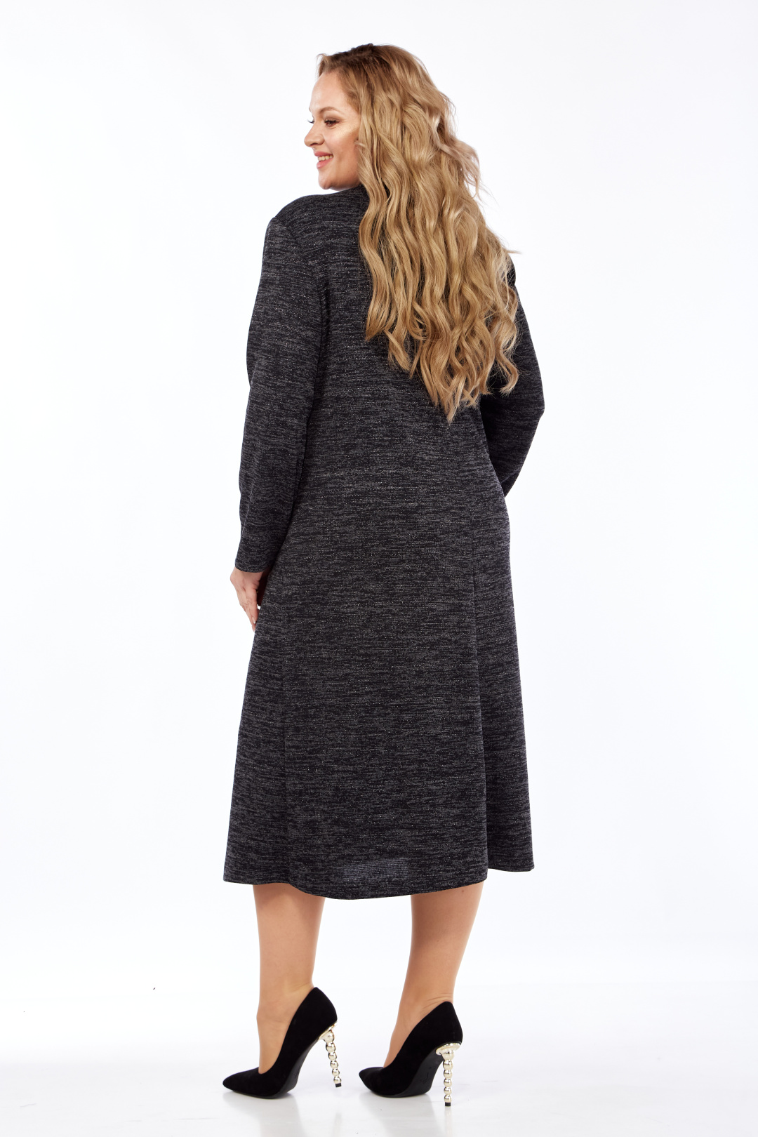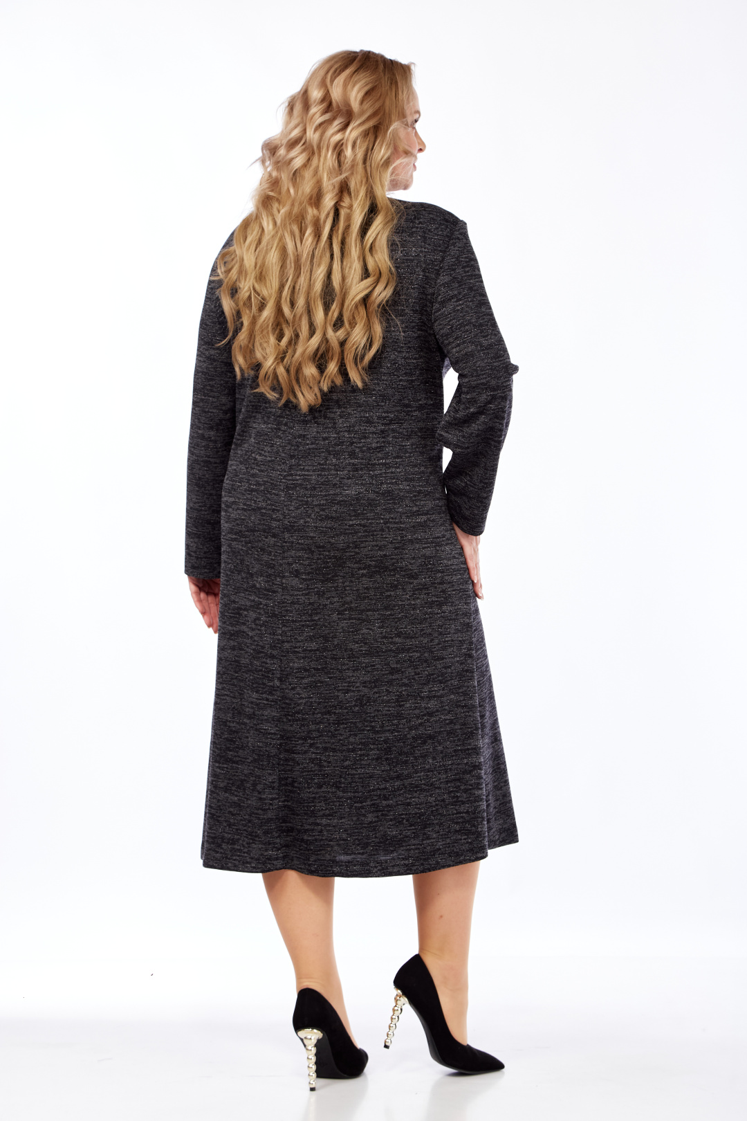 Силуэт полуприлегающий, расширенный к низу. Рукав втачной, одношовный. Низ рукава драпируется патой с застёжкой на пуговицу. Длина рукава 58 см. Горловина платья закруглённой формы, оформлена отрезной бейкой. Перед платья с отрезной кокеткой и с нагрудными рельефами от кокетки, уходящими в боковой шов. По центру переда застрочены 8 вертикальных складок, между двумя центральными пришиты 6 пуговиц. Внизу рельефов выполнены потайные карманы. Спинка со средним швом. Длина платья 118см. Платье выполнено из трикотажного полотна с люрексом
