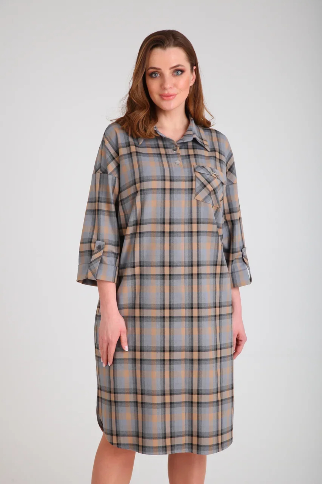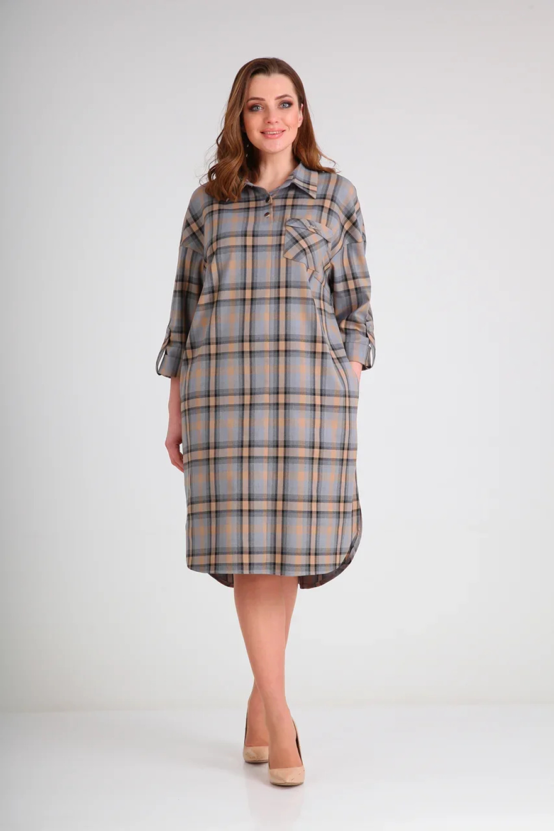 Силуэт полуприлегающий. Рукав со спущенной линией плеча. Внизу рукава выполнены отвороты, закреплённые патой с застёжкой на пуговицу. Длина рукава от горловины 60 см. Воротник рубашечного типа, на стойке. Перед со средним швом и нагрудными вытачками. Вверху по среднему шву выполнена застёжка на две пуговицы. В верхней части переда расположен накладной карман с отворотом, дополнительно украшенный металлической пластинкой. В боковых швах платья на уровне бёдер выполнены потайные карманы. Внизу боковых швов платье с разрезами. Длина платья по спинке 106см. Платье выполнено из ткани костюмно-плательной группы.