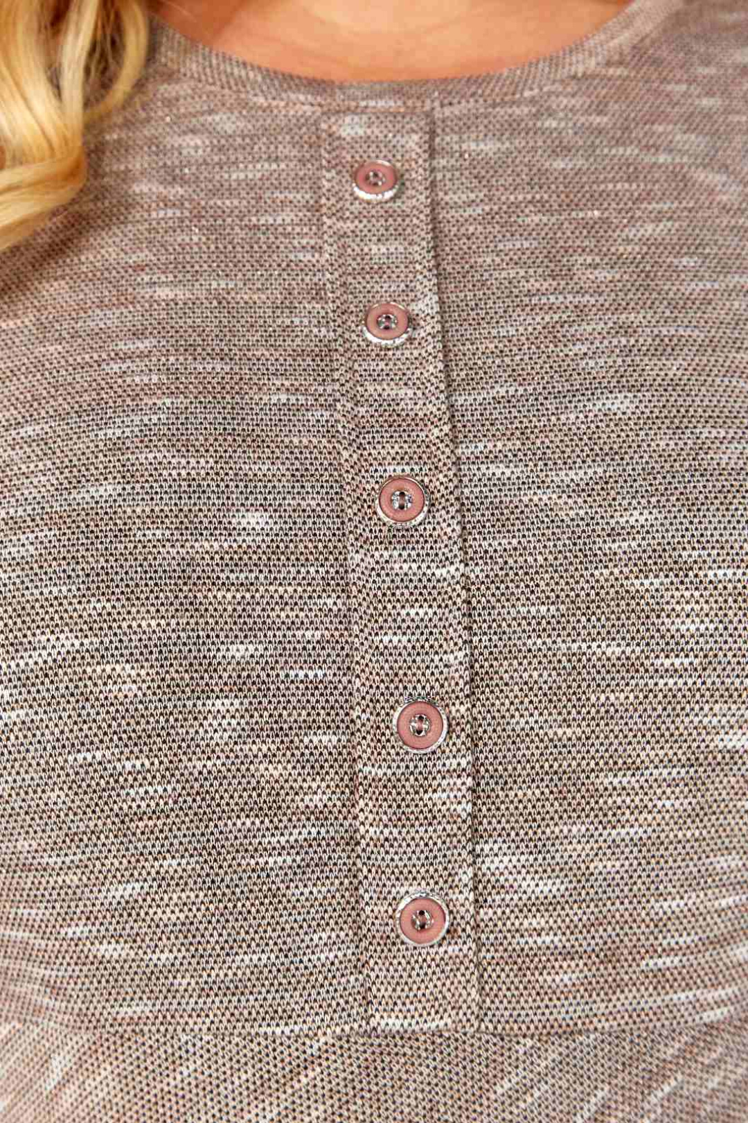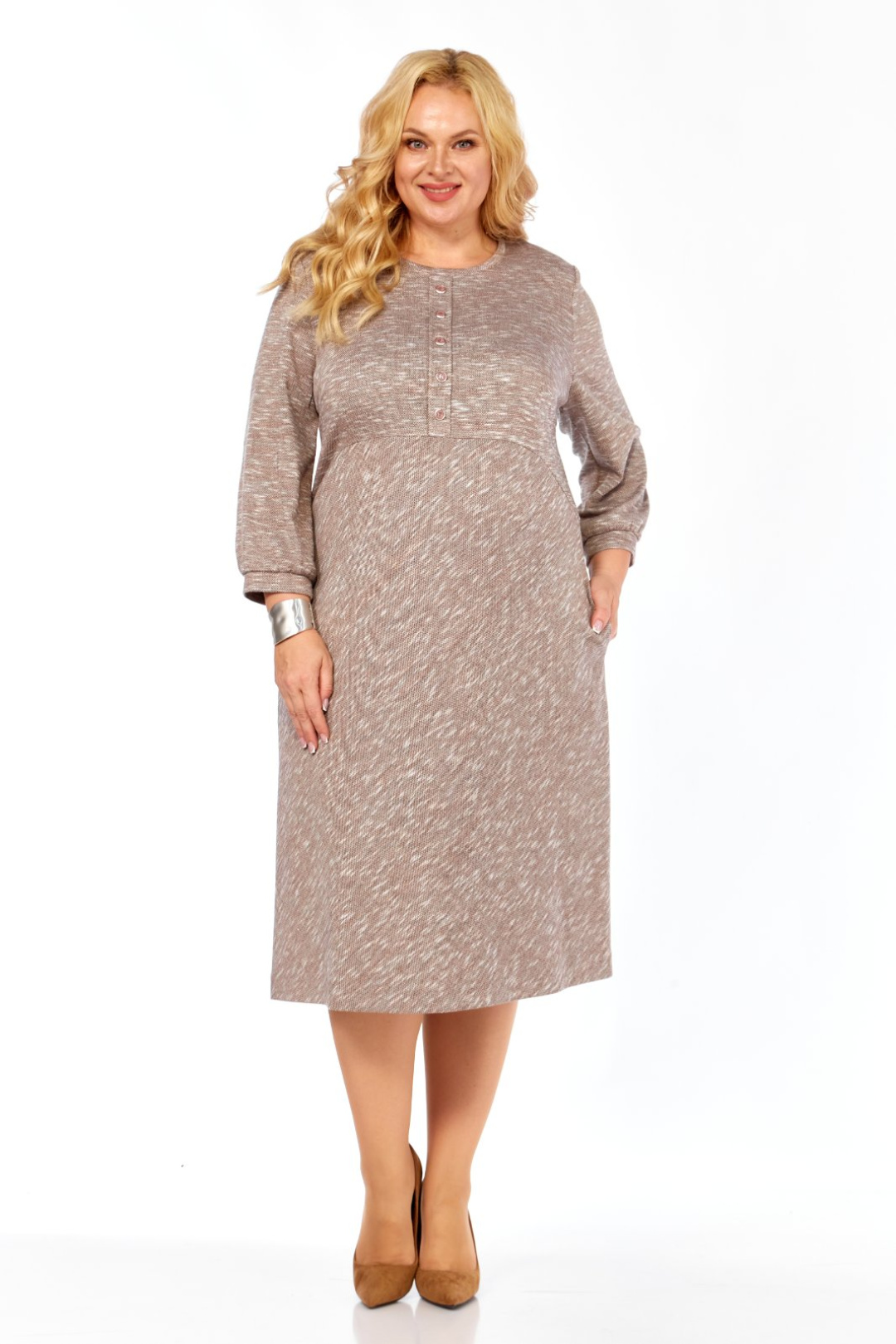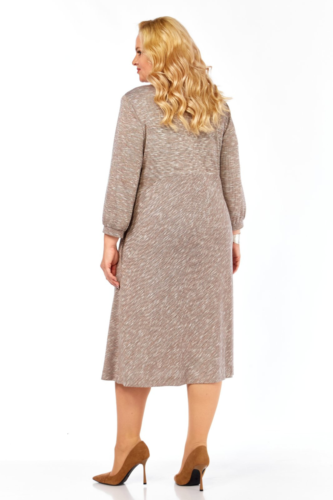 Силуэт полуприлегающий, расклешённый к низу. Рукав втачной, одношовный, с манжетой. Внизу рукава выполнена сборка. Длина рукава 51 см. Горловина круглая, оформлена отрезной бейкой. По линии талии спереди и сзади выполнены фигурные подрезы. Перед с нагрудными вытачками и настрочной планкой, декорированной пуговицами. В боковых швах платья на уровне бёдер выполнены потайные карманы. Длина платья 103см.