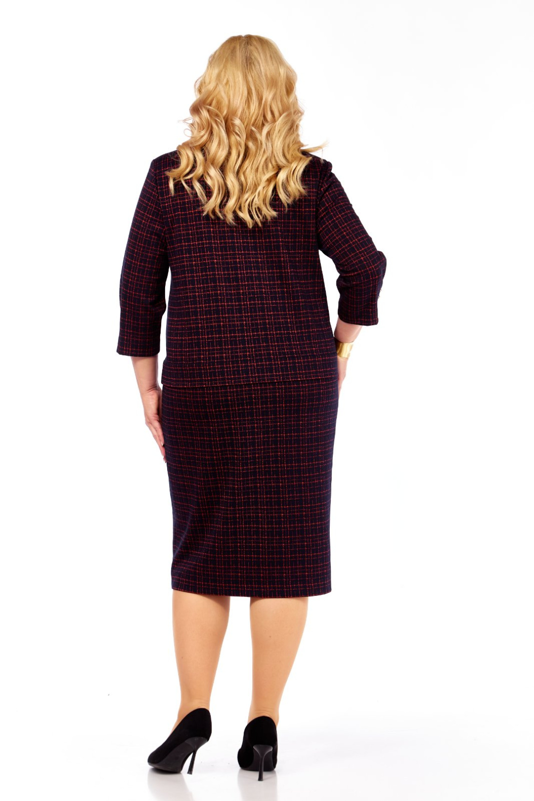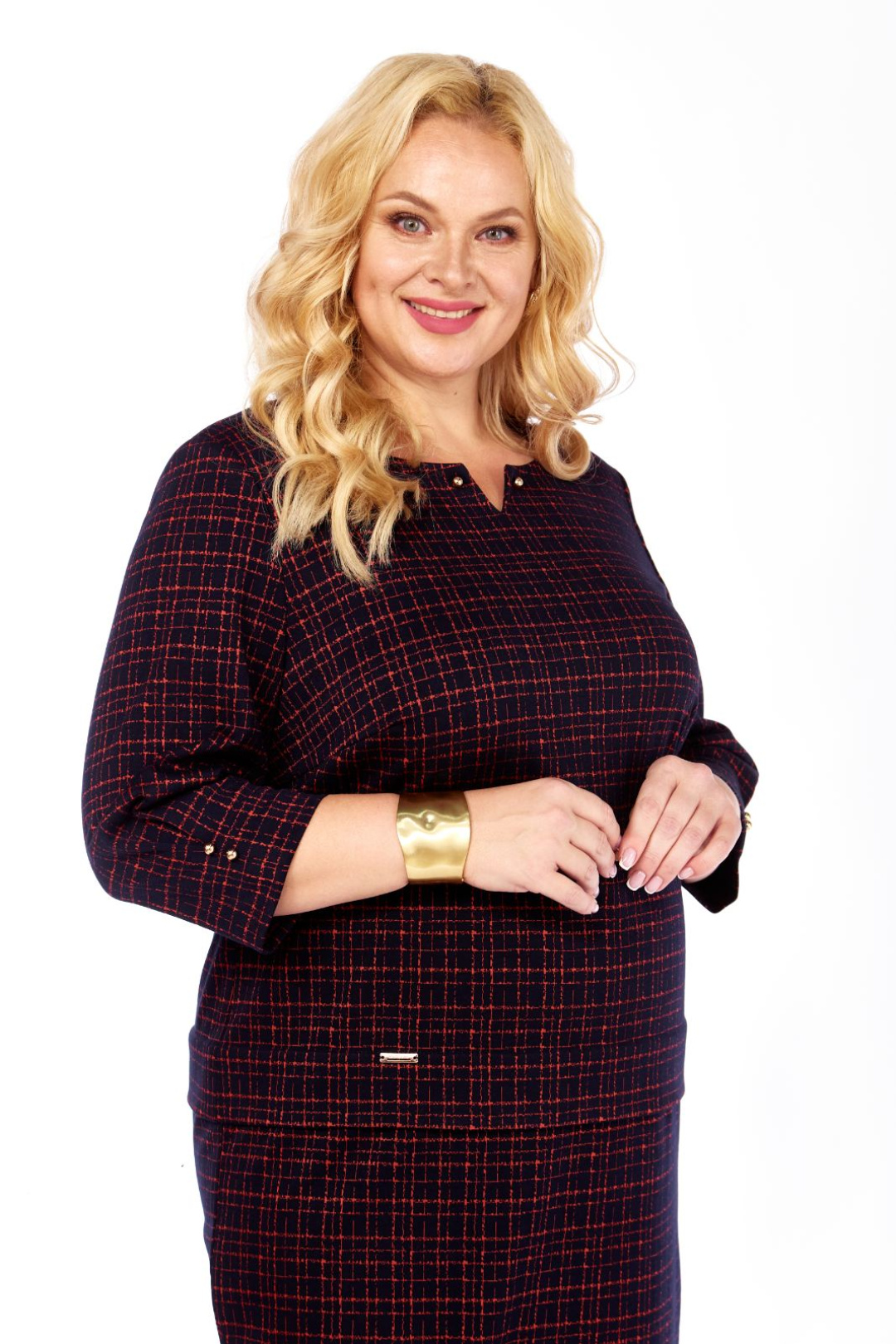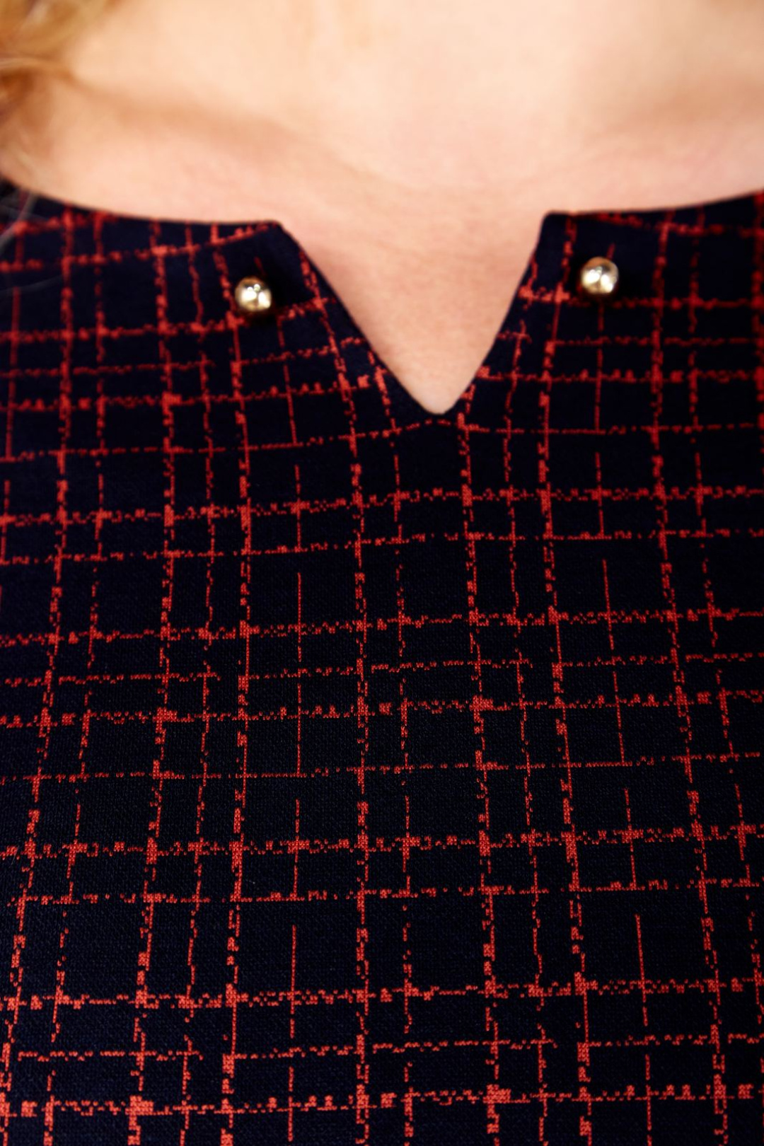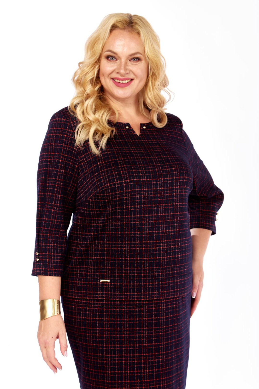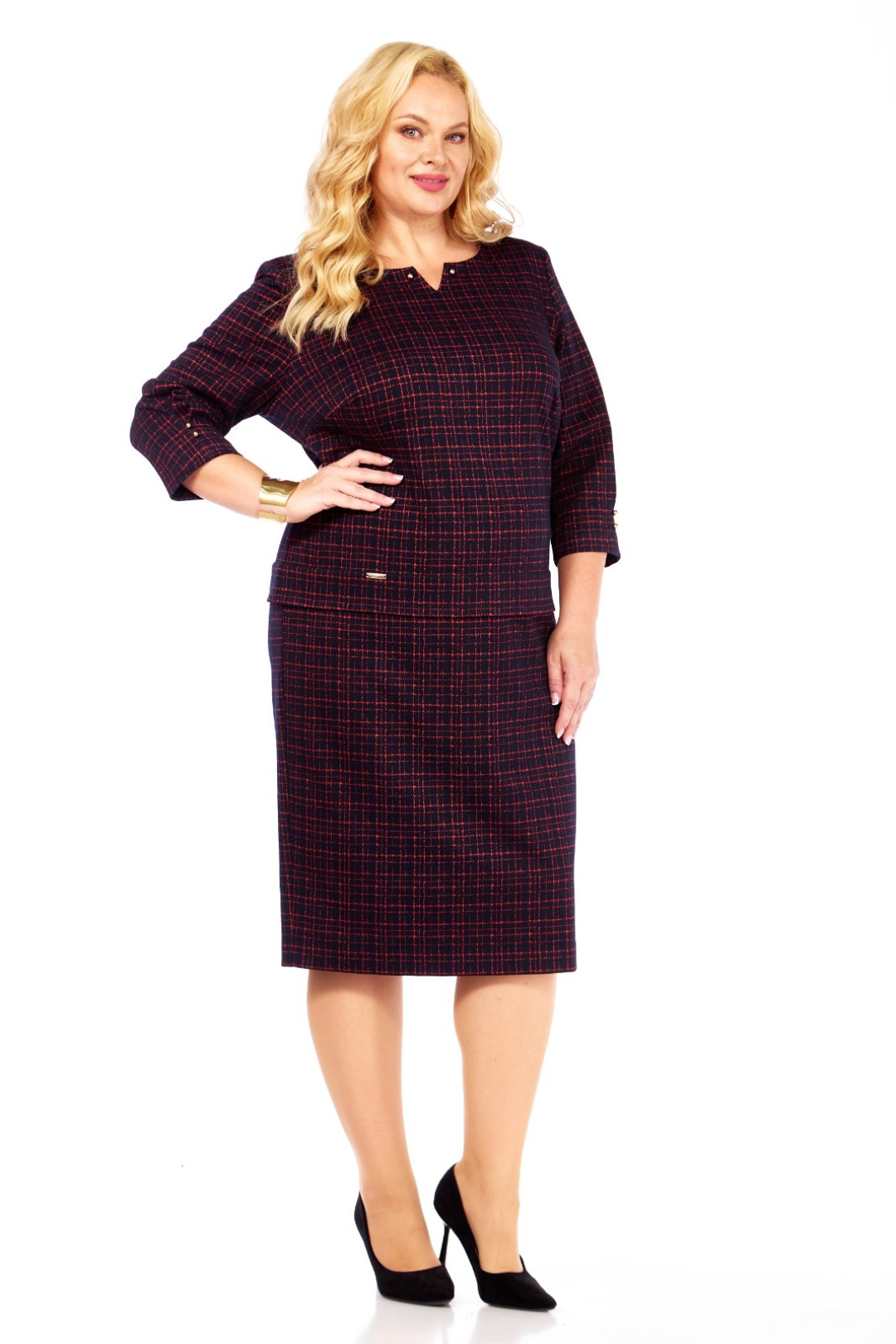 Силуэт полуприлегающий. Рукава втачные, одношовные. Внизу рукава застрочена встречная складка, декорированная золотистыми пуговицами. Длина рукава 44 см. Горловина закруглённая, с обтачкой. По центру горловины сделан дополнительный вырез V – образной формы, декорированный по уголкам золотистыми пуговицами. Перед с нагрудными вытачками. На платье по линии бёдер застрочена широкая односторонняя складка. Справа на складке пришита декоративная металлическая пластинка. Длина платья по спинке 108 см. Платье выполнено из трикотажного полотна.