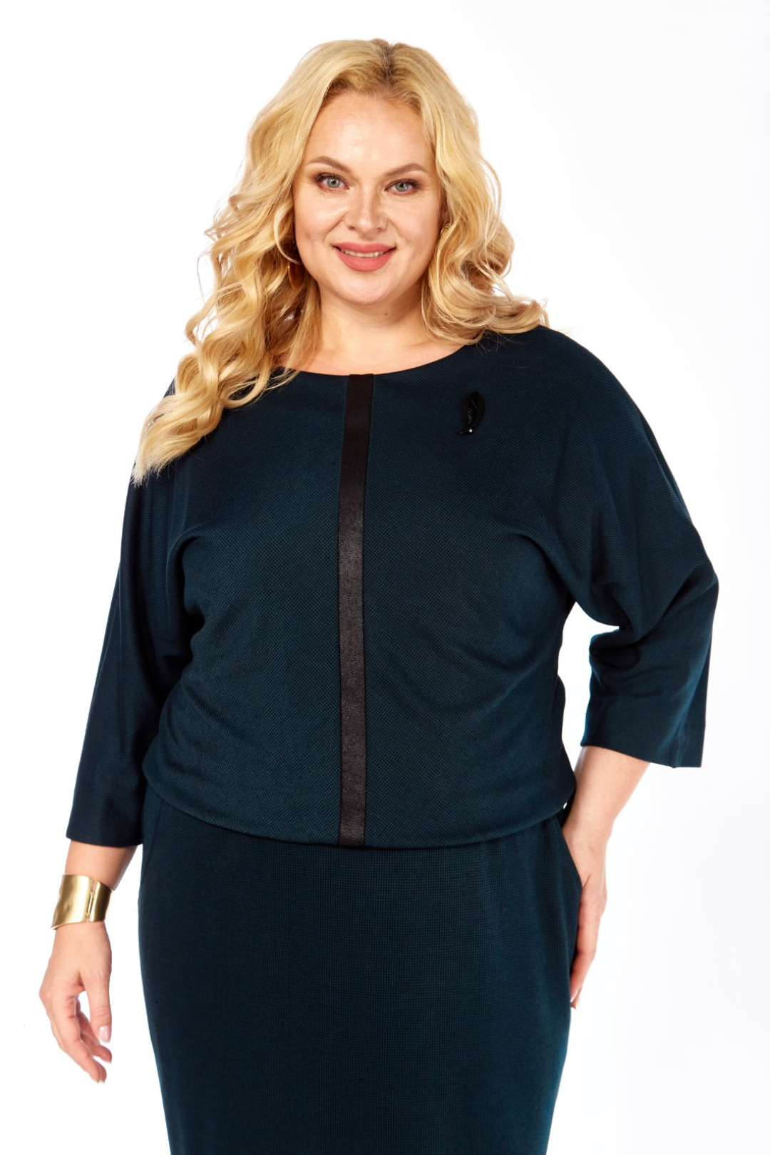 Силуэт полуприлегающий. Рукав цельнокроеный, «летучая мышь». Внизу по центру рукава закреплена встречная складка, дополнительно украшенная пуговицами. Длина рукава от горловины 55см. Горловина закруглённая, на обтачке. По линии талии платье отрезное. По подрезу выполнена сборка на резинку. Верхняя часть платья на подкладке, фиксирующей напуск. Перед декорирован контрастной планкой. По бокам нижней части переда выполнены карманы с косой линией входа. Внизу по боковым швам платье с разрезами. Длина платья 122 см. Платье выполнено из трикотажного полотна.