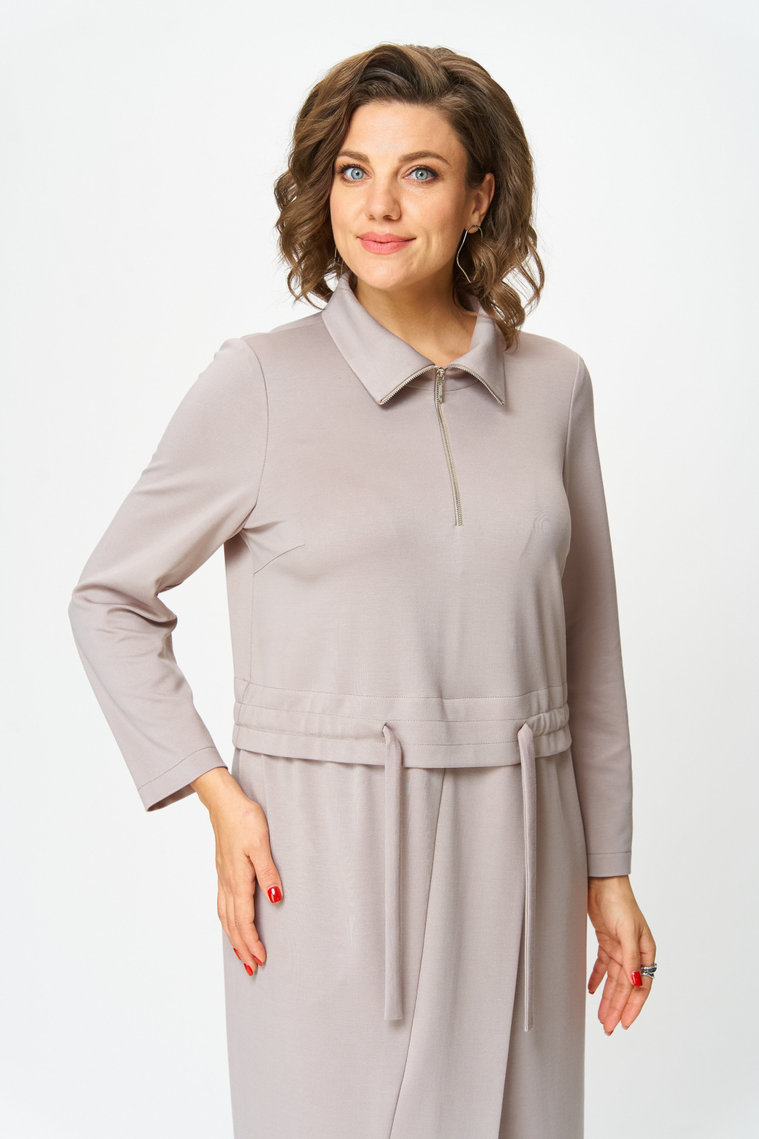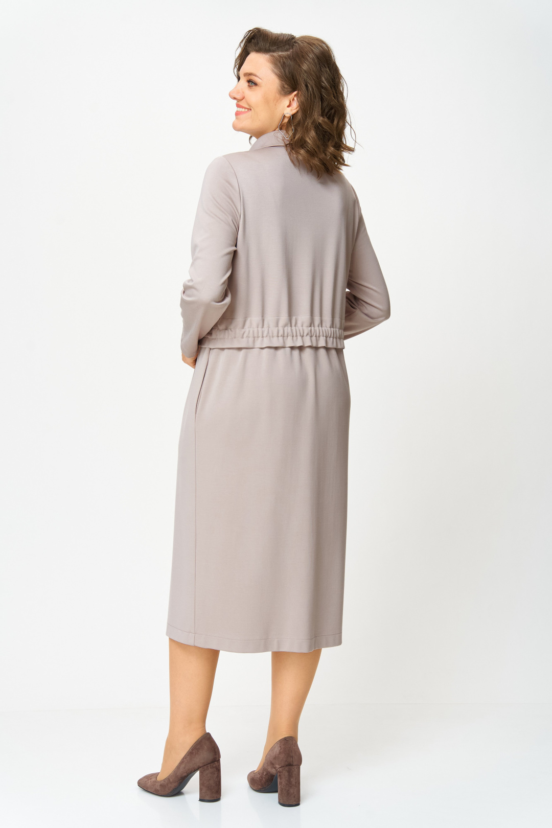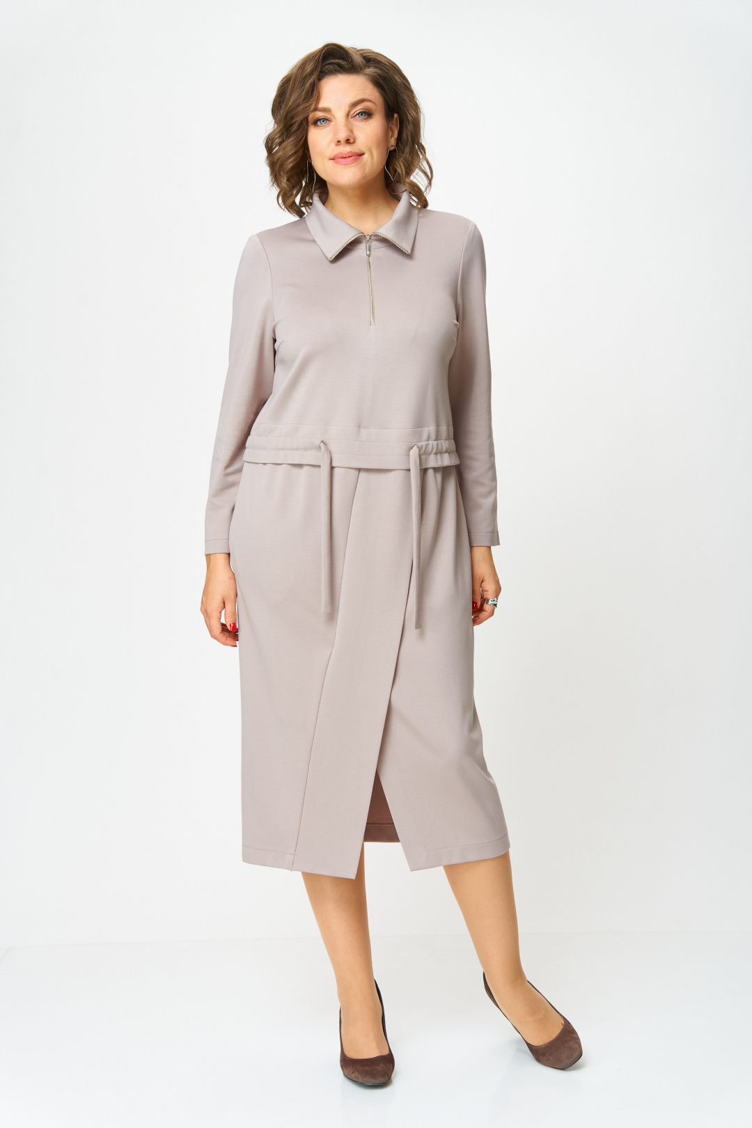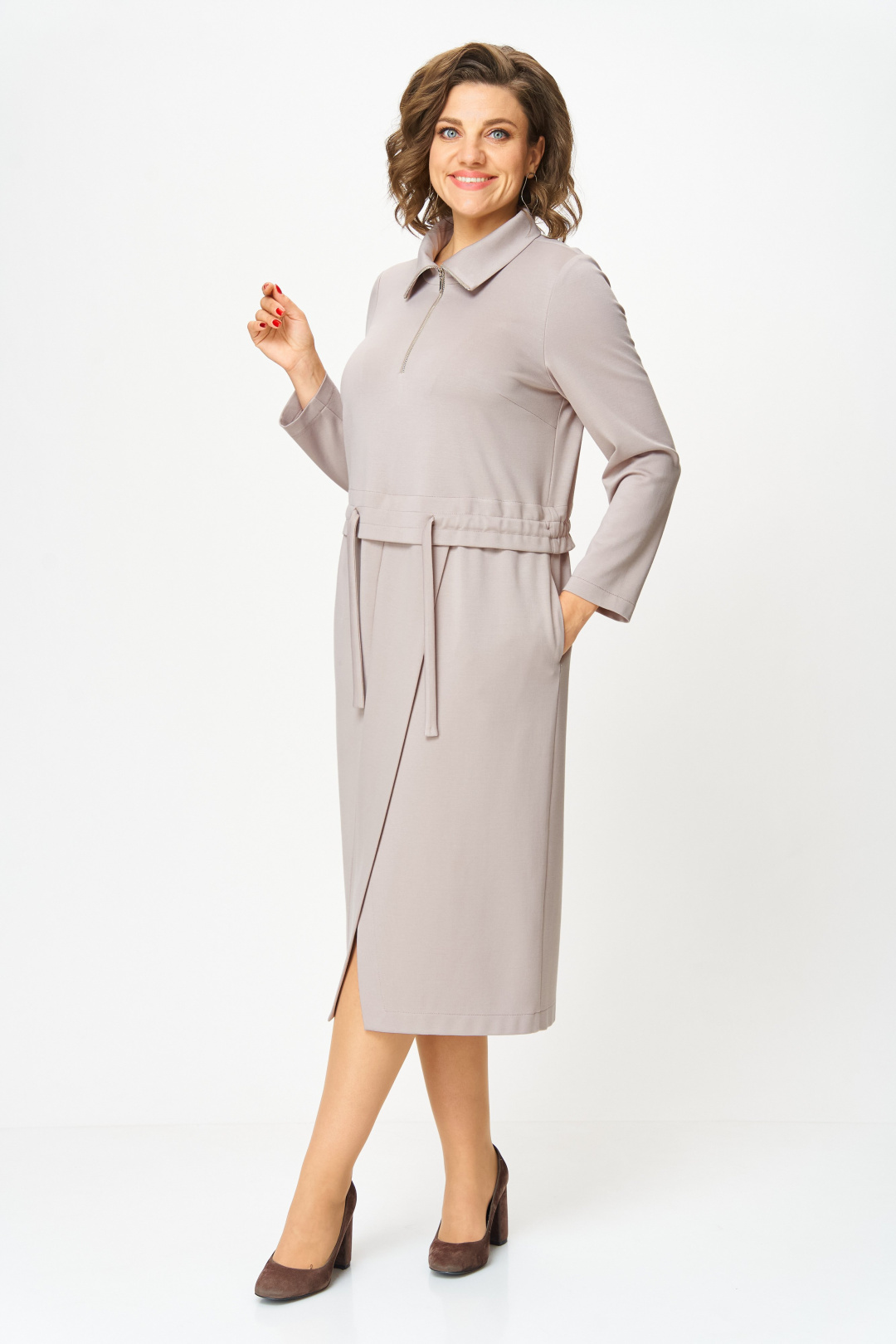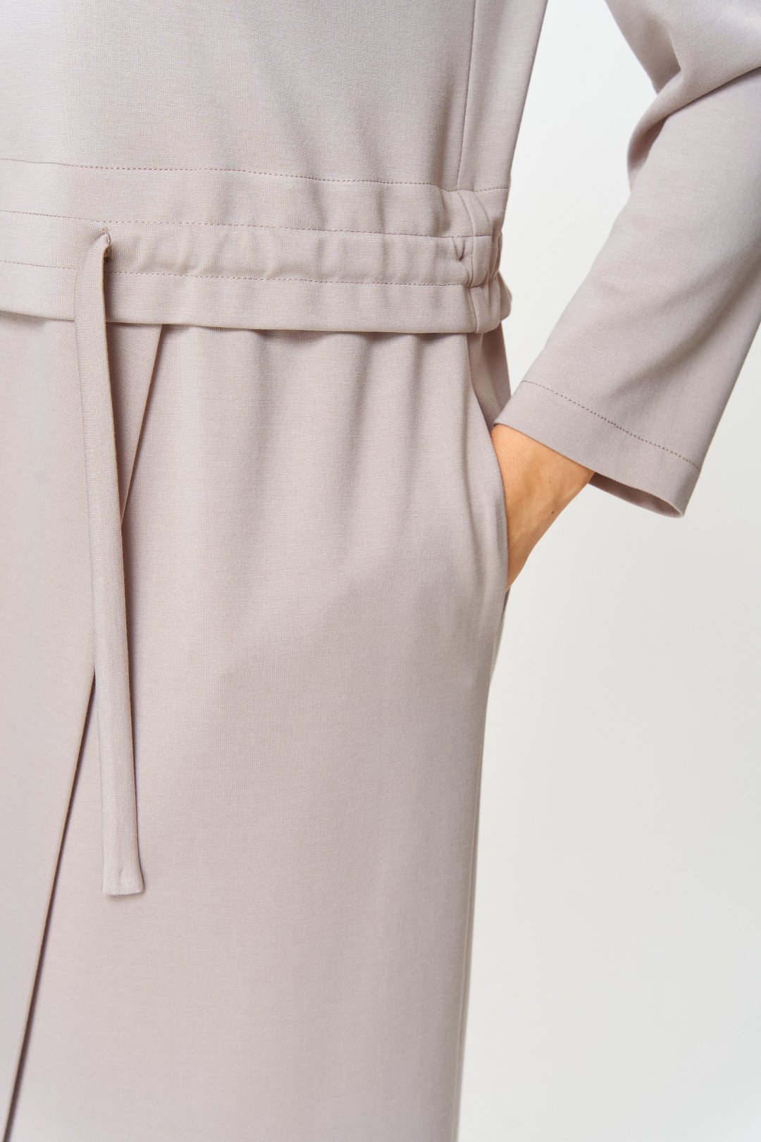 Платье женское прямого силуэта, выполнено из трикотажного полотна, без подкладки, с карманами в боковых швах. Платье состоит из юбки и лифа, с отлетным низом и кулисой по линии талии, с резинкой и поясом завязкой для регулирования объема. Лиф и юбка спинки цельнокроеные. Лиф переда с нагрудными вытачками из бокового шва, юбка переда состоит из двух частей, с отлетной планкой (шир.12 см) в косом рельефе и разрезом длиной 35см по центру юбки.