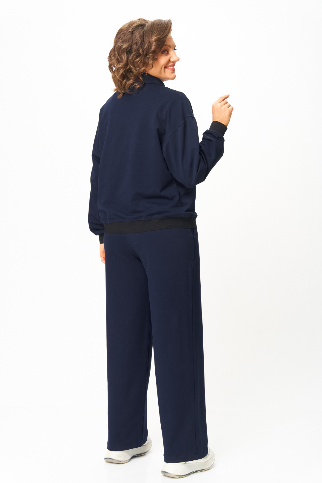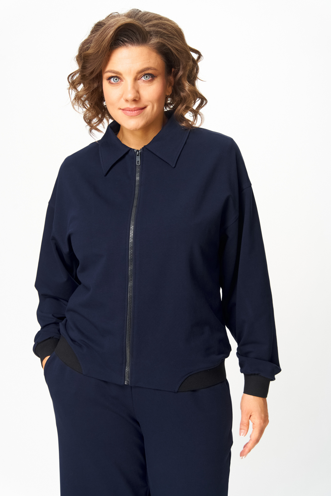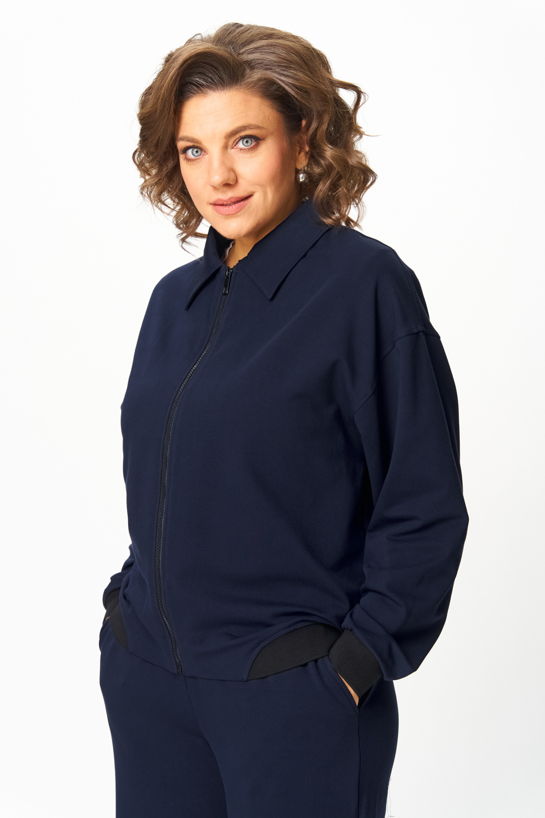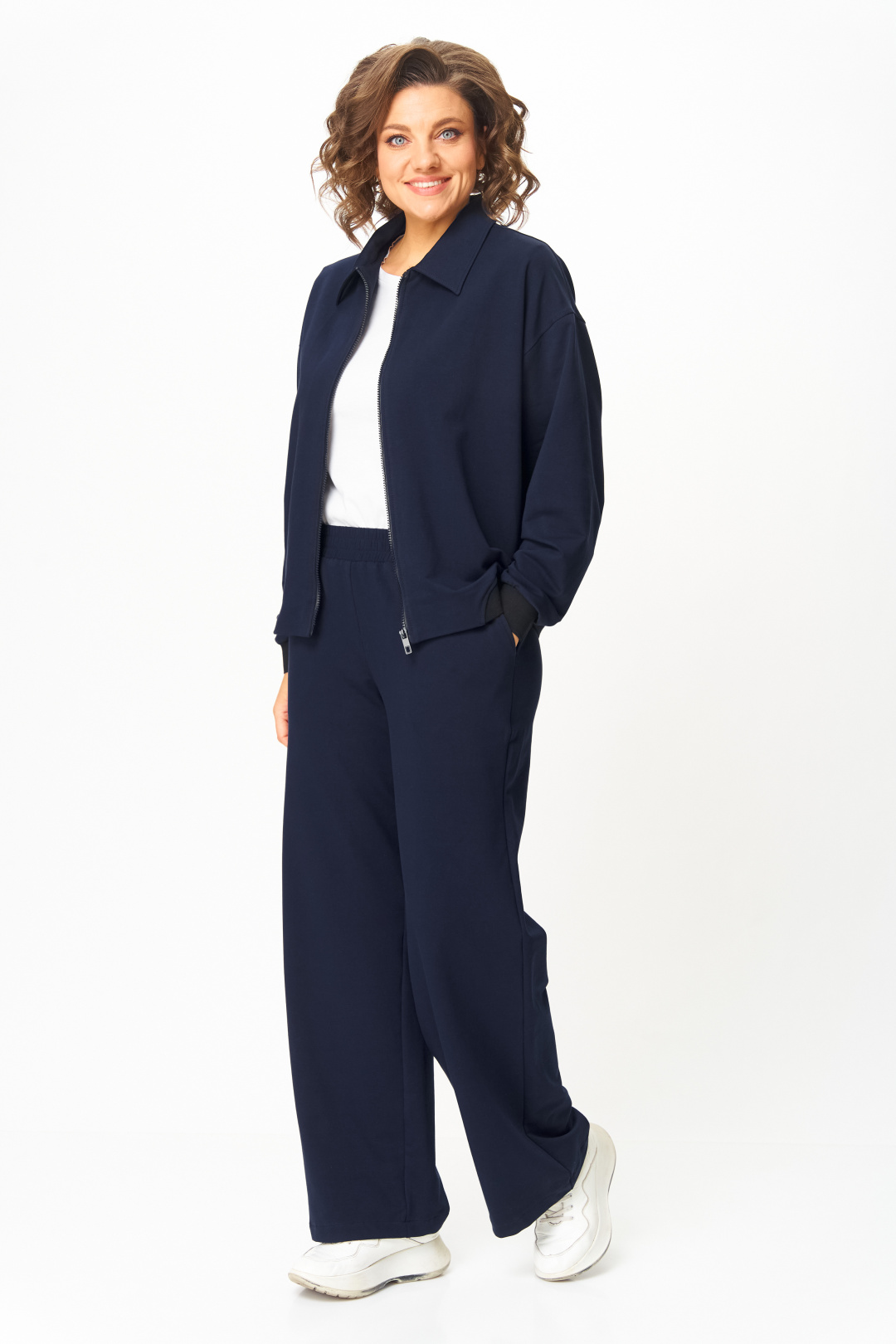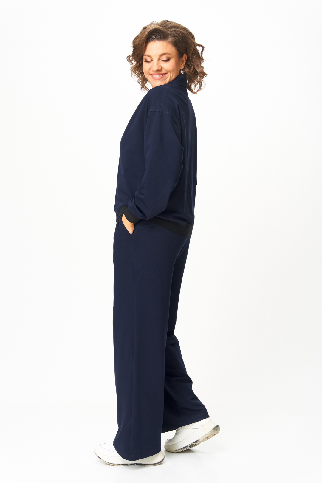 Комплект женский, двухпредметный, состоящий из джемпера и брюк. Свитшот свободного силуэта со спущенным рукавом, с воротником и молнией по переду..Перед и спинка разной длины.По низу свитшота и  низу рукава резинка -довяз. Брюки прямые,свободные ,с наклонными карманами по переду,  пояс притачной по кругу на резинке.