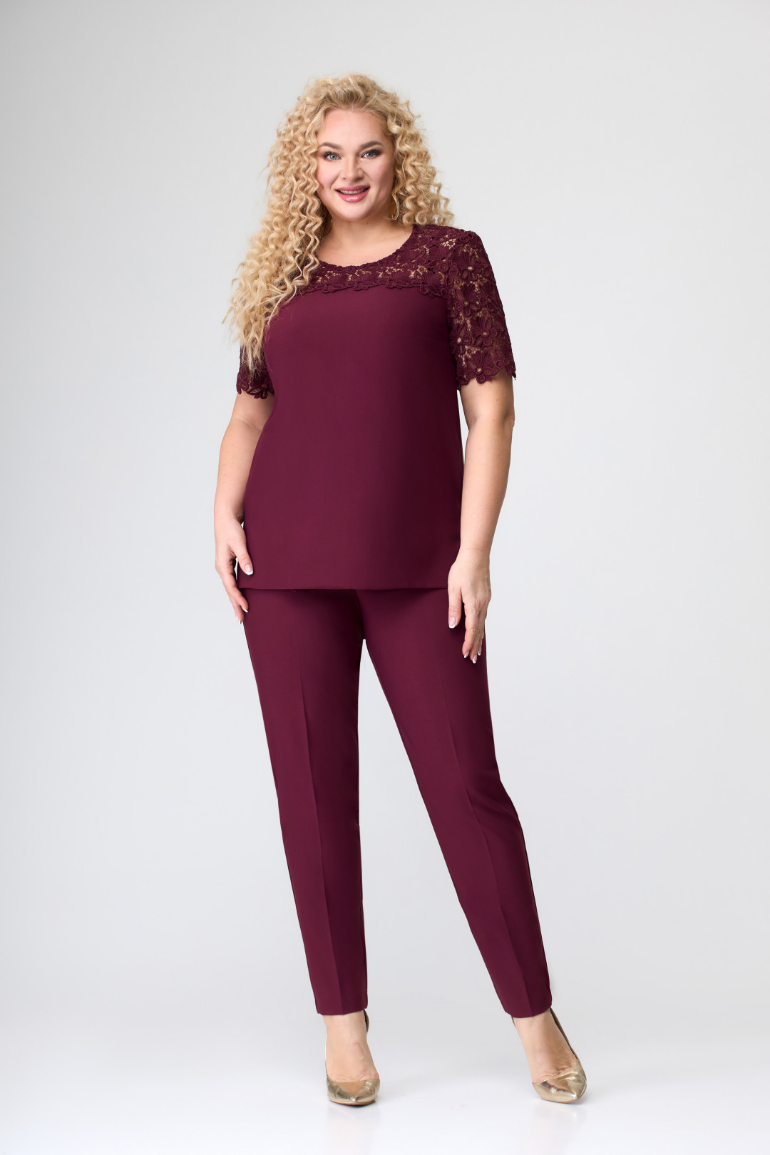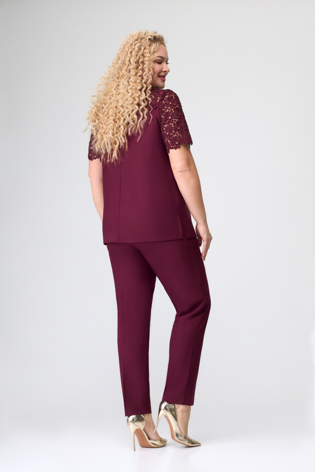 Блузка полуприлегающего силуэта, с втачным рукавом. Перед и спинка с кокетками из кружева.Рукав короткий из кружева. Перед с вытачками по линии груди. Спинка с застежкой по горловине на петлю и пуговицу. В боковых швах разрезы.