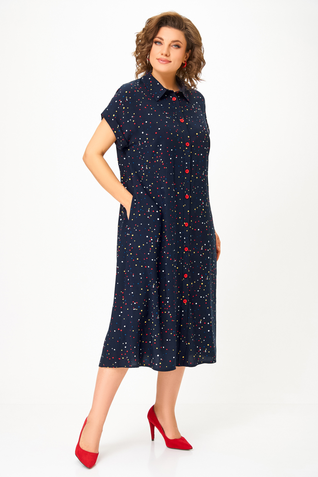 Платье-рубашка из лёгкой вискозной ткани, свободного кроя А-силуэта. Застёжка центральная на петли и декоративные пуговицы. Полочка с нагрудными вытачками, спинка цельная. Воротник рубашечного типа, отложной со стойкой. Пройма спущенная с отложной манжетой. В боковых швах обработаны карманы.