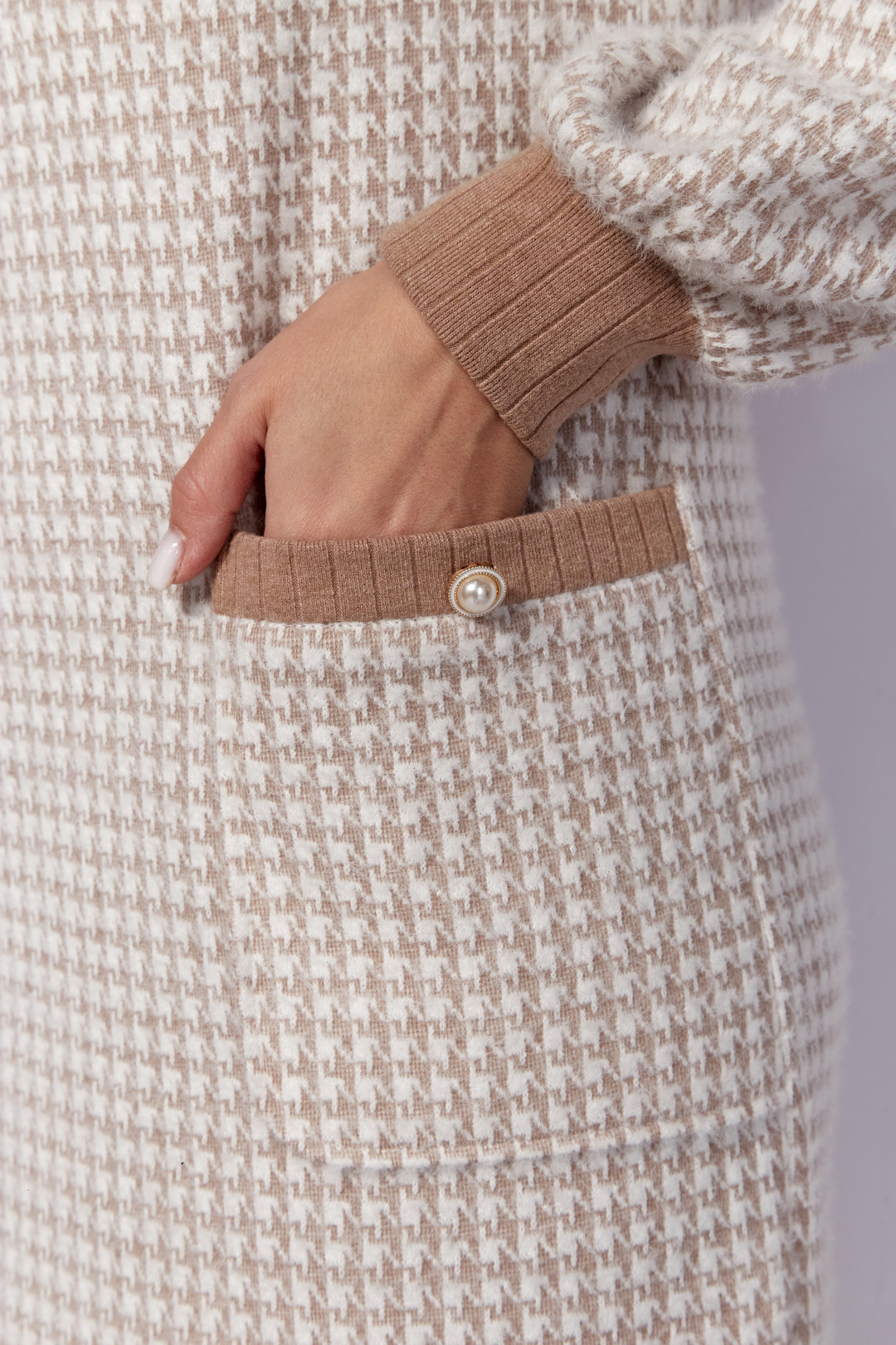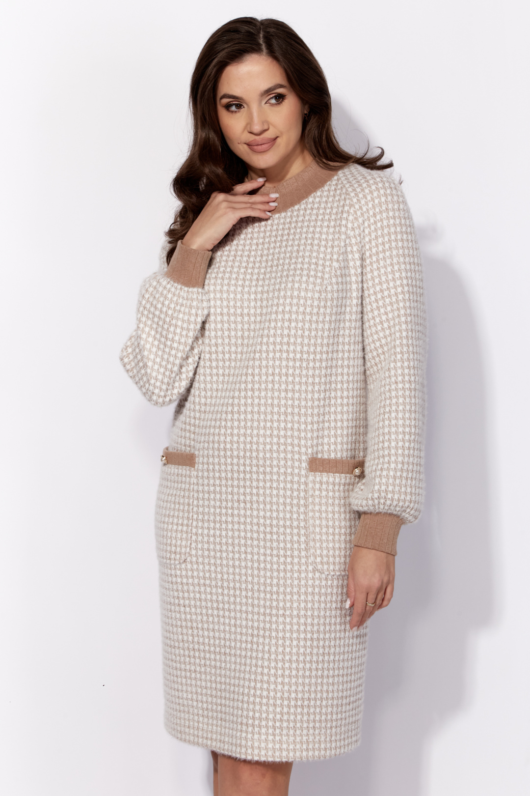 Платье женское, прямого силуэта с длинным рукавом. Рукав покроя реглан, снизу на манжете. По переду нагрудные вытачки и накладные карманы с отделочной нашивкой. Вход в карман акцентирован декоративной пуговицей. Вырез горловины круглой формы, с широкой бейкой. Спинка без особенностей.