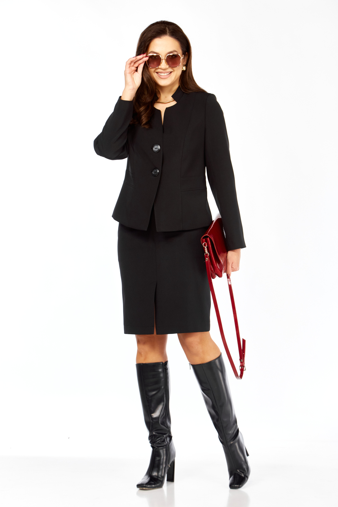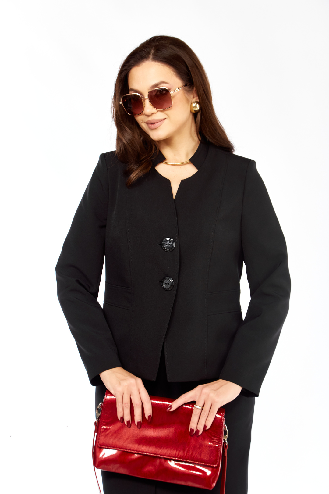 Красивый , элегантный женский комплект , состоит из жакета и юбки . Жакет очень интересного дизайна , с воротничком стойка , с интересным вырезом спереди , на двух пуговицах. Жакет полностью на подкладке , с длинным рукавом. Длина жакета по спинке от плеча -57,5 см , длина рукава- 61,5 см. Юбка слегка заужена книзу ,спереди шлица, пояс по бакам на резинке , сбоку юбки функциональные карманы. Длина юбки -60 см