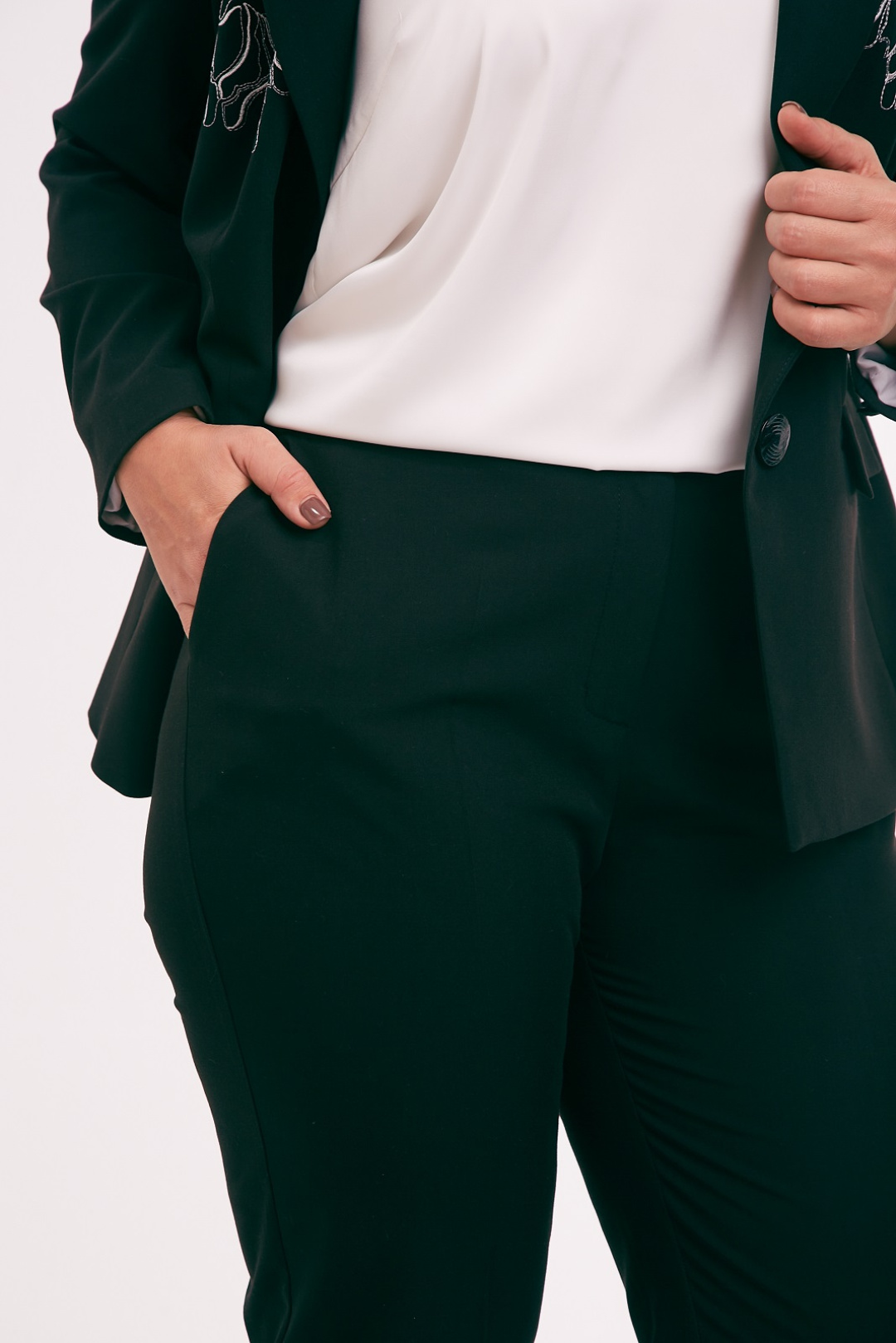 Жакет из костюмной ткани на подкладке, полуприлегающего силуэта, с отложным воротником и лацканами, с центральной бортовой застежкой на петли и пуговицы. Перед с талиевыми вытачками, прорезными карманами с клапаном и вышивкой в области груди. Спинка со средним и рельефными швами. Рукав втачной двухшовный. Воротник отложной пиджачного типа.