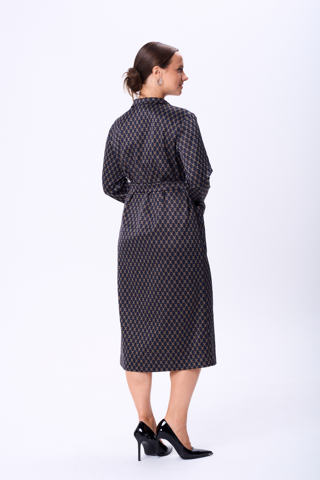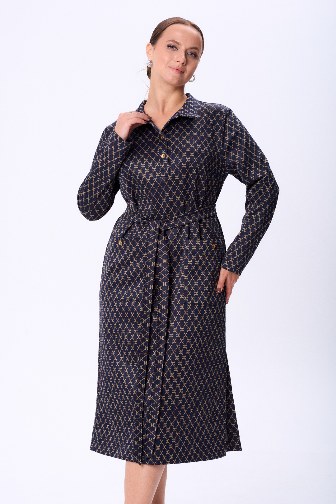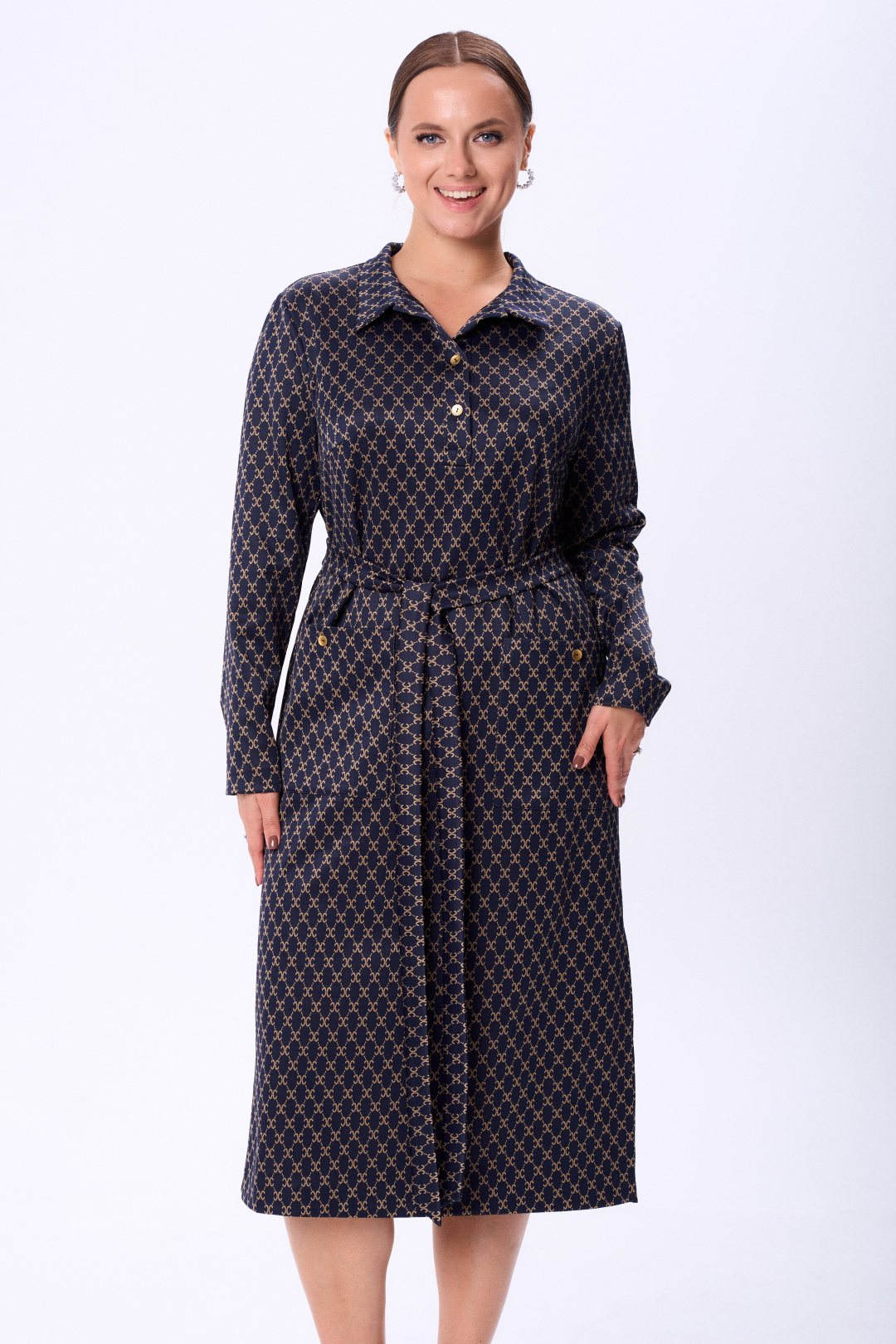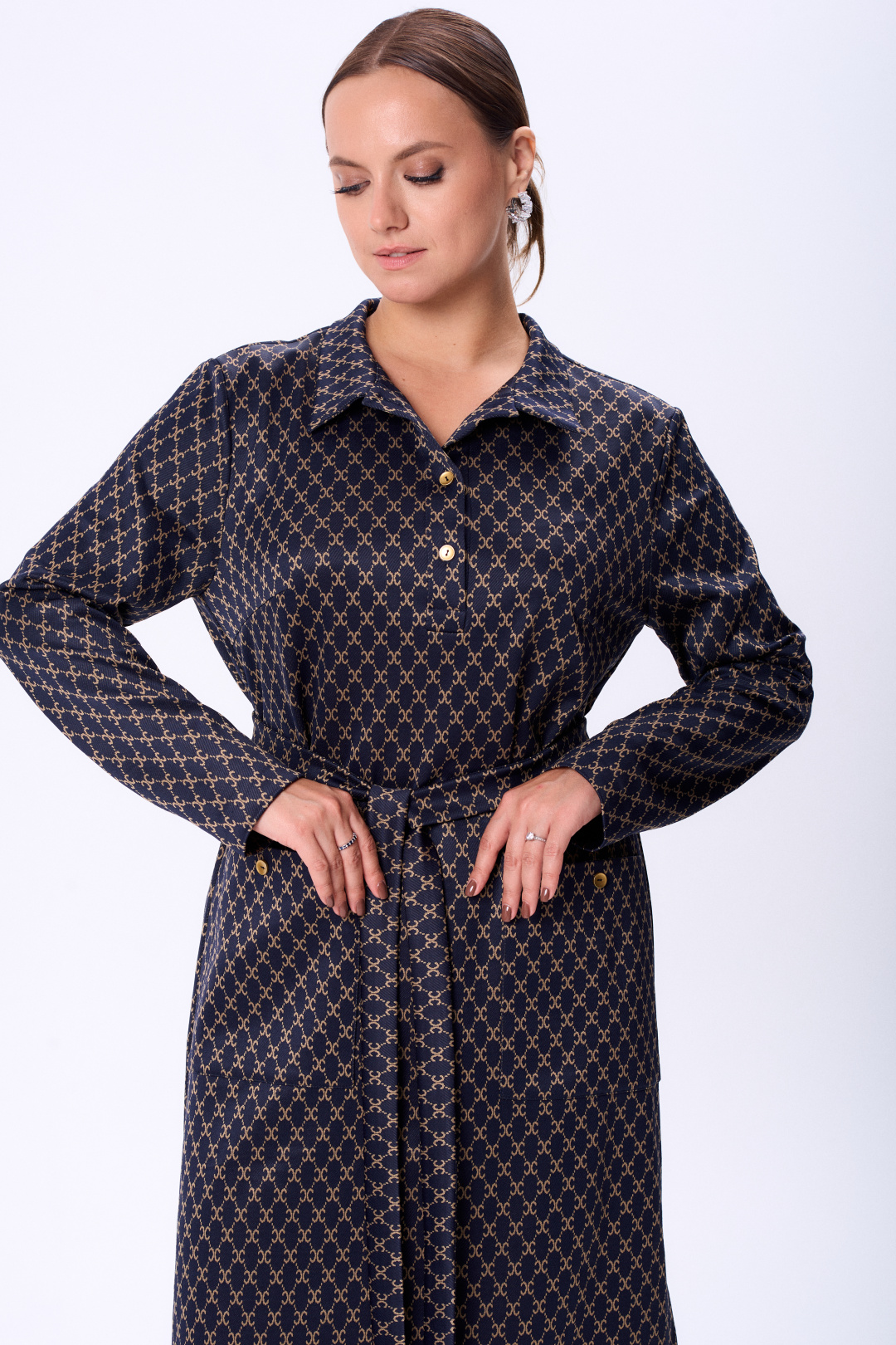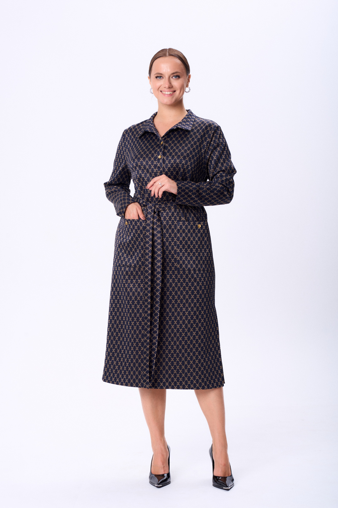 Платье женское прямого силуэта из трикотажного полотна. По переду центральная застежка на петли и пуговицы с воротником в стиле поло, нагрудные вытачки от бокового шва, на уровне линии бедер накладные карманы. Спинка цельная. Рукав одношовный длинный втачного покроя. В боков шве слева разрез. В комплекте сьемный мягкий пояс из основной ткани.